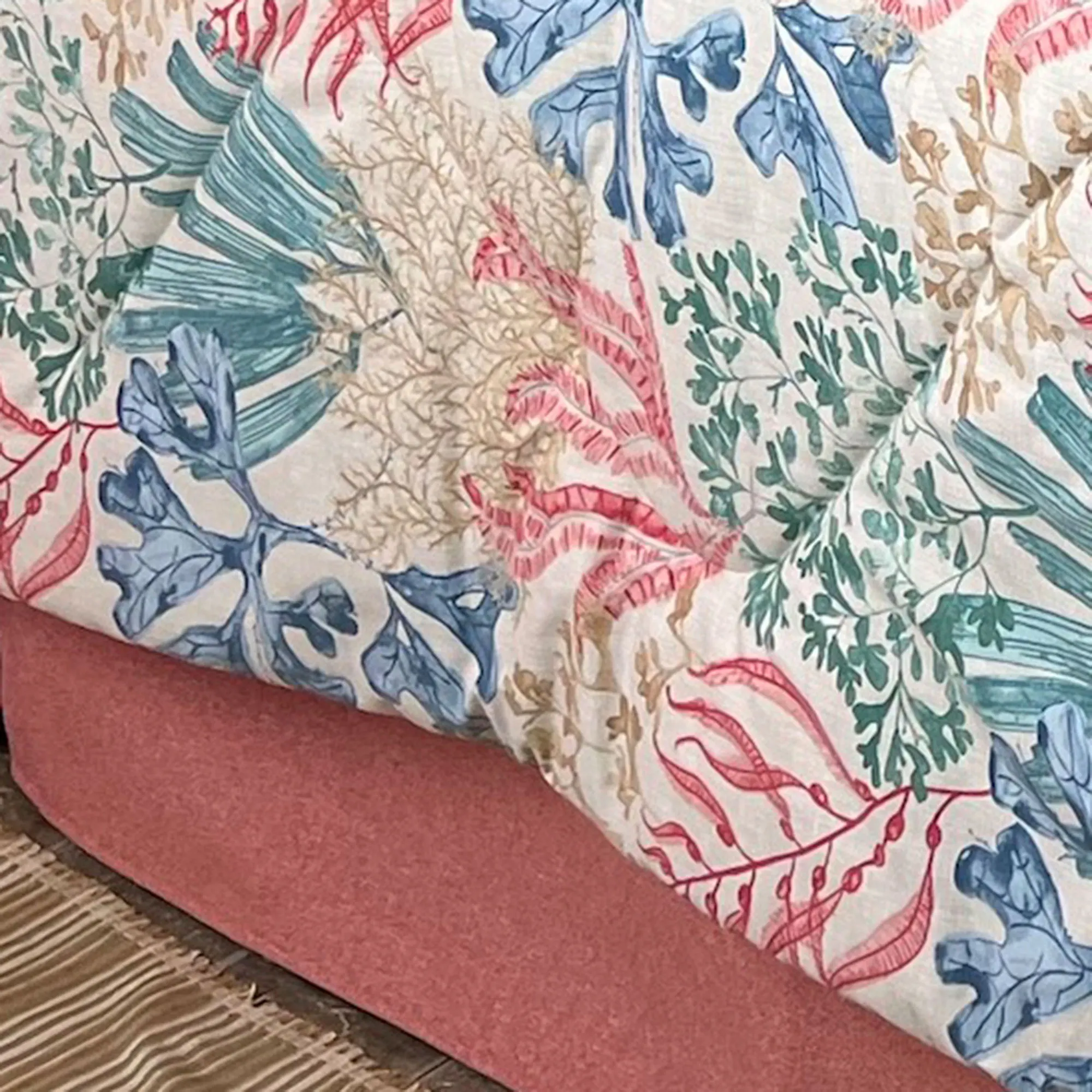 • Coastal comforter features coral and seaweed designs