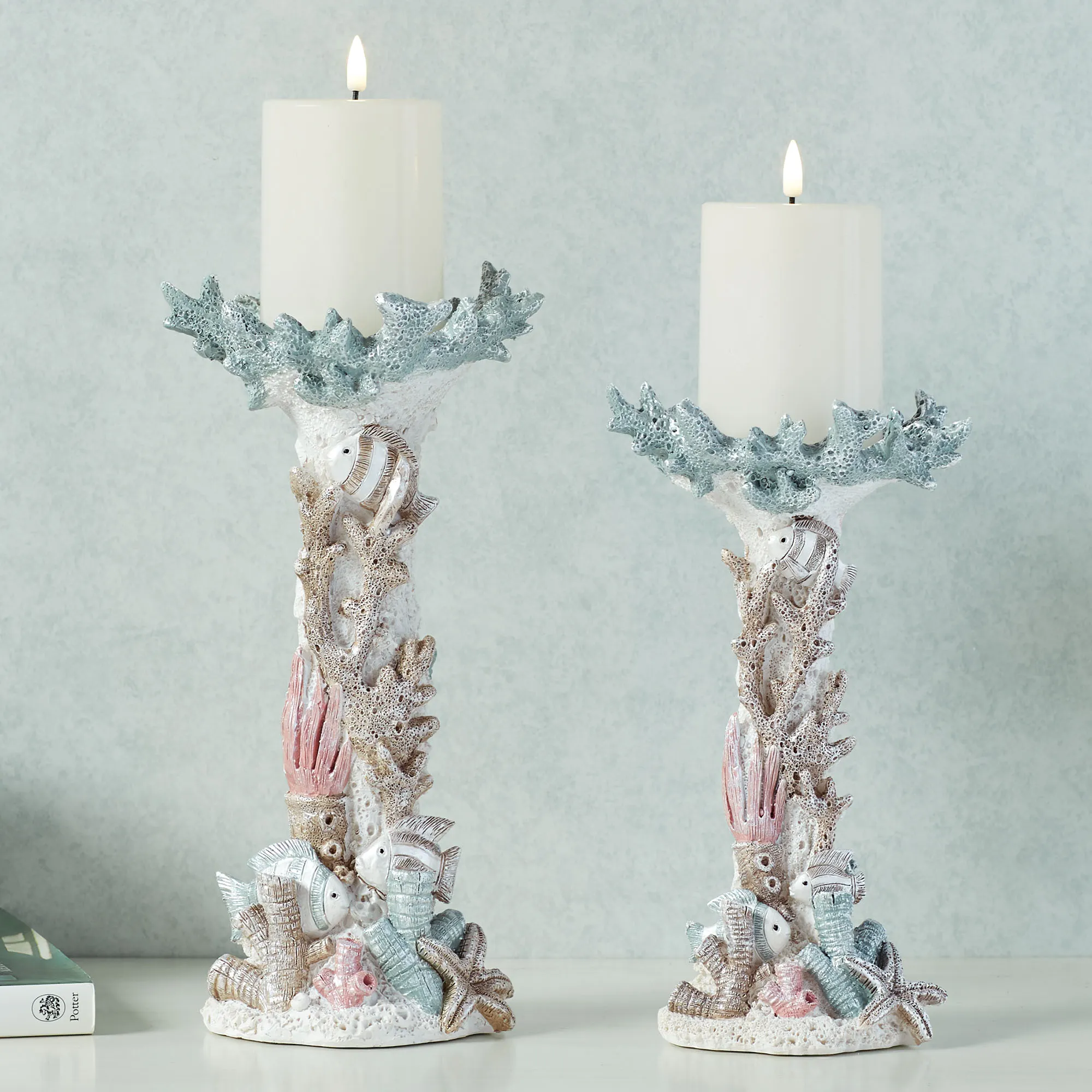 Coral Shimmers among tropical fish, starfish, and sea plants. This charming, ocean-inspired candleholder set is made of resin and features sealife in shades of light cream, beige, tan, pastel pink, aqua blue, and ivory. Each candleholder will hold one 3" dia. pillar candle, not included. Small measures 5"dia.x10.5"H; large measures 6"dia.x12"H.