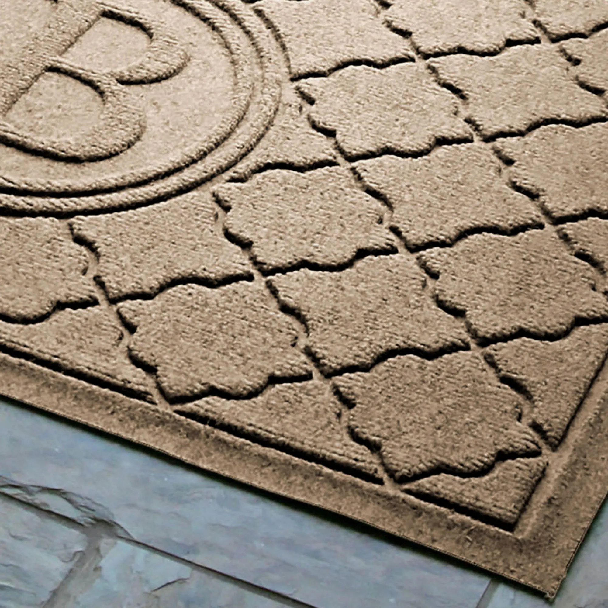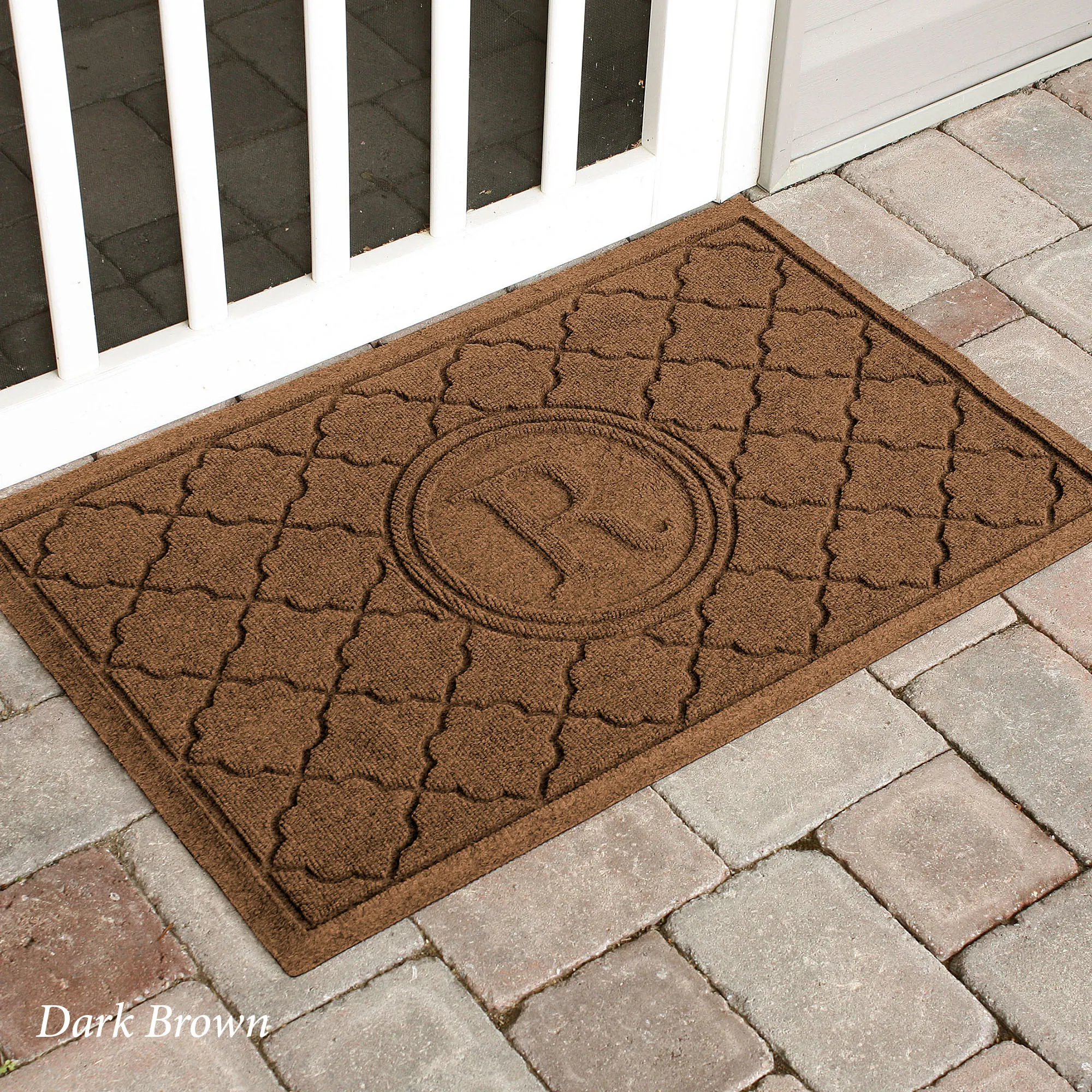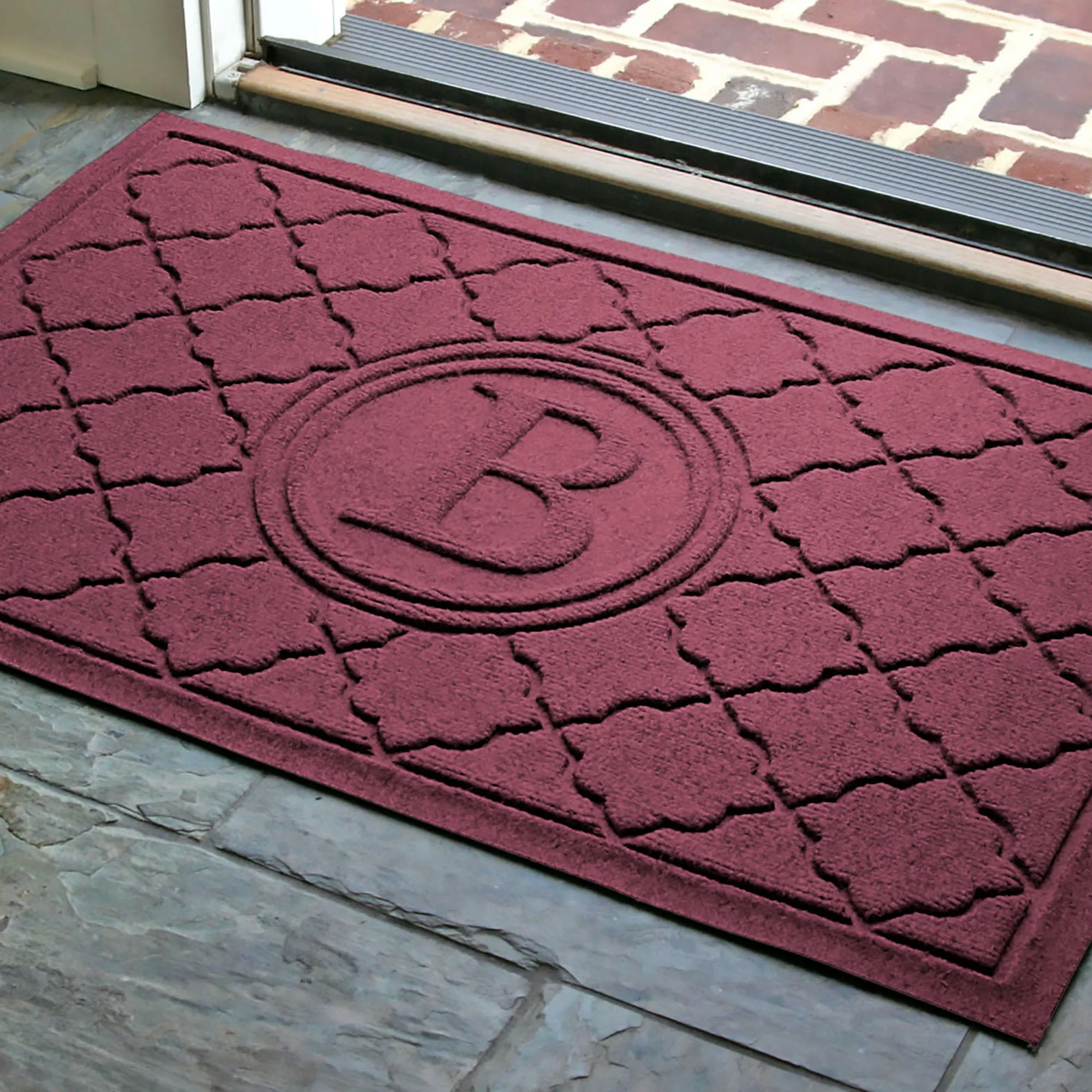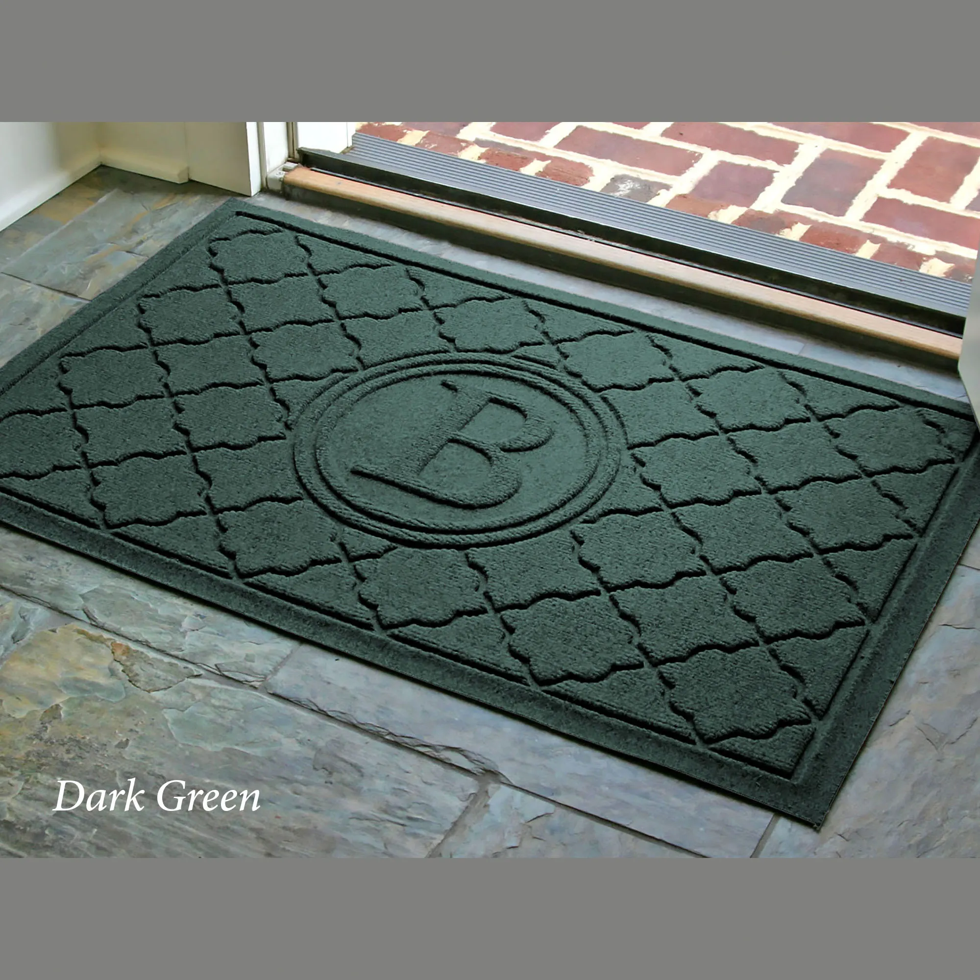 The Cordova Indoor/Outdoor Monogram Doormat will spice up your entryway with exotic quatrefoils. The antistatic PET polyester fiber floor accent has a nonskid SBR rubber backing that is slip-resistant and certified by the National Floor Safety Institute. The WaterHog(R) exclusive Water Dam border keeps dirt and water on the mat and not your floor. The premium-grade mat is mildew-, mold-, and rot-resistant. Specify Khaki, Burgundy, Charcoal, Dark Brown, Dark Green, Gray, Navy, or Slate Blue. Monogram doormat features your initial monogram in the center circle emblem. Measures 35"x23". Indoor use or outdoor use year round. Hose off to clean.