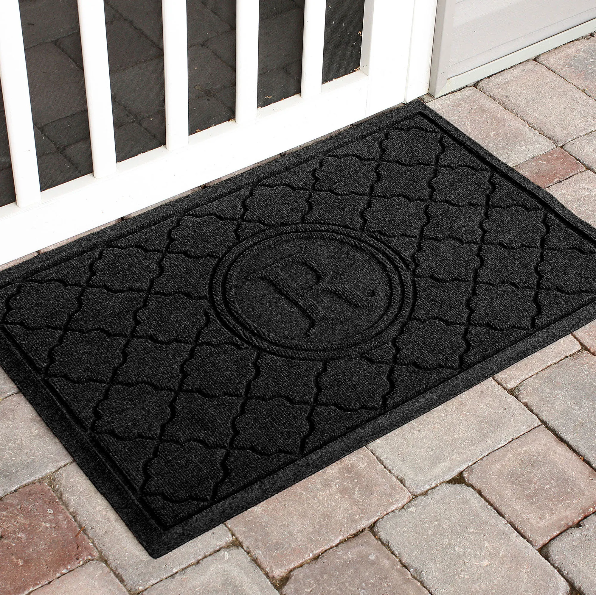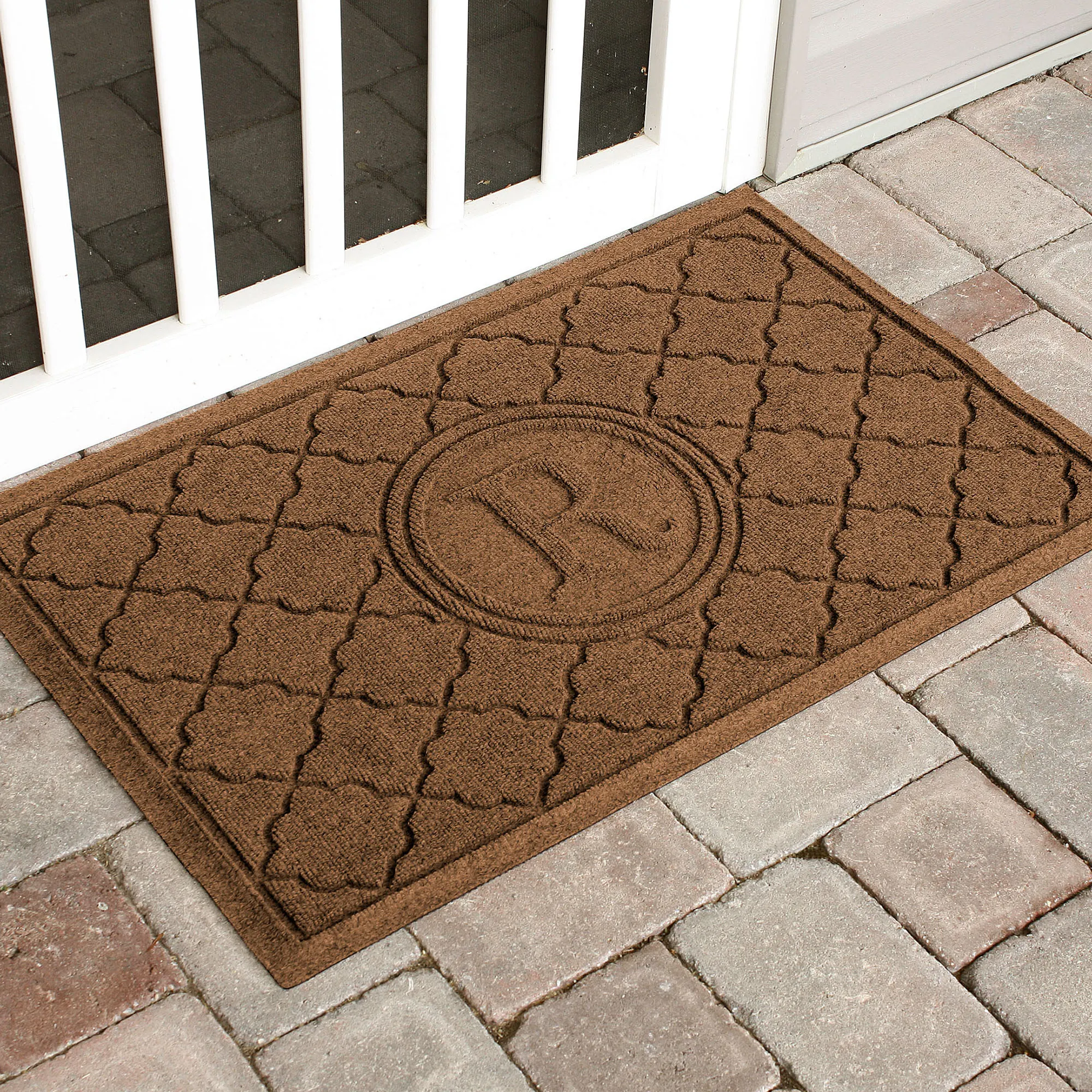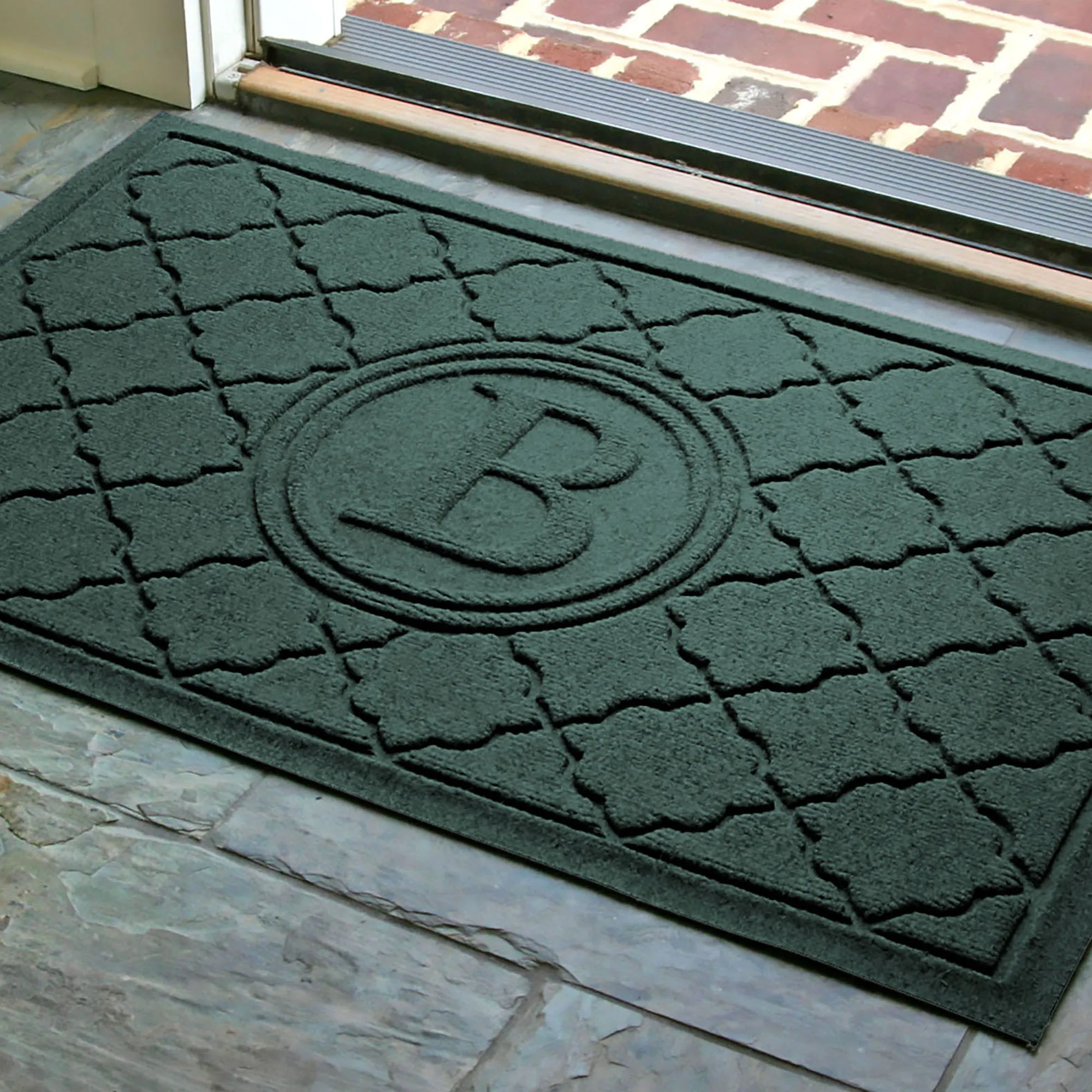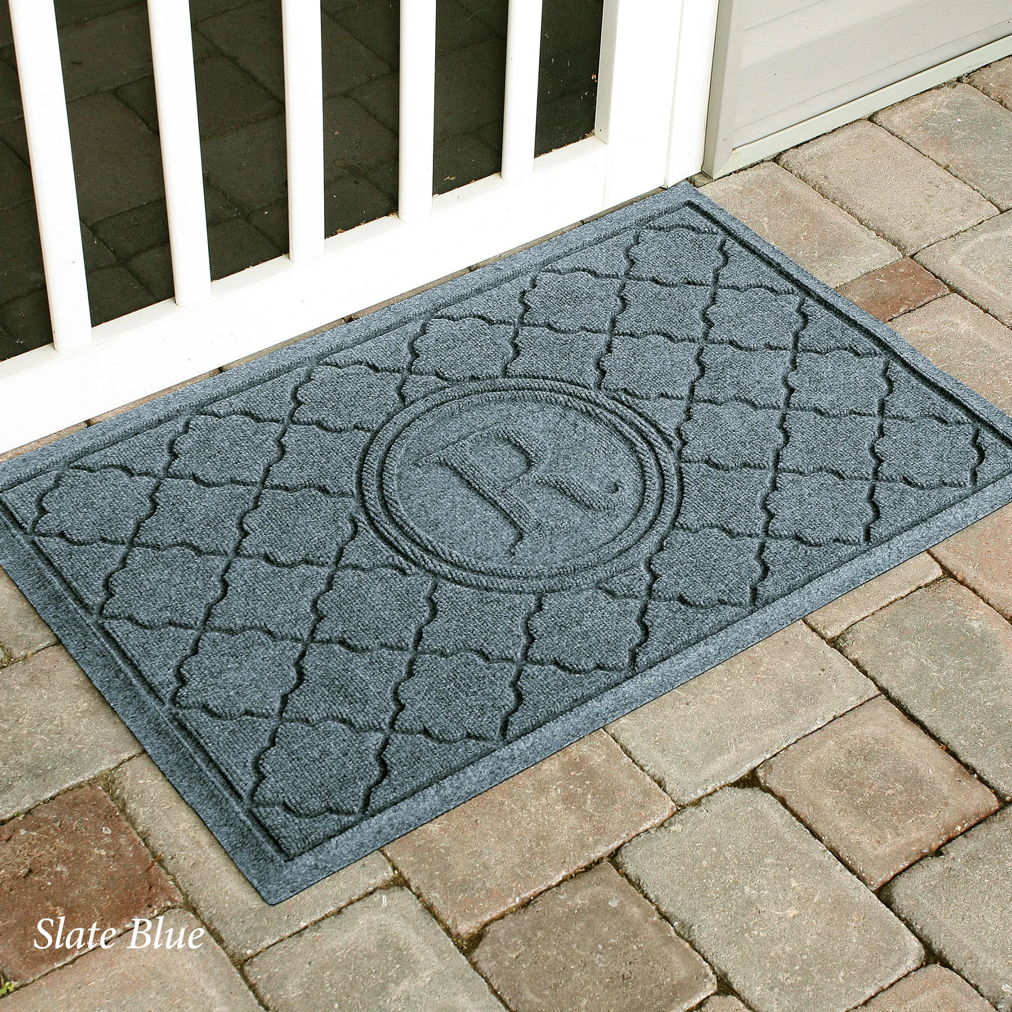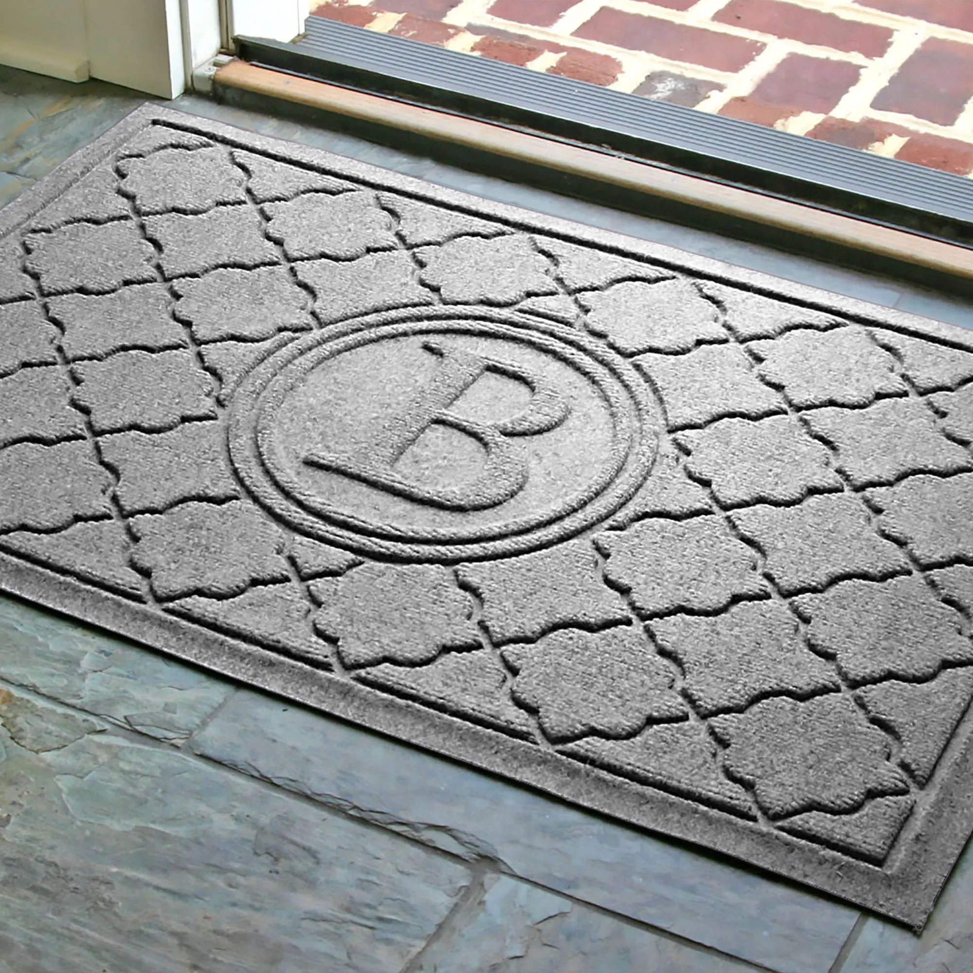 The Cordova Indoor/Outdoor Monogram Doormat will spice up your entryway with exotic quatrefoils. The antistatic PET polyester fiber floor accent has a nonskid SBR rubber backing that is slip-resistant and certified by the National Floor Safety Institute. The WaterHog(R) exclusive Water Dam border keeps dirt and water on the mat and not your floor. The premium-grade mat is mildew-, mold-, and rot-resistant. Specify Khaki, Burgundy, Charcoal, Dark Brown, Dark Green, Gray, Navy, or Slate Blue. Monogram doormat features your initial monogram in the center circle emblem. Measures 35"x23". Indoor use or outdoor use year round. Hose off to clean.