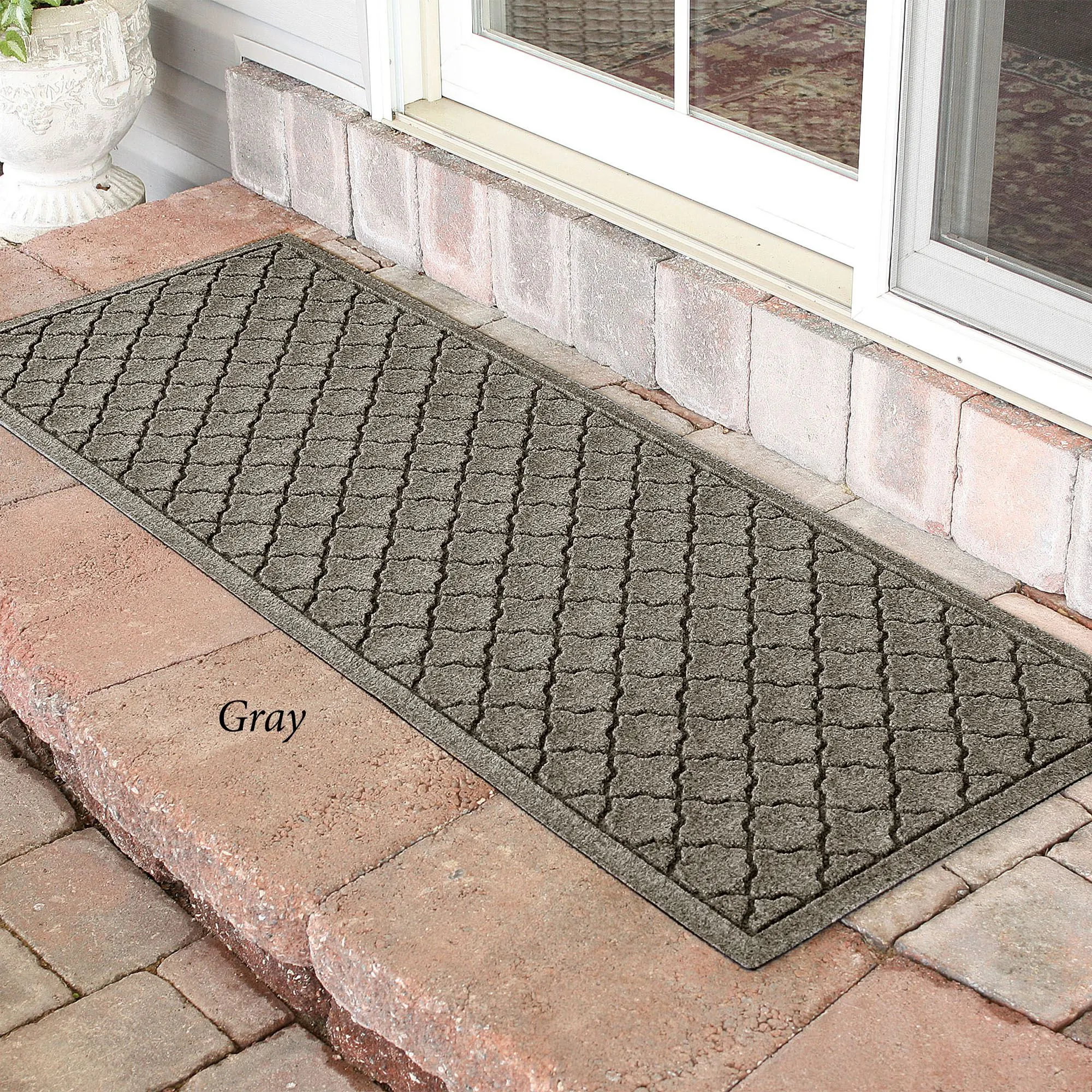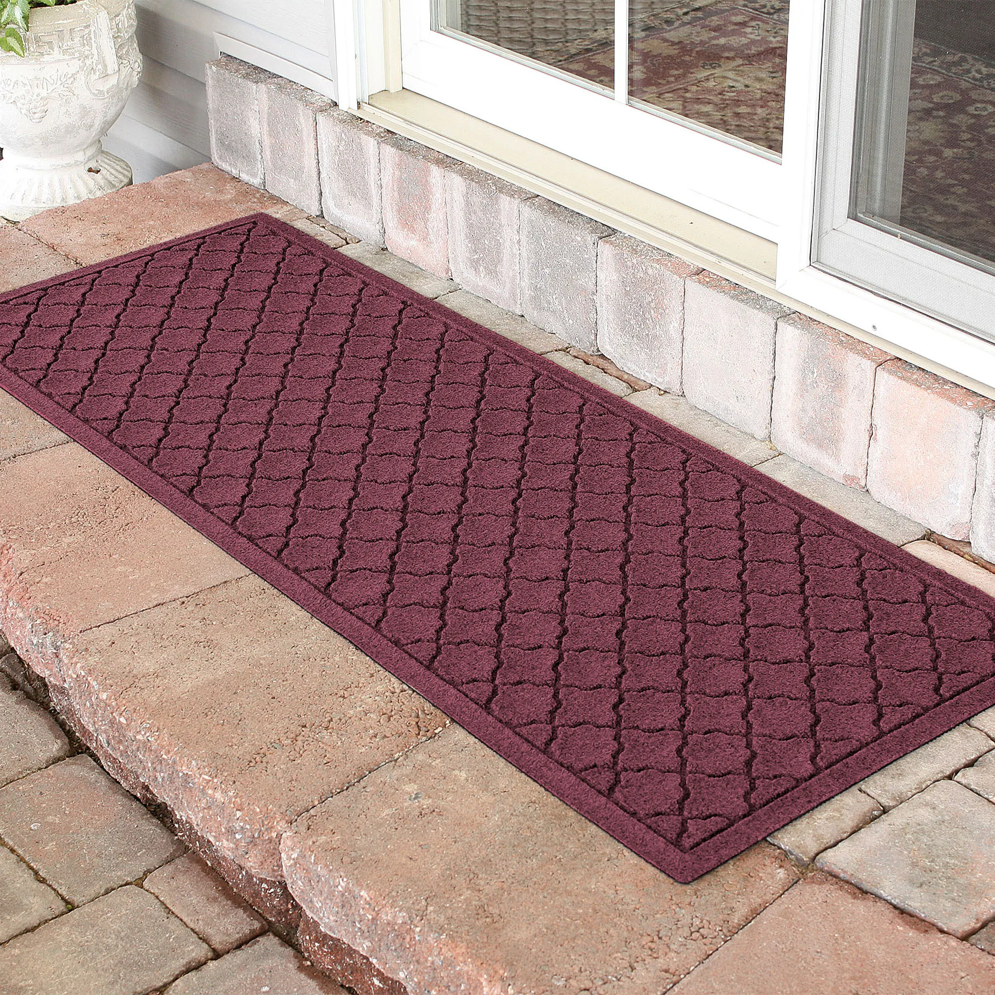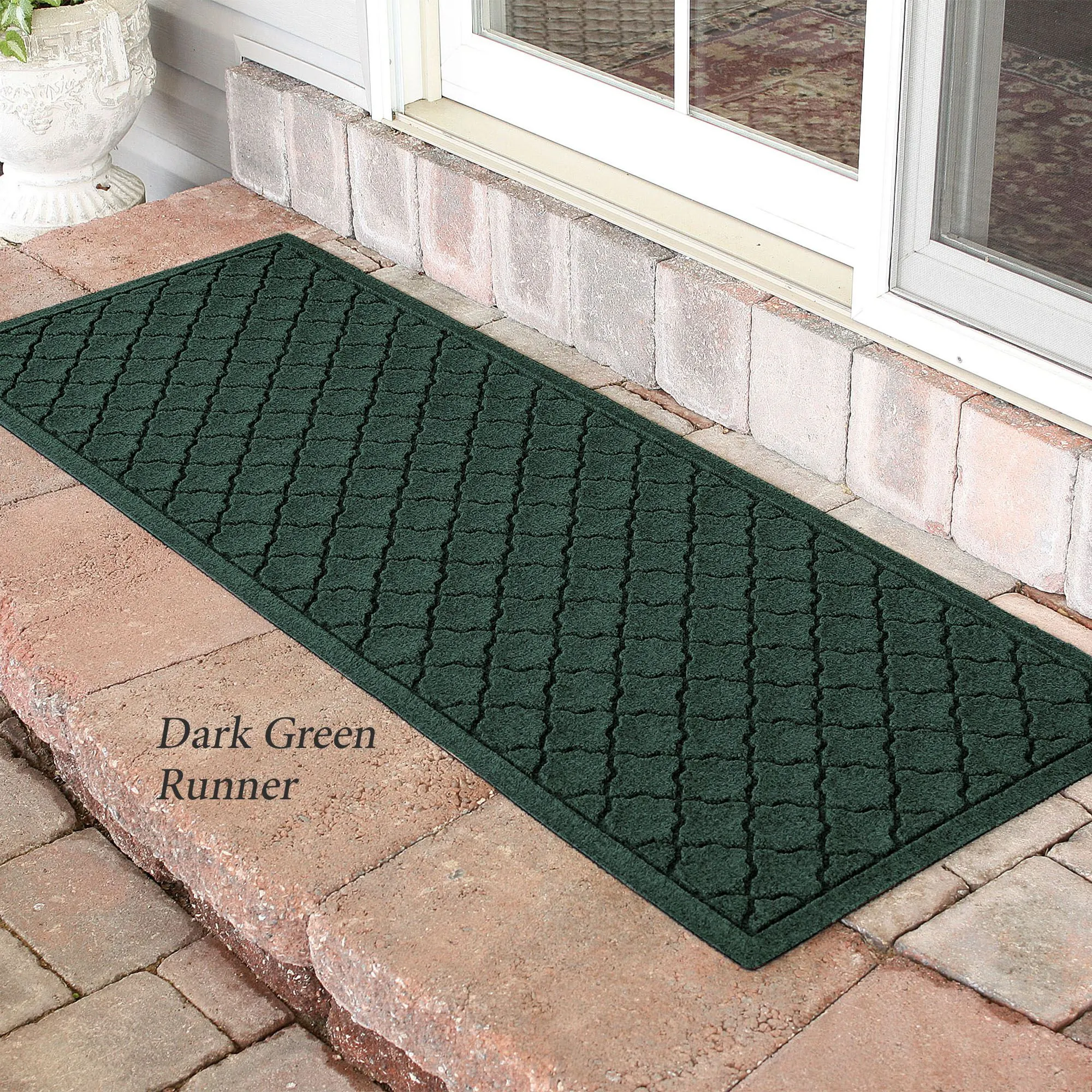 The Cordova Indoor/Outdoor Runner Mat will spice up your entryway with exotic quatrefoils. The antistatic PET polyester fiber floor accent has a nonskid SBR rubber backing that is slip-resistant and certified by the National Floor Safety Institute. The WaterHog(R) exclusive Water Dam border keeps dirt and water on the mat and not your floor. The premium-grade mat is mildew-, mold-, and rot-resistant. Specify Charcoal, Burgundy, Dark Brown, Dark Green, Gray, Khaki, Navy, or Slate Blue. Runner mat is 60"x22". Indoor use or outdoor use year round. Hose off to clean.