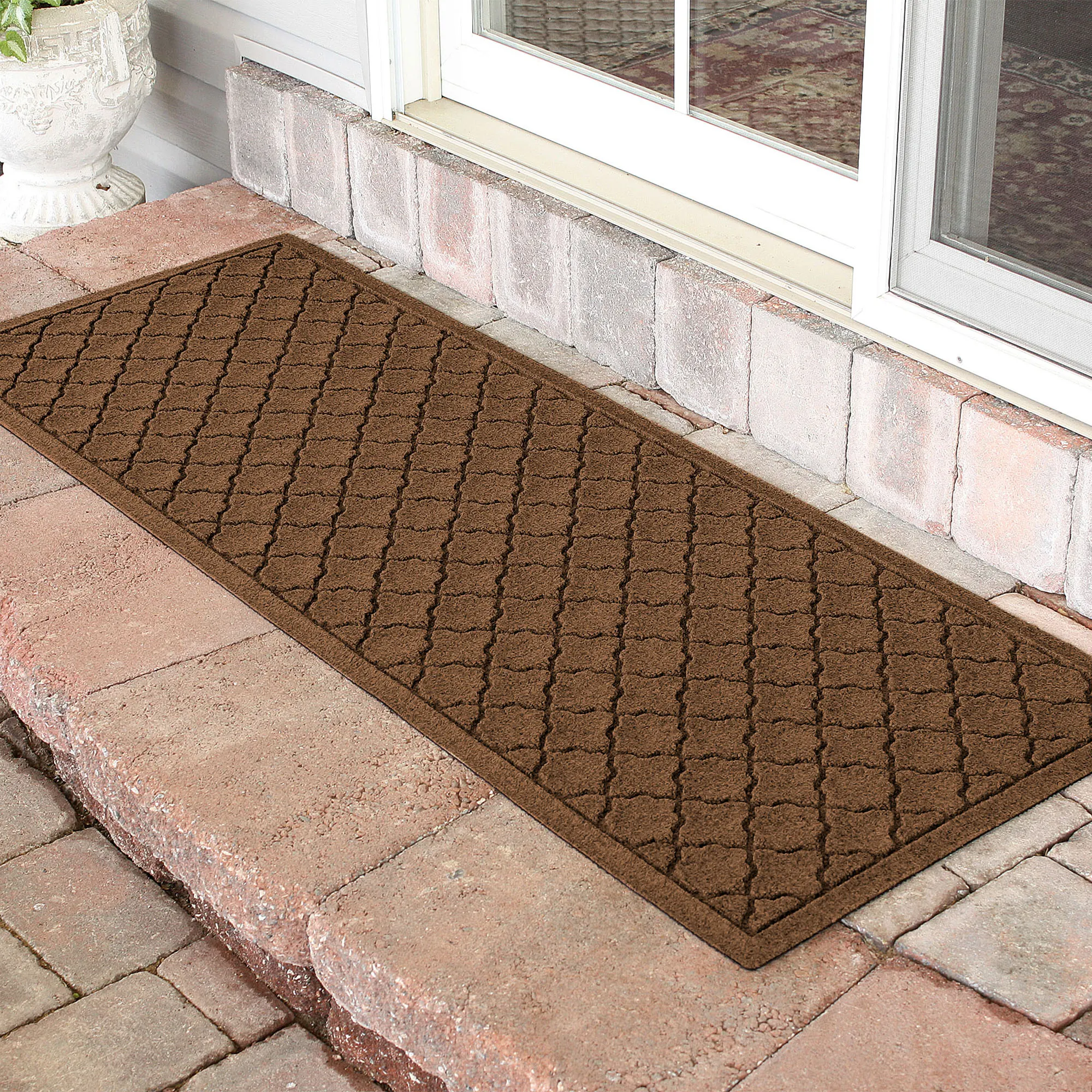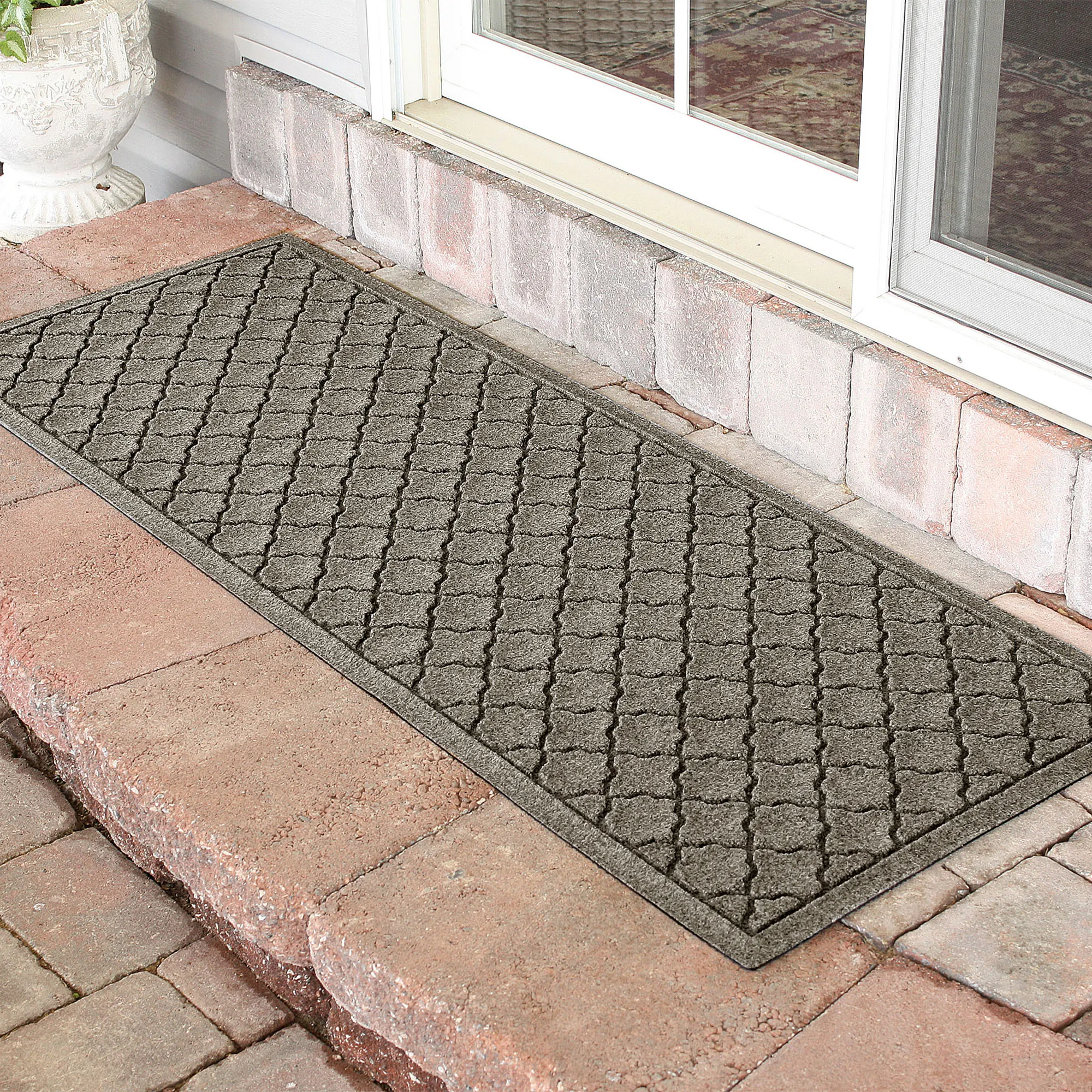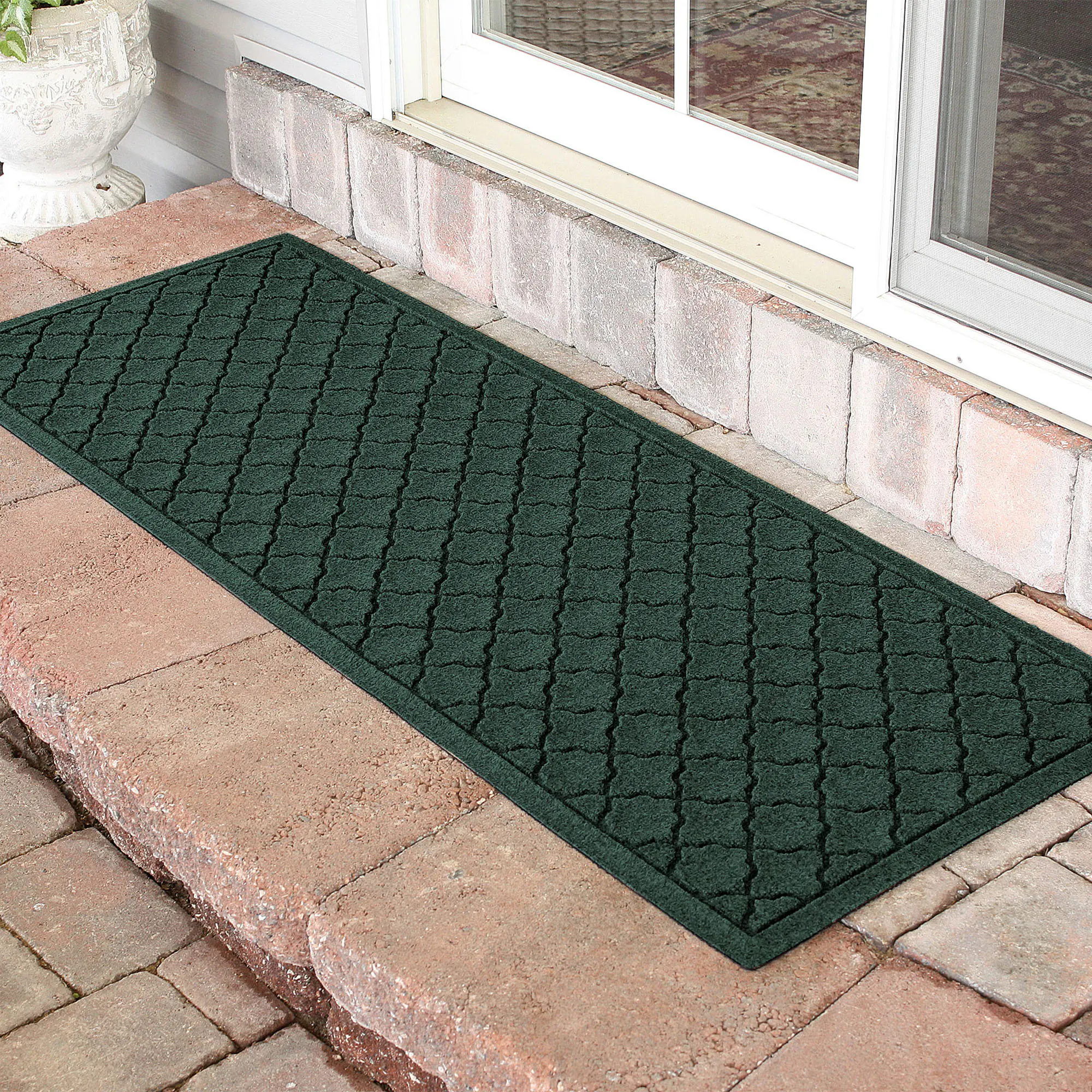 The Cordova Indoor/Outdoor Runner Mat will spice up your entryway with exotic quatrefoils. The antistatic PET polyester fiber floor accent has a nonskid SBR rubber backing that is slip-resistant and certified by the National Floor Safety Institute. The WaterHog(R) exclusive Water Dam border keeps dirt and water on the mat and not your floor. The premium-grade mat is mildew-, mold-, and rot-resistant. Specify Charcoal, Burgundy, Dark Brown, Dark Green, Gray, Khaki, Navy, or Slate Blue. Runner mat is 60"x22". Indoor use or outdoor use year round. Hose off to clean.