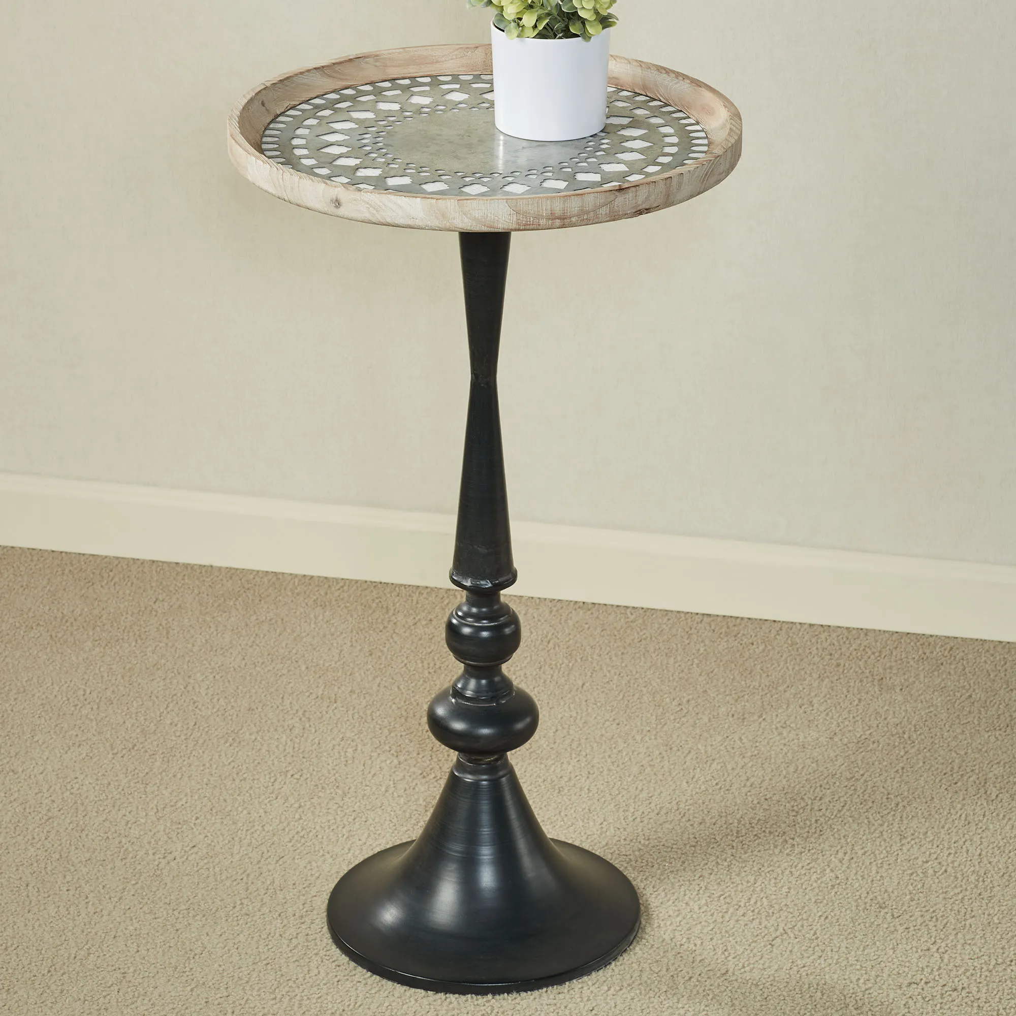 Unexpected detailing highlights the beauty within the Coretta Round Accent Table. Finished in black, the metal base features an angular shape accented with orbs. A natural wooden tray-like top completes the design, overlaid with a laser-cut galvanized metal radiating pattern and a tempered glass surface. Overall, the accent table measures 17"dia.x30"H and weighs approx. 12 lbs.