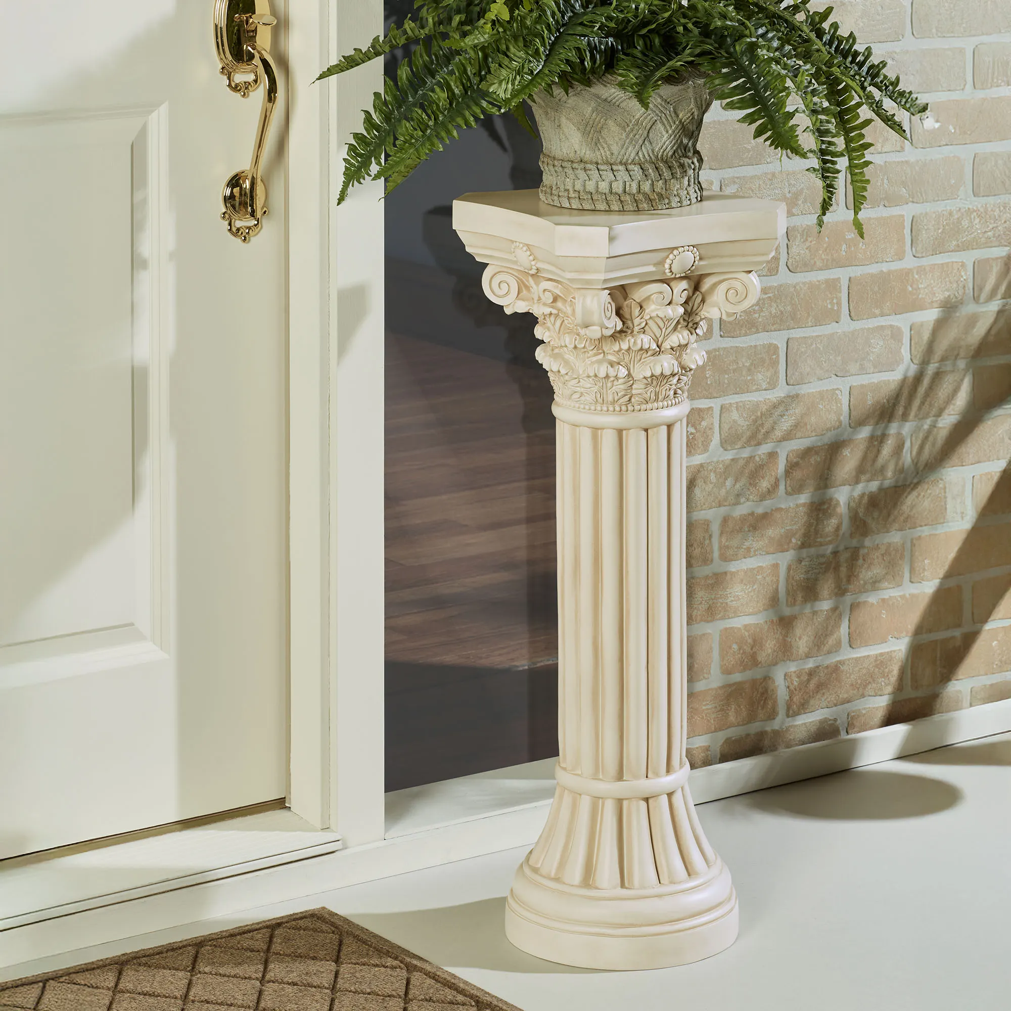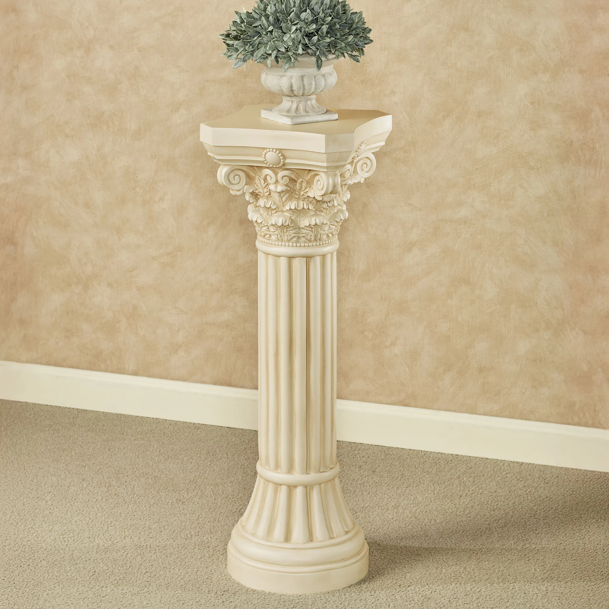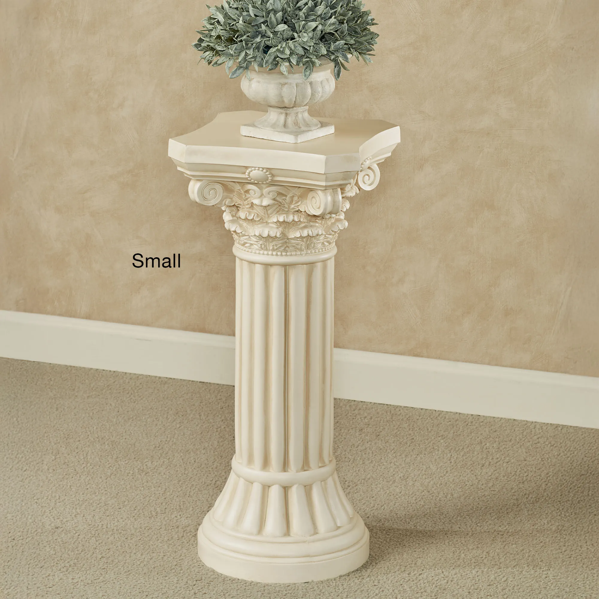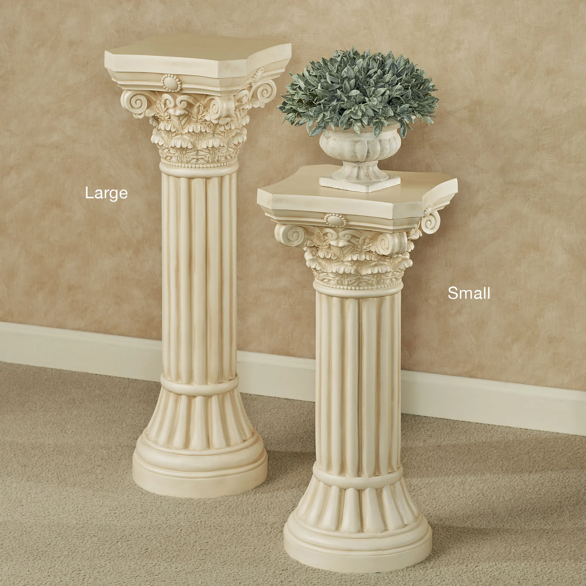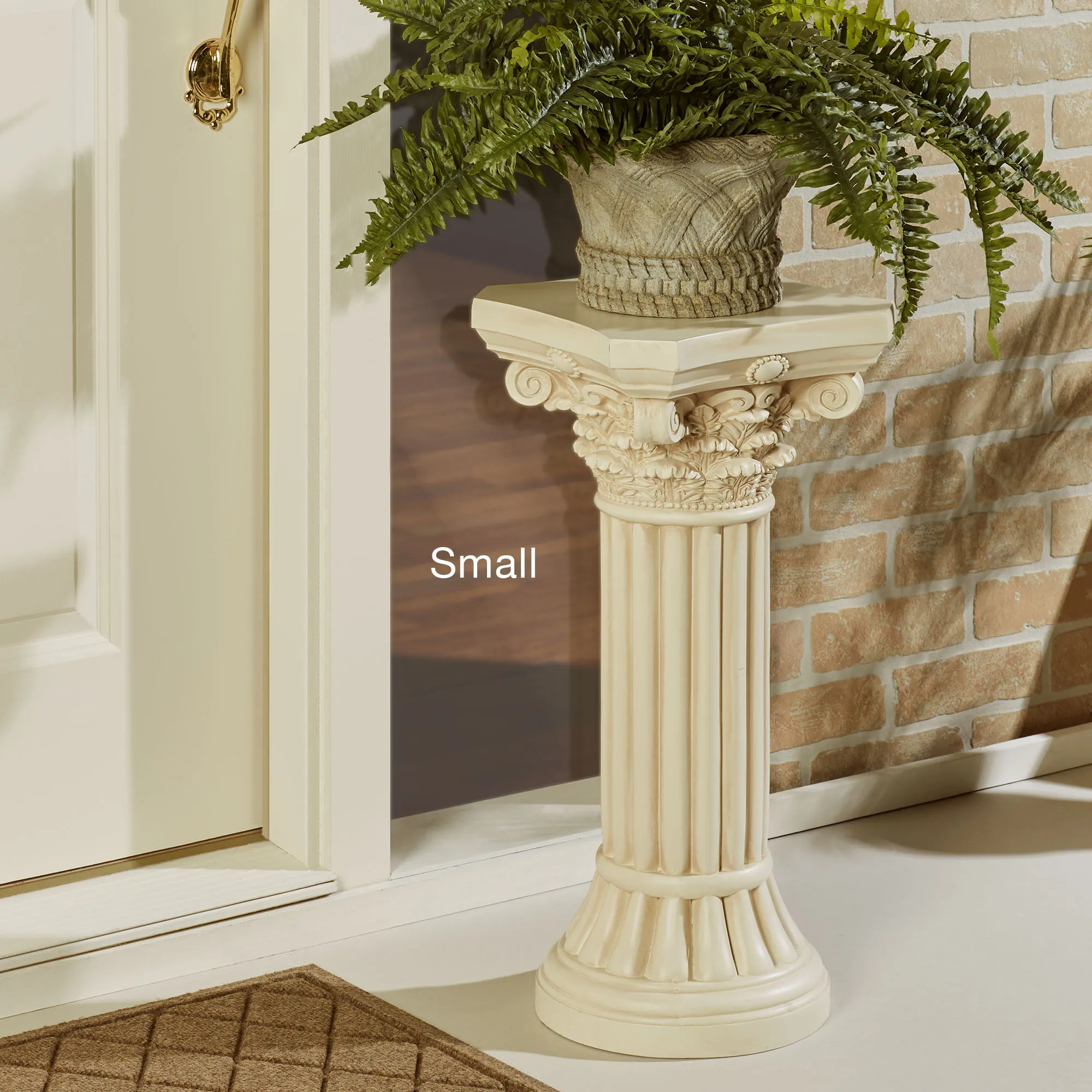 The classic architecture of the Corinthian Column Display Pedestal looks elegant and formal. This resin/fiberglass pedestal has an ivory finish and a beige wash and features a decorative capital with acanthus leaves, scrolls, and medallions. The fluted column has a round base. May be used indoors or outdoors seasonally; do not expose this item to freezing temperatures. Columns are sold individually. Small is 12"sq.x24"H. Large is 12"sq.x31"H.