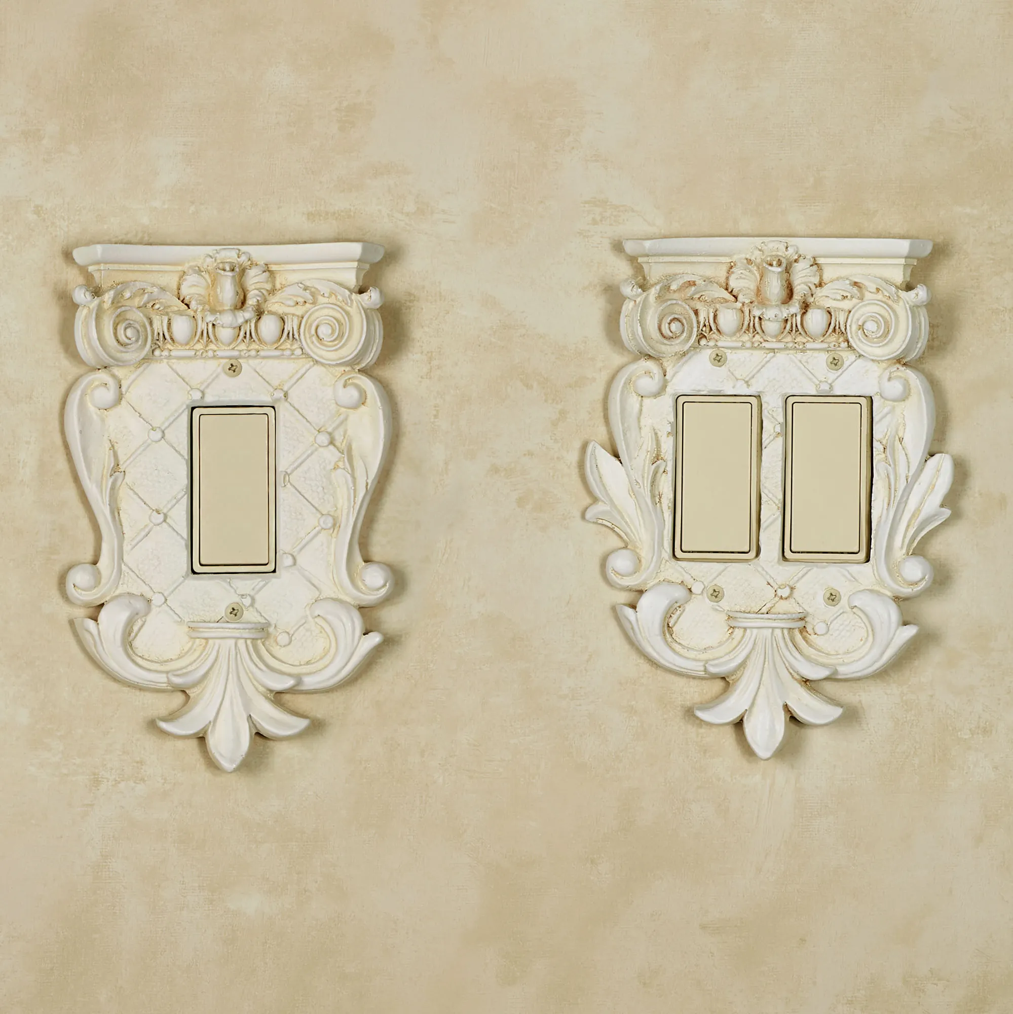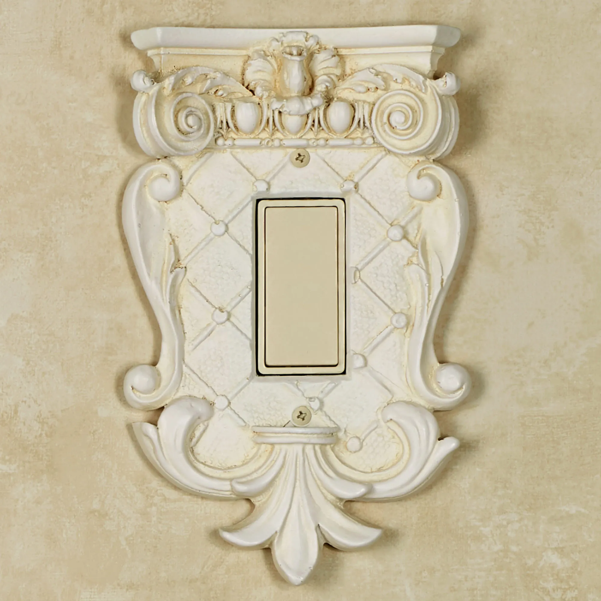 The handcrafted Corinthian Provincial Ivory Dimmer/Rocker Switchplates, with a flat-topped pedestal design, let you bring a touch of classical grace to the often overlooked details of your rooms. Handpainted resin switchplates have a provincial ivory finish and feature a variety of classic motifs, including a lattice pattern, fleur-de-lis, leaf scroll, volutes, and egg and dart designs. Choose Single Dimmer/Rocker, 5.25"Wx8.25"H; or Double Dimmer/Rocker, 6"Wx8.25"H. Do not over-tighten the screws.