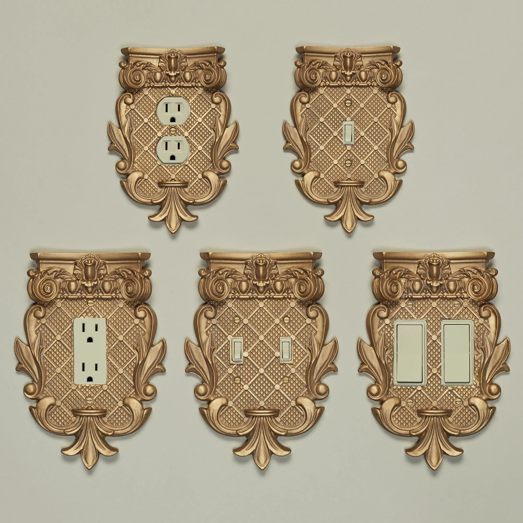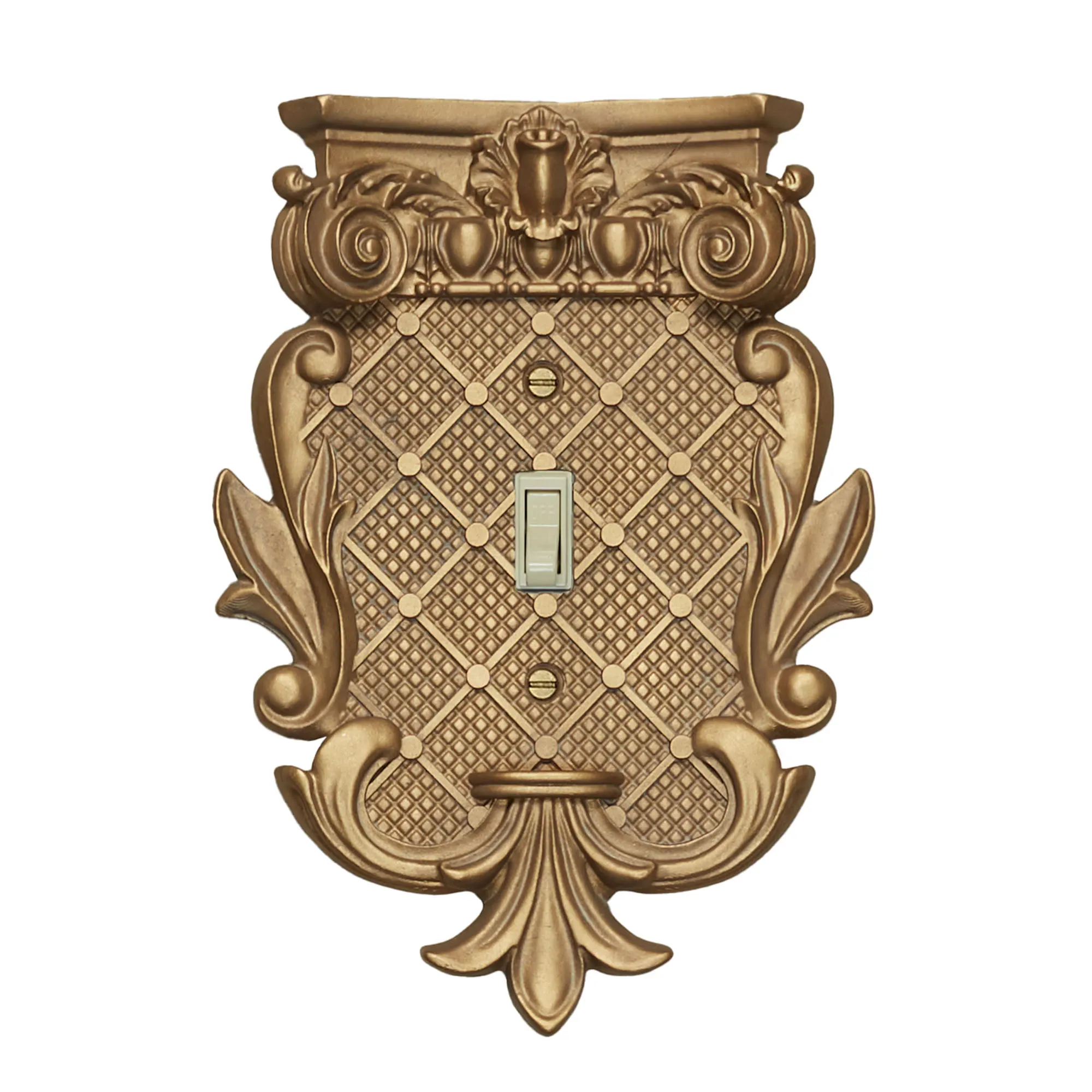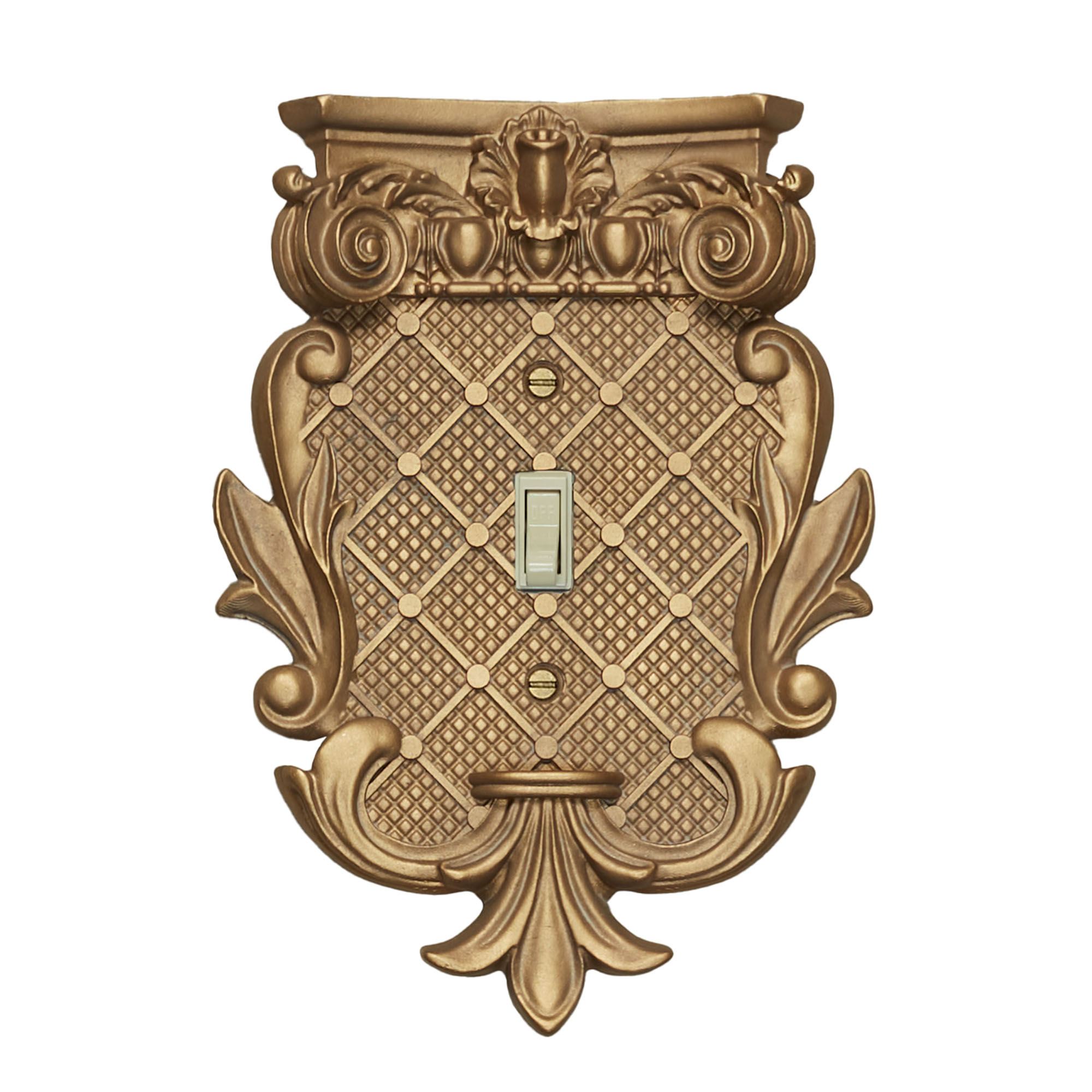 A Corinthian Switchplate graces a space with classic architectural details. Finished in aged gold, each resin design features latticework, a fleur-de-lis, flourishing acanthus leaves, and a column-inspired flat-topped design with scrolling volutes and timeless egg and dart motifs. Choose Single Switch, Double Switch, Single Outlet (two sockets), Single Dimmer/Rocker, or Double Dimmer/Rocker. Do not over-tighten the screws.