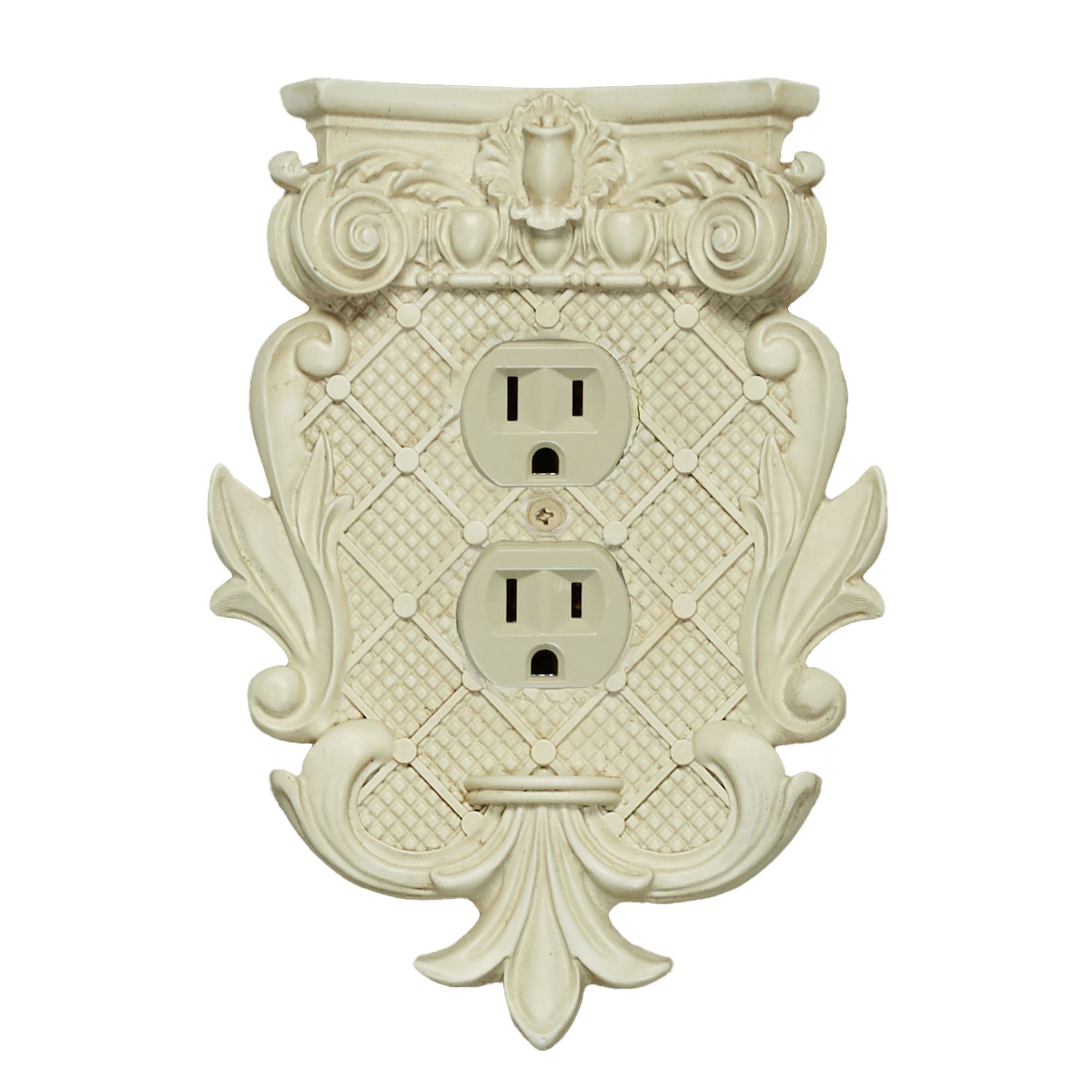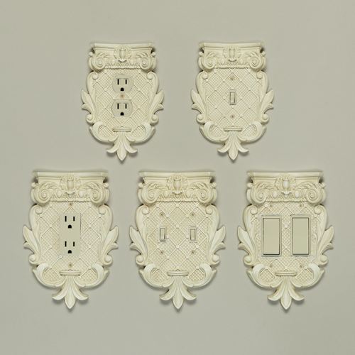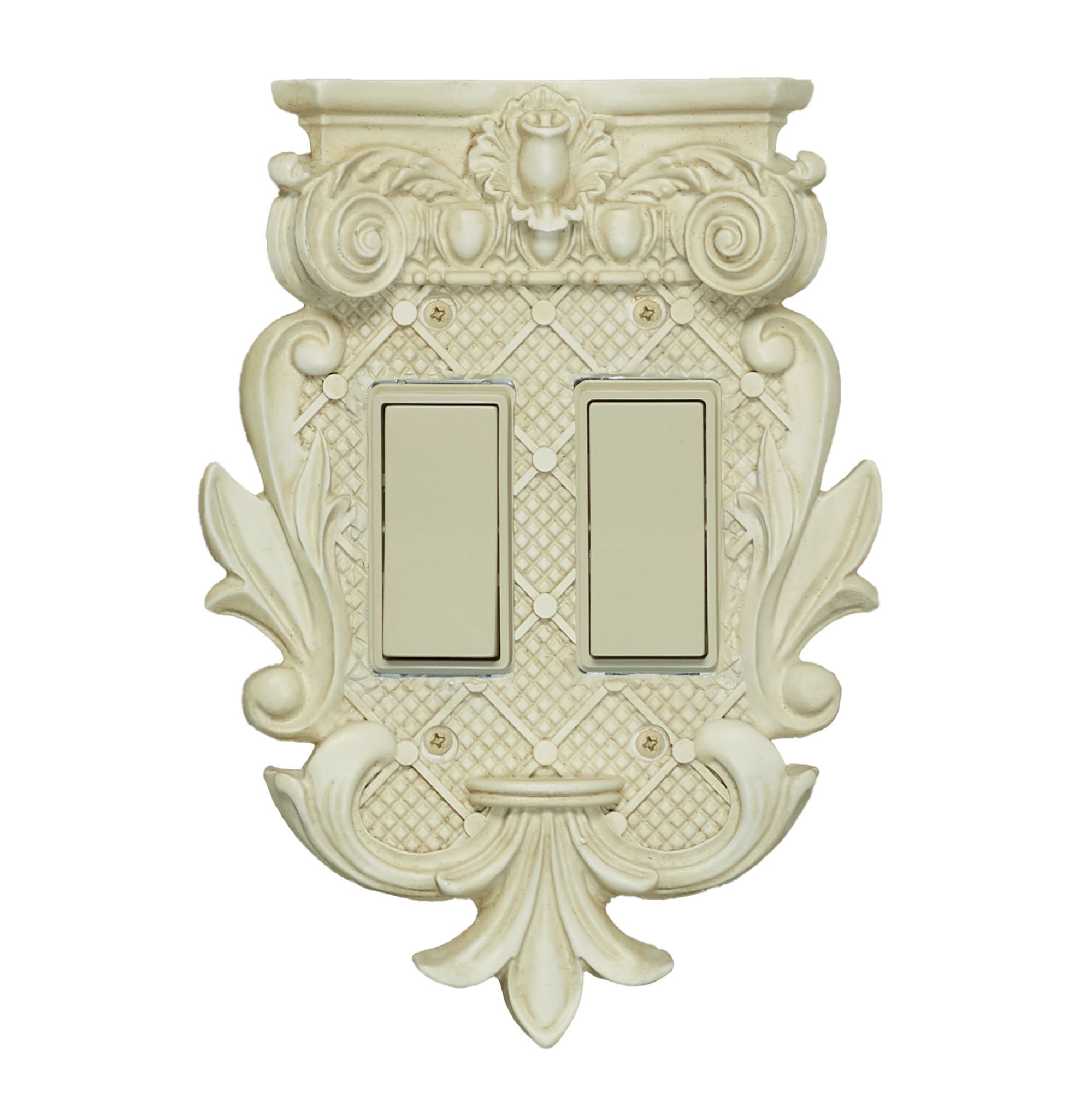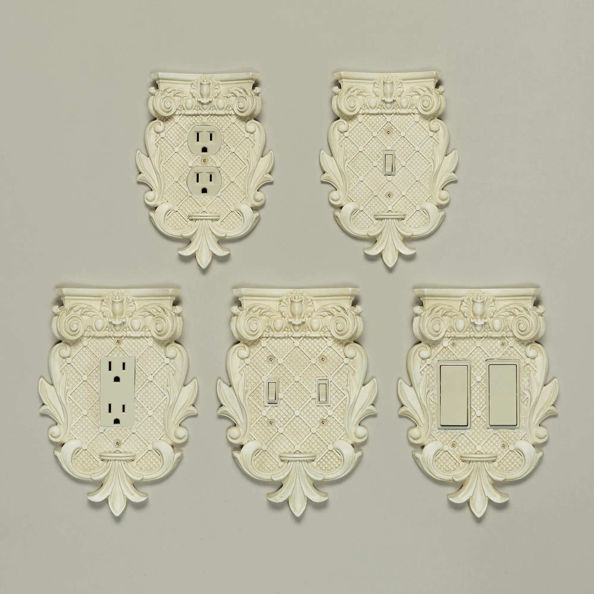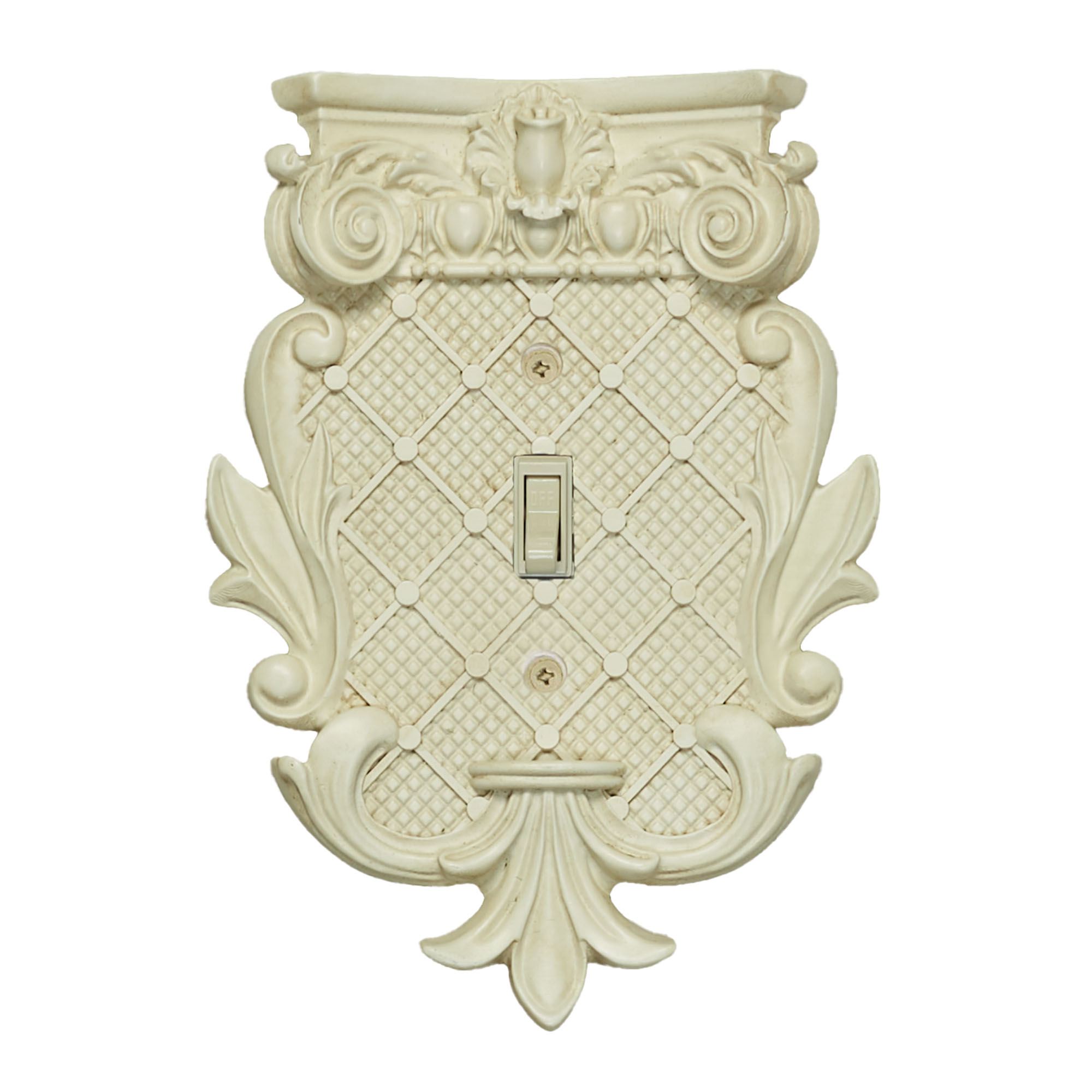 A Corinthian Switchplate graces a space with classic architectural details. Finished in antique ivory, each resin design features latticework, a fleur-de-lis, flourishing acanthus leaves, and a column-inspired flat-topped design with scrolling volutes and timeless egg and dart motifs. Choose Single Switch, Double Switch, Single Outlet (two sockets), Single Dimmer/Rocker, or Double Dimmer/Rocker. Do not over-tighten the screws.