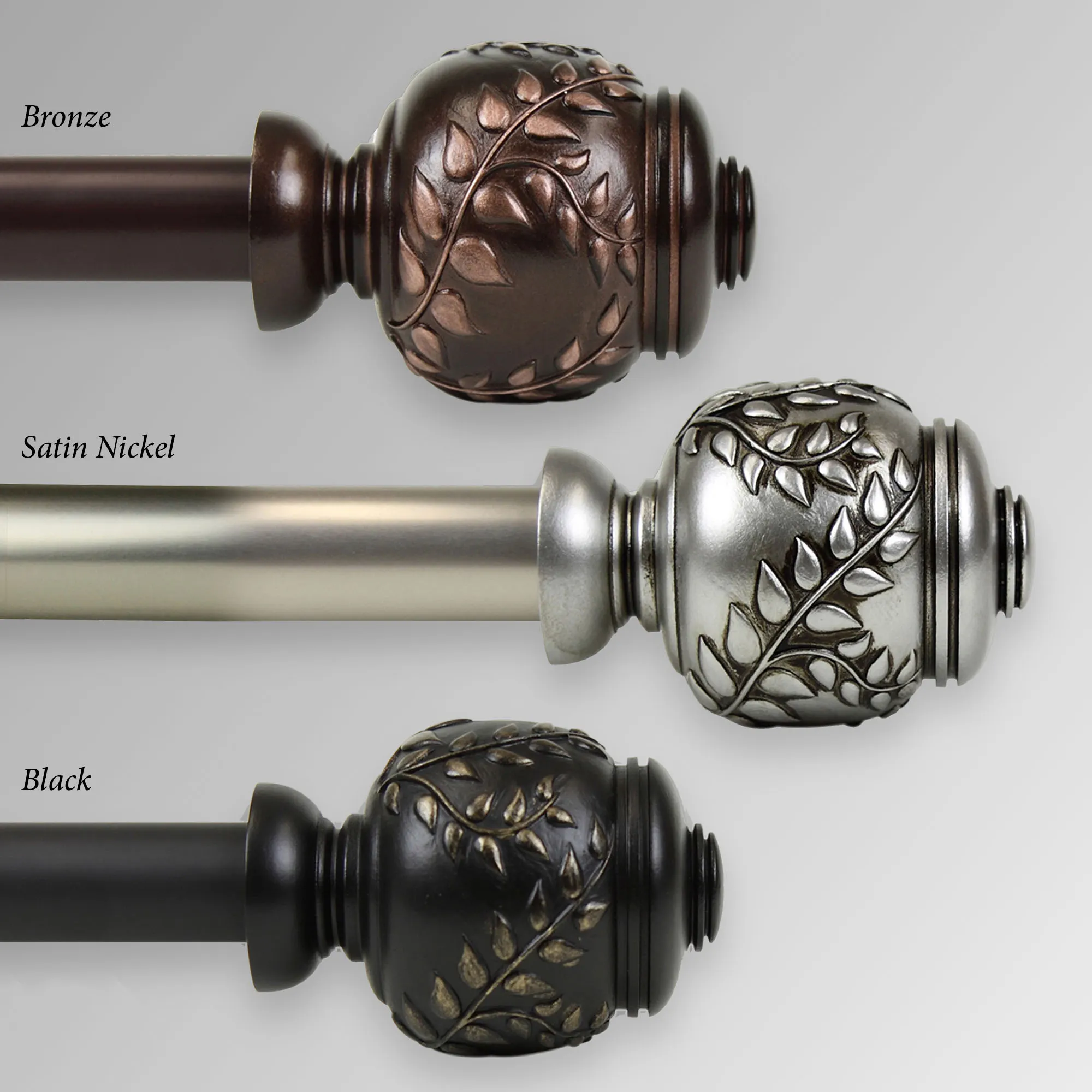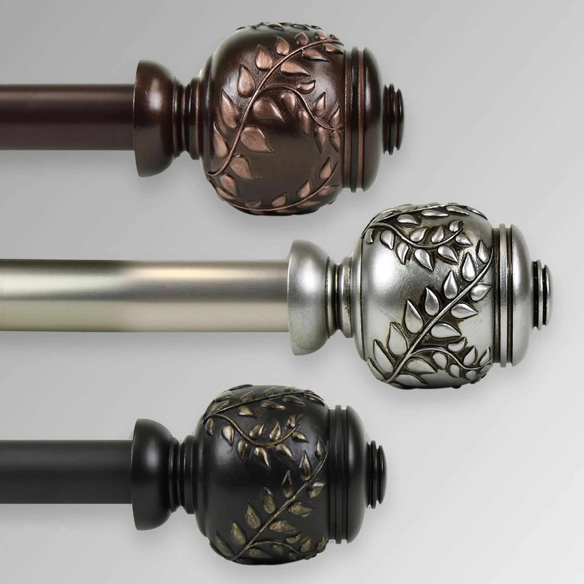 The Cornelia Single Decorative Curtain Rod Set will decorate your window with a bit of nature. This set includes a steel telescoping rod, 1" dia.; brackets that project 3.625"; and two resin finials, each 3.5"dia.x2.75"H, with vining leaves. The 28"-48" rod comes with two brackets. The 48"-84" and 66"-120" rods come with three brackets. The 120"-170" rod comes with four brackets. The 160"-240" rod comes with five brackets.