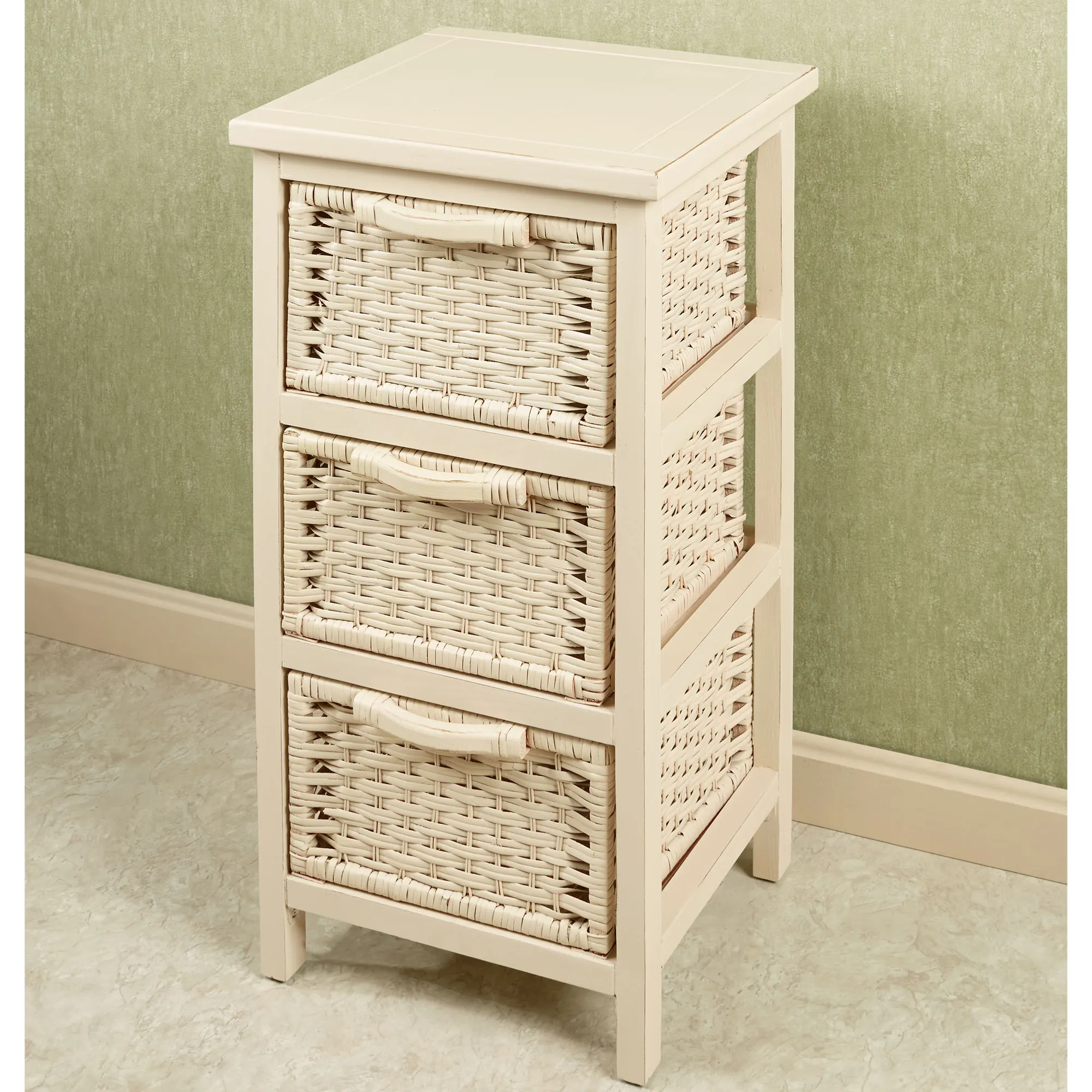 Keep yourself organized with the Corvaserro Storage Cabinet. The sturdy wooden frame and top, combined with rattan basket weave drawers and wooden handles, complete the look. Drawers are each 10"Wx11"Dx6"H. Overall, this whitewash-finished storage cabinet measures 15" sq. The 3-Drawer Cabinet is 29"H; 13 lbs. The 4-Drawer Cabinet is 37"H; 16 lbs. The 5-Drawer Cabinet is 46"H; 19 lbs.