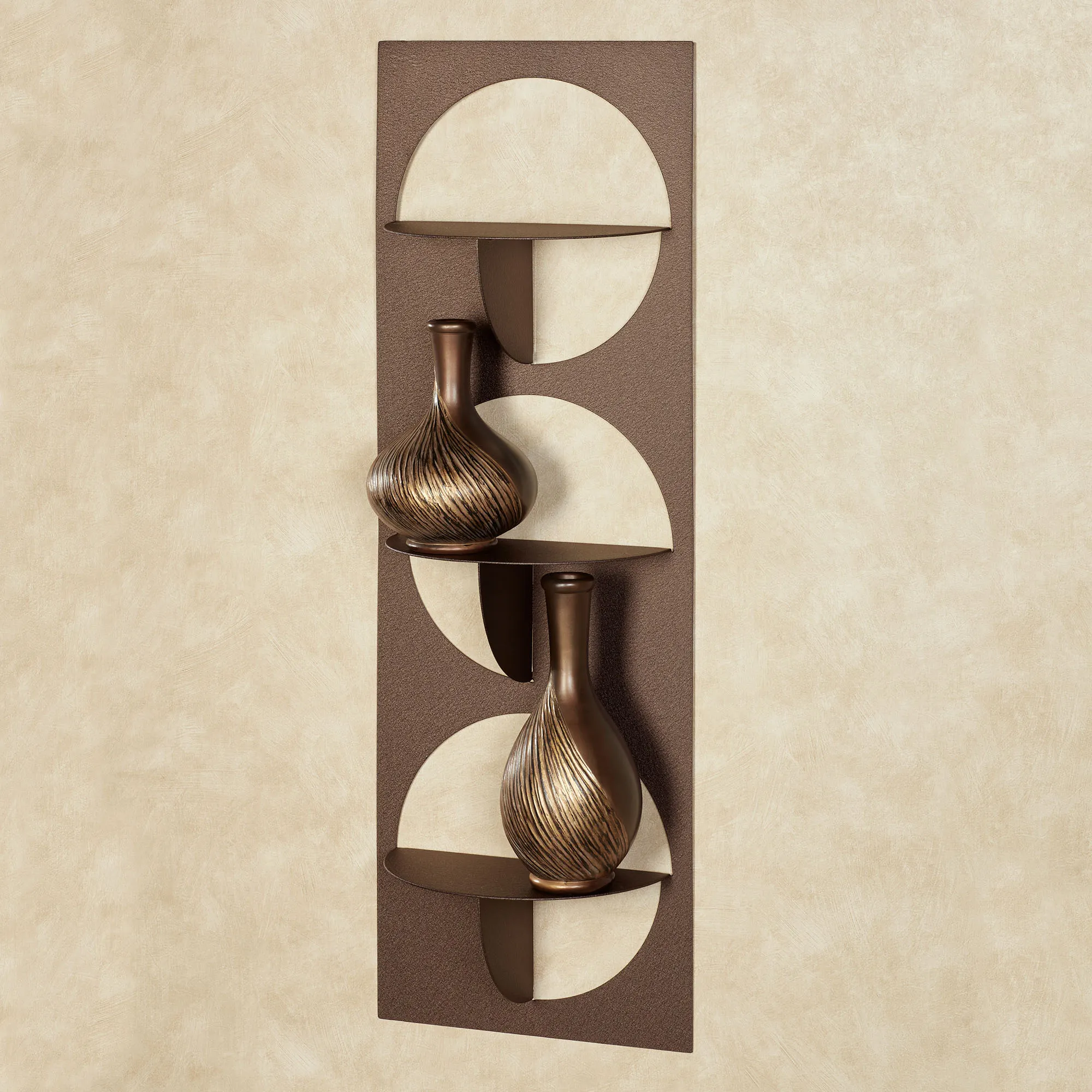 Display your items within the modern appeal of the Corydon Vertical Wall Shelf designed by JasonW Studios(R). Handcrafted in the USA by skilled American craftsmen, the wall shelf is constructed of precision-cut 14-gauge steel, then completed with a UV-, weather-, and tarnish-resistant powder-coat finish for a beautiful display inside or outside your home year round. Openwork 6"D semicircular shelves add dimension to the rectangular framework for a chic angular style. Vertical designs, 13"W, have 12"H spacing between each shelf. The Two-Tier Shelf is 26"H and weighs 7 lbs. The Three-Tier Shelf is 37"H and weighs 10 lbs.