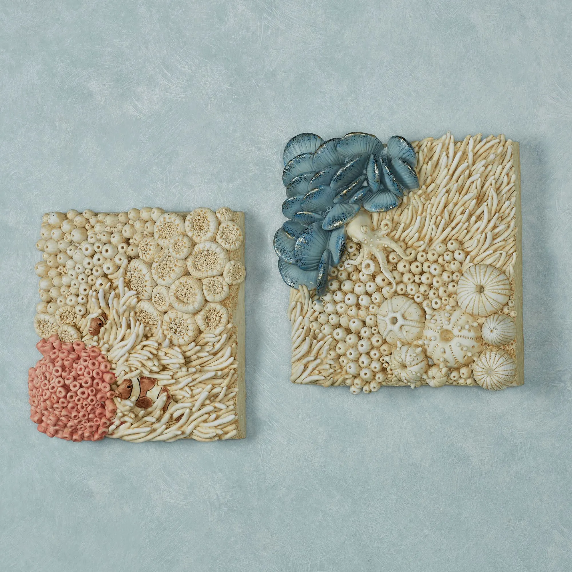 Transport your decor down to the depths of the Cosette Coral reef. With a dimensional square shape, each resin wall plaque in this set features a variety of cream coral with realistic textures. One features blue clams and an octopus. The other design has two clownfish outside of a salmon anemone. Each is 12.5"sq.x3.5"D.