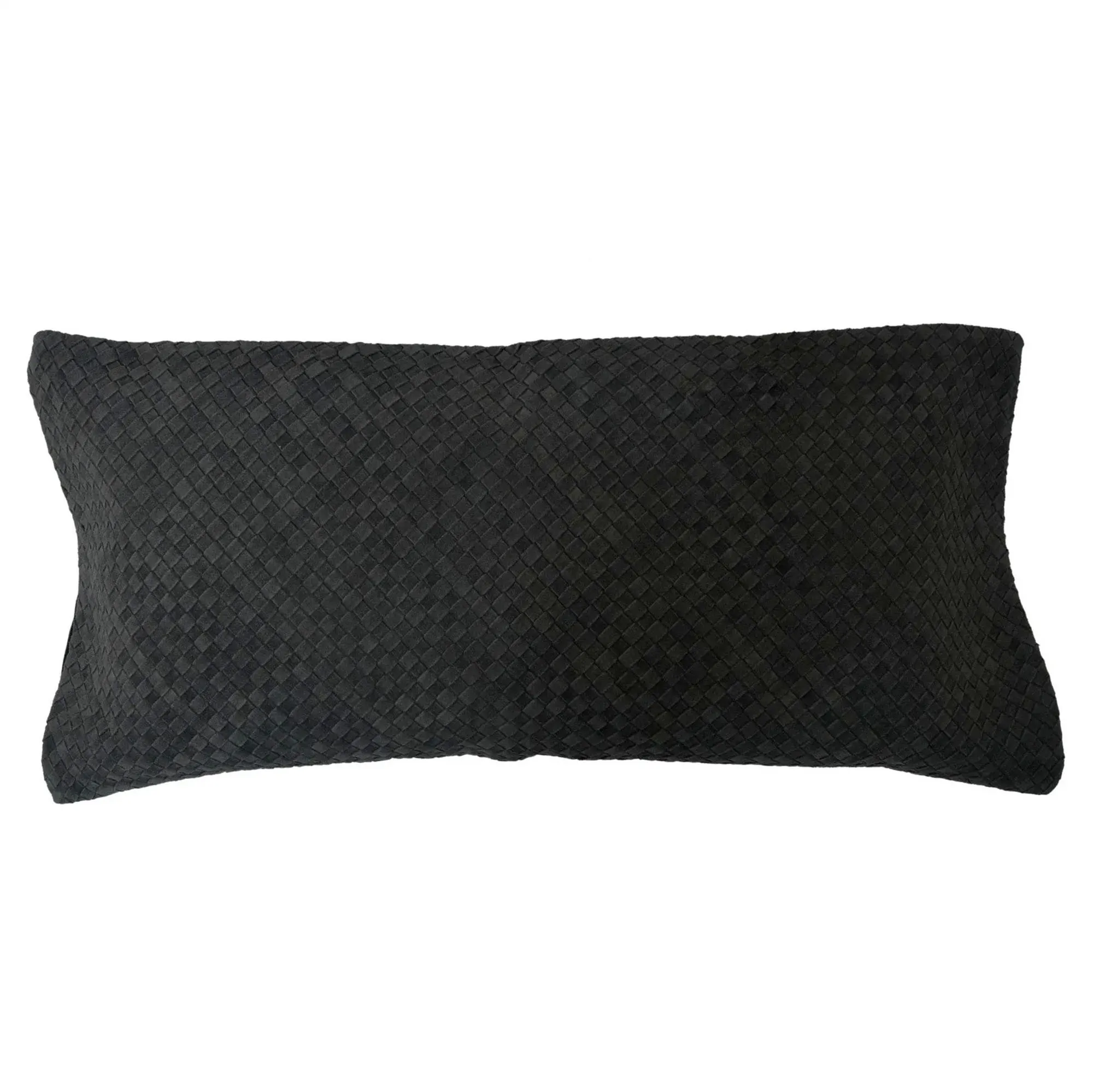 Reversible Rectangle Pillow is black leather hand-woven in a crisscross pattern with tailored edges. Fill has waterfowl feathers. Spot clean.