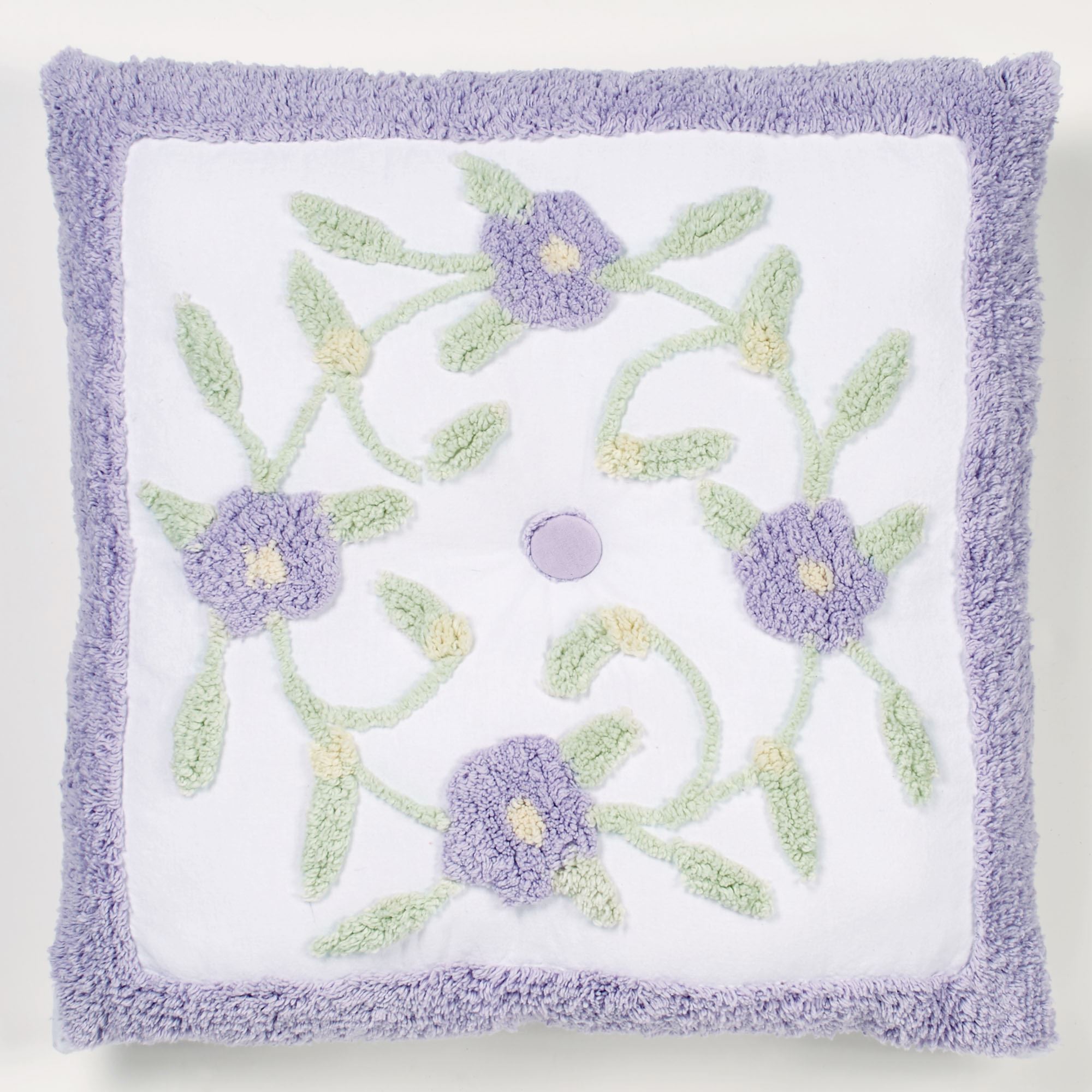 Decorate with the delicate vines and dainty blooms of the Cottage Garden Bedding Accessories. Soft, pastel shades of lavender, green, and white adorn these handcrafted cotton chenille accessories. Flanged Standard Sham has tufted vining florals, chenille dots, and scalloped designs; French back closure. Round Pillow, 15", has a floral in the center surrounded by dots and scalloped designs; side gusset is 2". Square Pillow, 18", has vining florals, a lavender button in the center, and a tufted chenille lavender border. Pillow fill is polyester. Machine wash the sham. Spot clean the pillows. Imported.