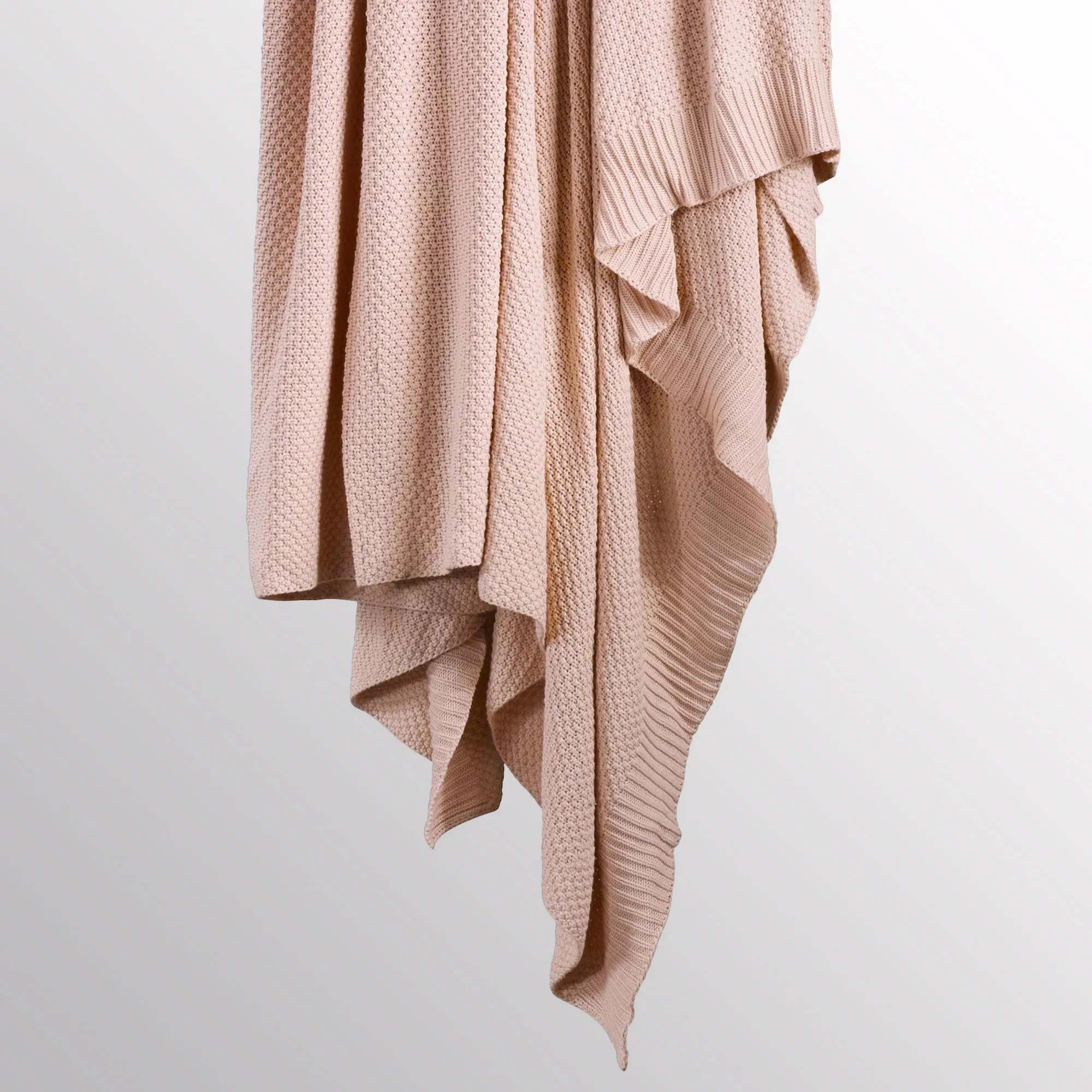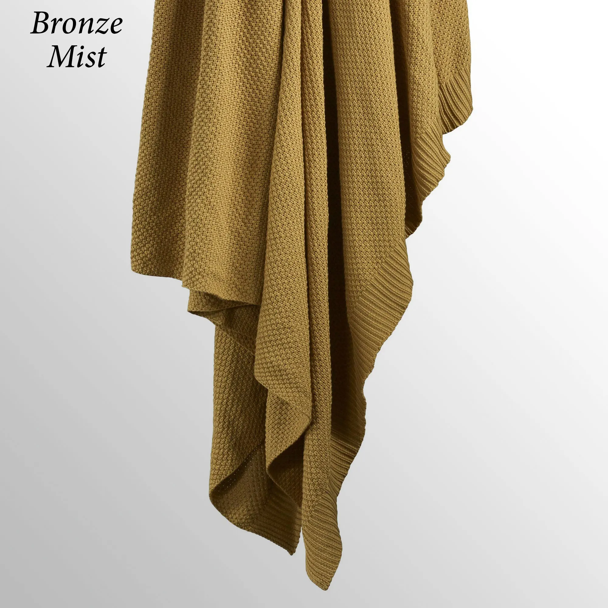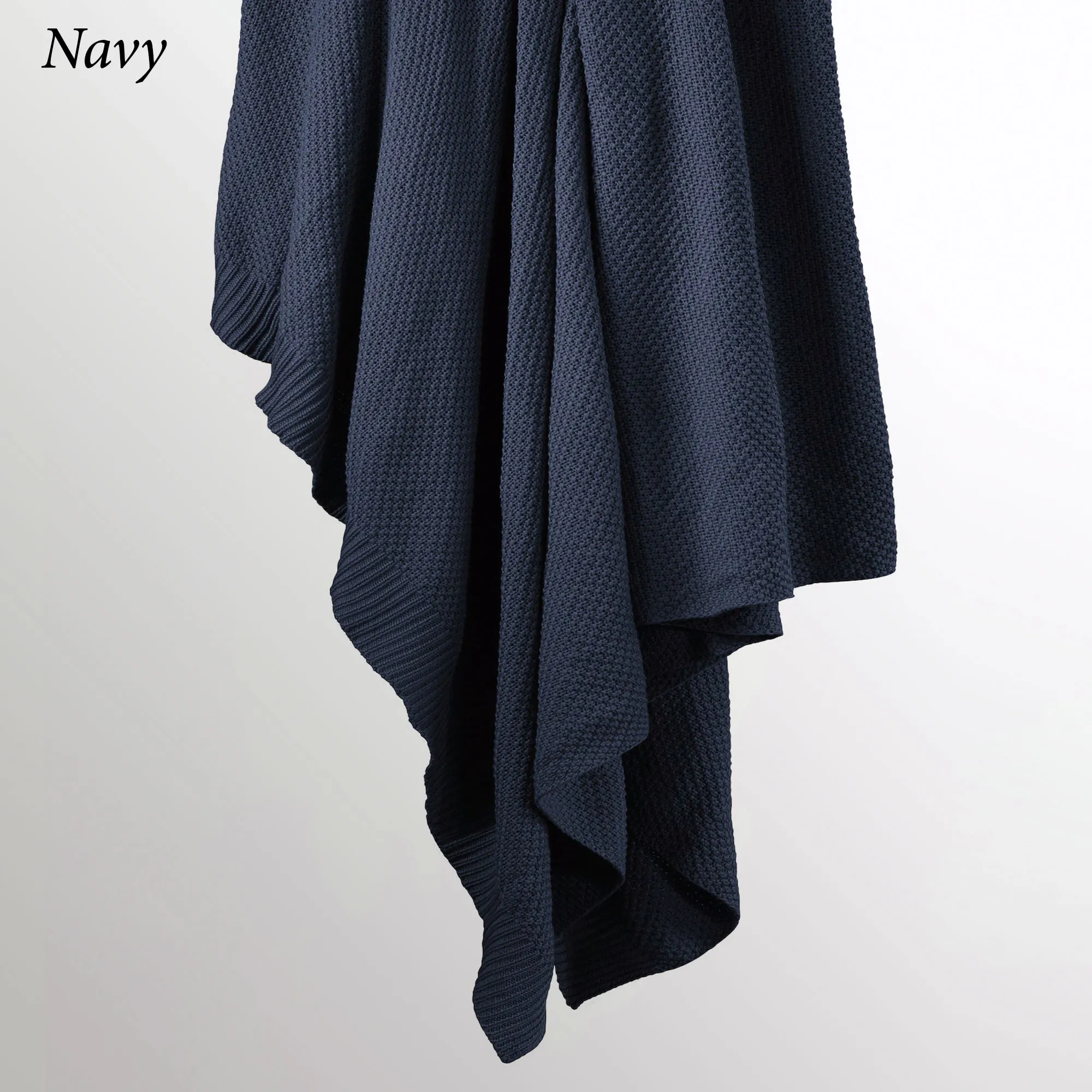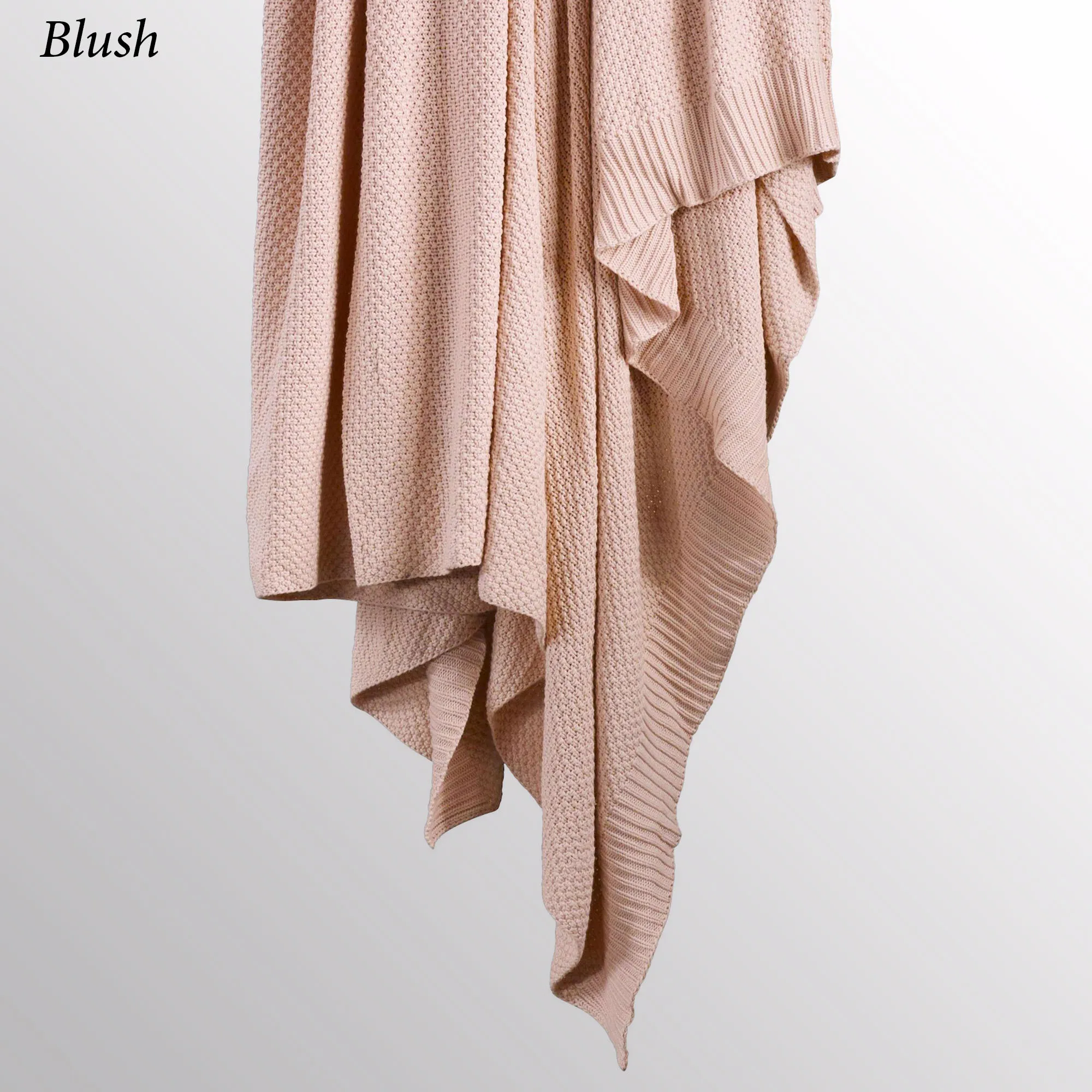 Perfect for all seasons, the ultra-soft Cotton Knit Blanket will soon become your favorite! This blanket has a tight seed stitch, ribbed trim detailing, and a lightweight warmth perfect for layering! Specify Navy, Blush, Bronze Mist, Charcoal, Light Blue, or Vintage White. Machine washable. Imported.