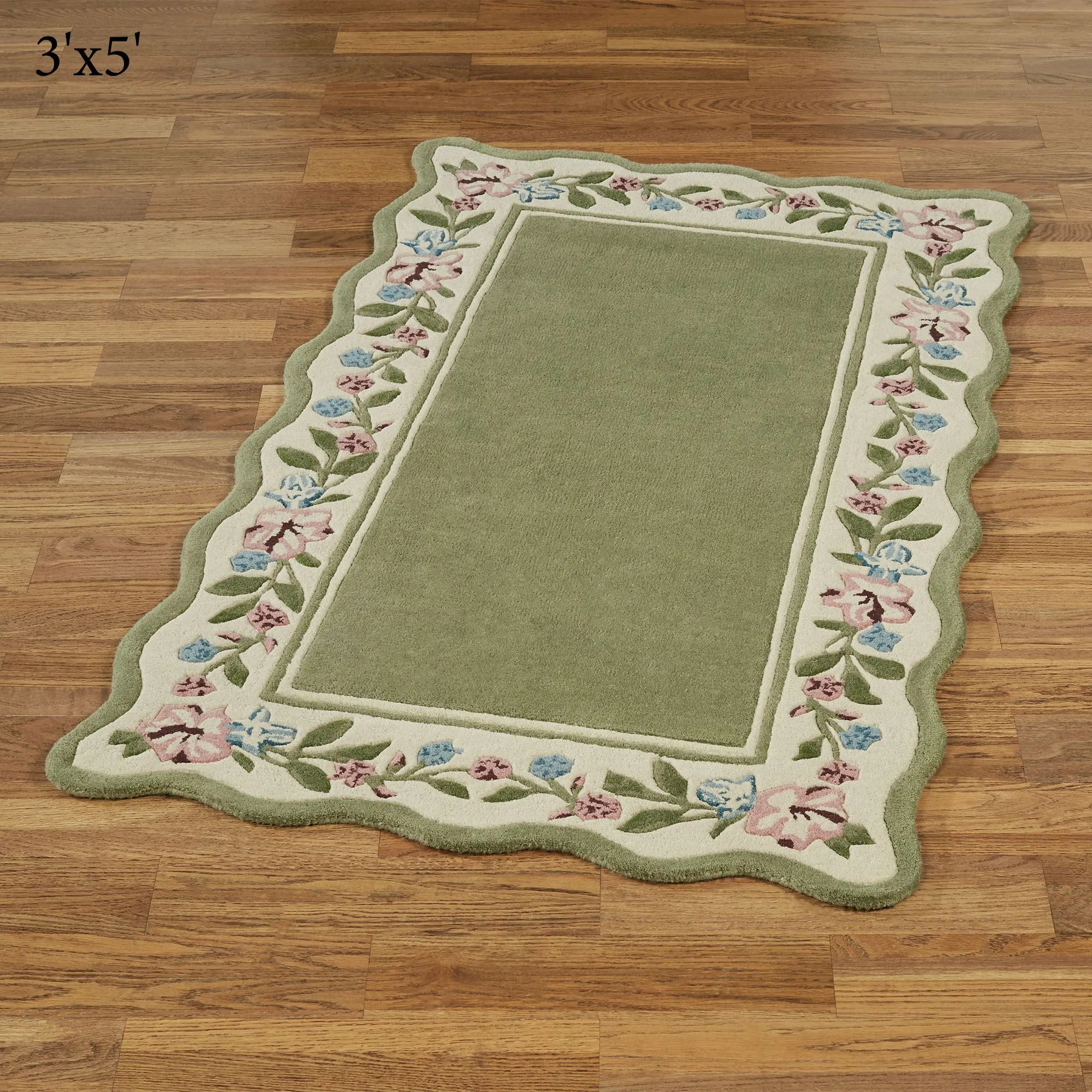 Delicate blossoms bloom with beauty on the Coventry Sage Floral Border Rug. This hand-tufted wool area rug, .75" thick, has a solid sage center, handcarved designs, and scalloped edges. Accent colors include shades of dark sage, dark beige, ivory, cornflower, federal blue, dark blush, and maroon. Back is cloth-covered latex. We recommend professional cleaning by a rug cleaner. Imported.