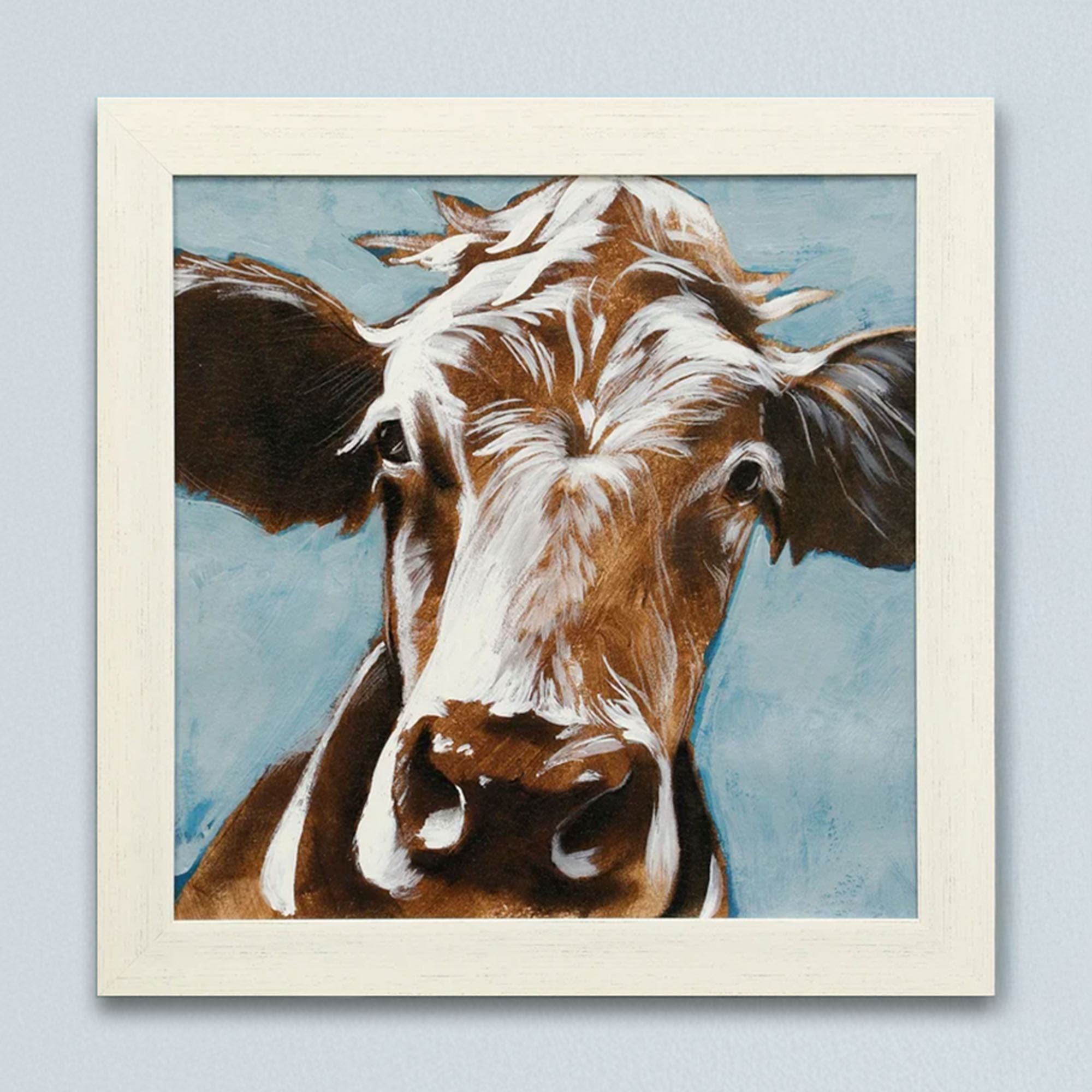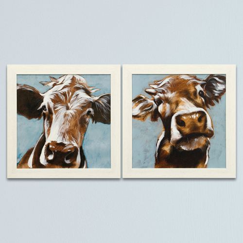 Everyone will love how cute the Cow Self Portrait turned out. This whimsical, paper printed wall art features a close-up of a dark brown and white cow face on a blue background with a brushstroke effect. The square polystyrene frame has a faux wood look and an ivory finish. Cow 1 has its snout pointing downward. Cow 2 has its snout pointing forward. Each framed cow wall art measures 29" sq.