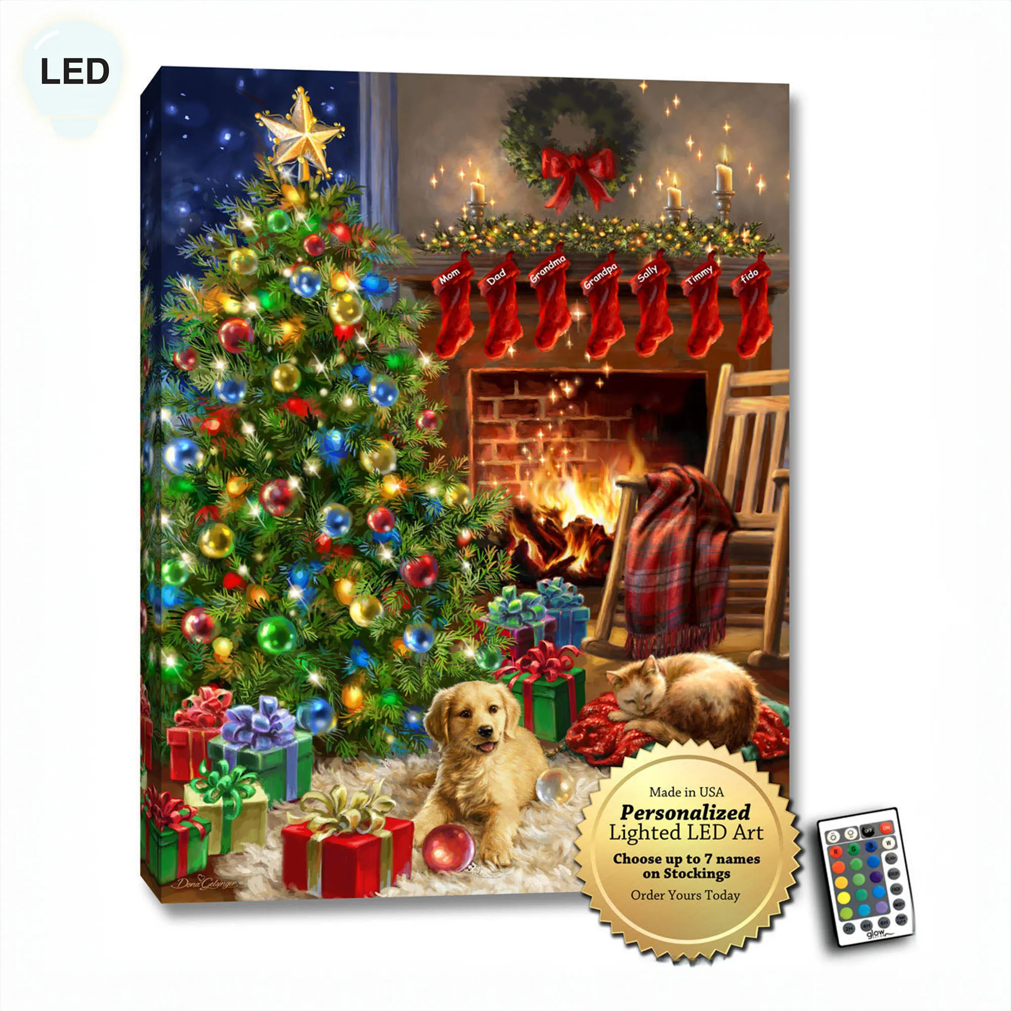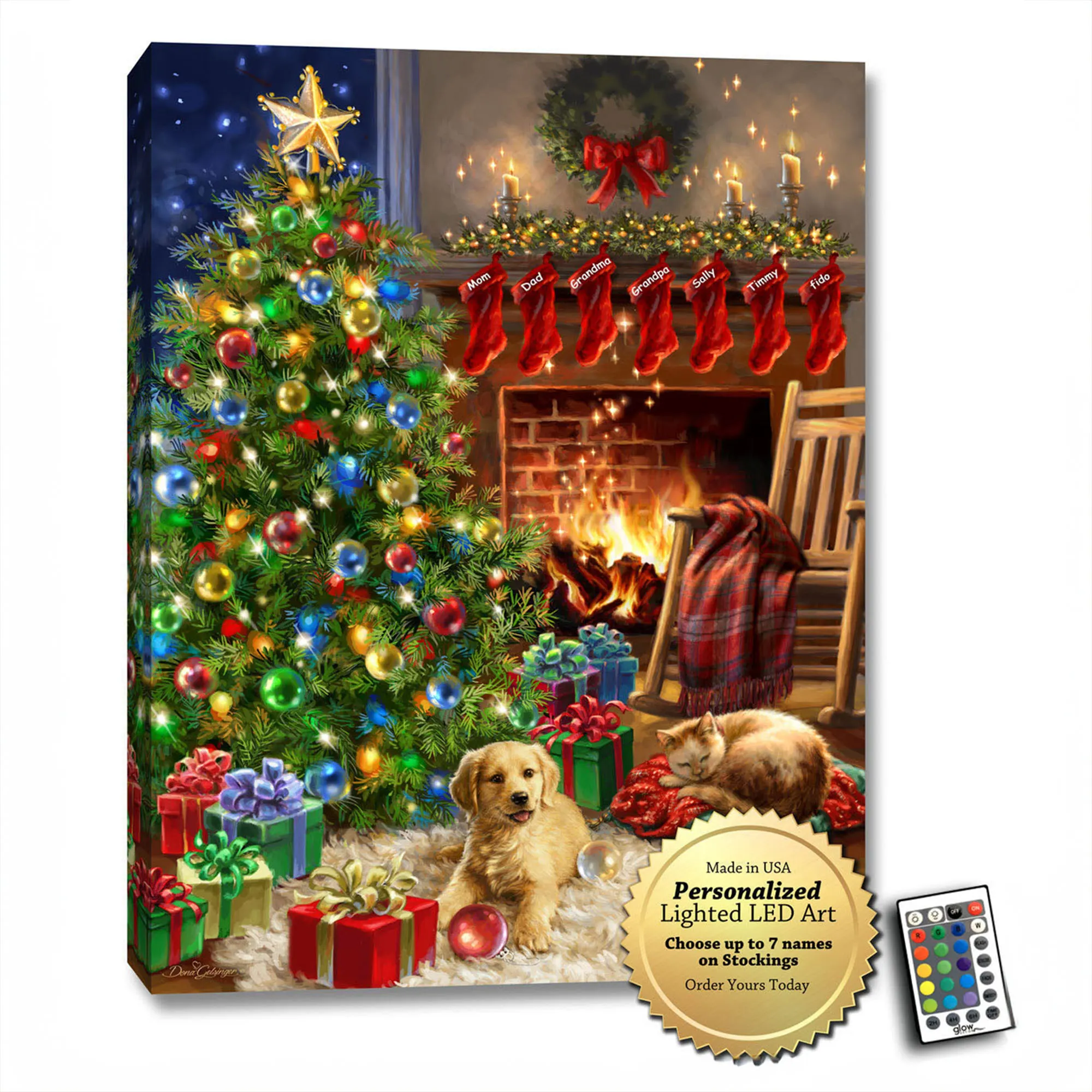 This puppy and kitten are certain to have a Cozy Christmas now that Santa dropped them off at their new home. With toys to play with and places to nap, the duo waits beneath the lovely Christmas tree with the other wrapped gifts. Originally by artist (C)Dona Gelsinger, the charming holiday artwork features a beautifully decorated home complete with seven red stockings hung by the chimney with care. Personalize each stocking with a name from your family, up to 11 characters each. Fully illuminated by LED lights, the Glow Decor(R) printed artwork features a silky satin cloth gallery-wrapped around a wood frame. UL listed. Requires three of your AA batteries or your power adapter for use with the included USB cord. The included multifunctional remote includes a battery. Measures 18"Wx2"Dx24"H. Imported/USA.