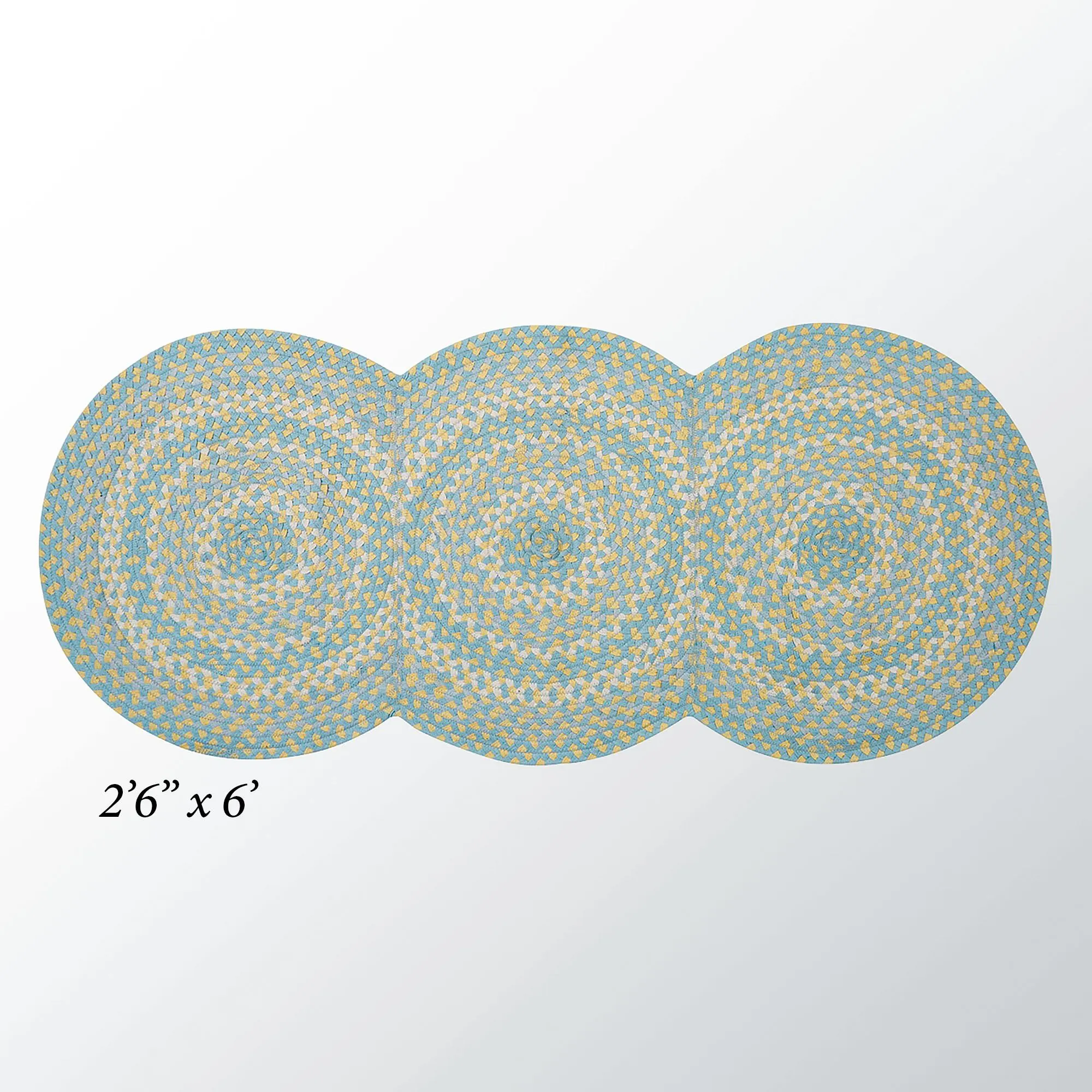 Showcase the classy look of the Cozy Cottage Braided Rug Runner. This cotton, yarn-braided rug has three conjoined circles in light blue, yellow, and white shades. Durable rug is reversible for longevity. Braided rug runner measures 2'6"x6'. Spot clean. We recommend the use of a rug pad. Imported.