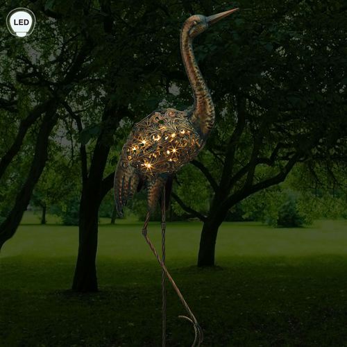 The Crane Solar Bird Outdoor Sculpture strikes a beautiful pose visible day and night. With one leg in the air, the metal crane features a handcrafted realistic shape with a long neck and openwork layered scroll body. A string of LED lights glows through the designs from the waterproof solar panel on the back; requires the one included AA rechargeable battery that provides 6-8 continuous hours of light at night. An aged bronze powder-coat finish with a verdi patina colors the bird, which also resists weather and fading. Outdoor year-round use. With a sturdy two-pronged stake, the lighted crane sculpture measures 11.5"Wx4.5"Dx44"H.