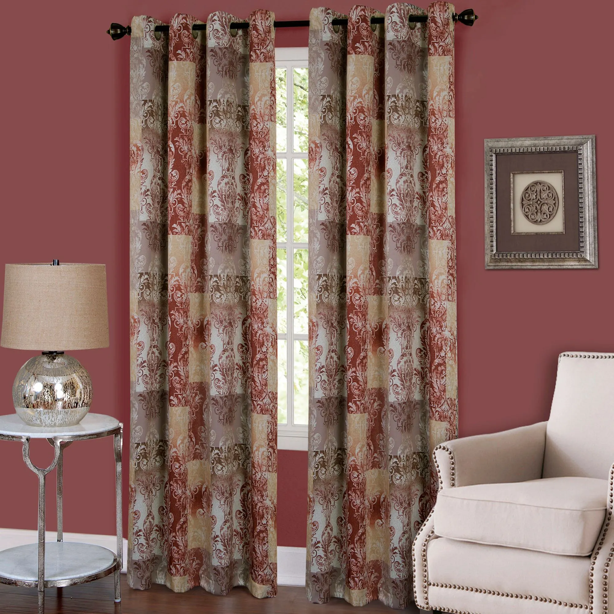 The Craze for traditional decor has stood the test of time through generations, decorating each home with beauty and elegant poise. Embrace the trends of new and old when you hang this room darkening curtain panel that saves you energy by maintaining the room temperature and reducing unwanted light. Each silky polyester treatment features a traditional blocked damask pattern in neutral tones of light taupe, tan, dark beige, auburn, and rosewood. Eight 1.5" dia. silver metal grommets accent each 50"W tailored panel, sold individually. Machine washable. Imported.