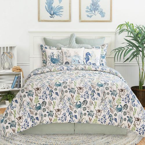 Relax among the reef with the Crescent Bay Coastal Bedding. The Mini Quilt Set includes a quilt and sham(s). Printed in coastal hues, seahorses, sand dollars, shells, crabs, octopuses, sea turtles, seaweed, and sea grasses decorate the ivory cotton bedding with blue, teal, green, gray, and brown shades. Quilt has vermicelli quilting and a striped reverse; fill is a cotton/polyester blend. Machine washable. Imported. Sorry, the bedskirt and European shams shown are not available.