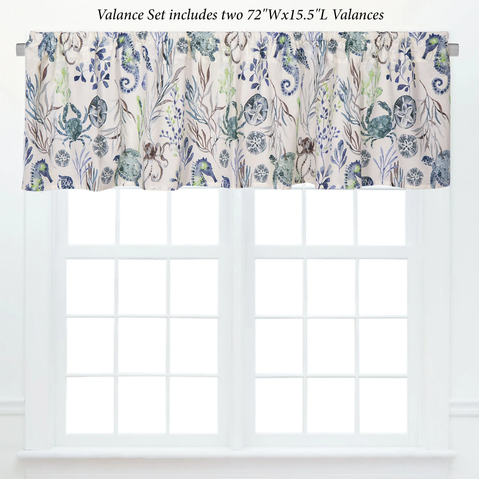 Dive into the depths of Crescent Bay and relax among the reef. Printed in classic coastal hues, seahorses, sand dollars, shells, crabs, octopuses, sea turtles, seaweed, and sea grasses decorate the ivory cotton ground with blue, teal, green, gray, and brown shades. Coordinating charming pillows further celebrate the sealife.