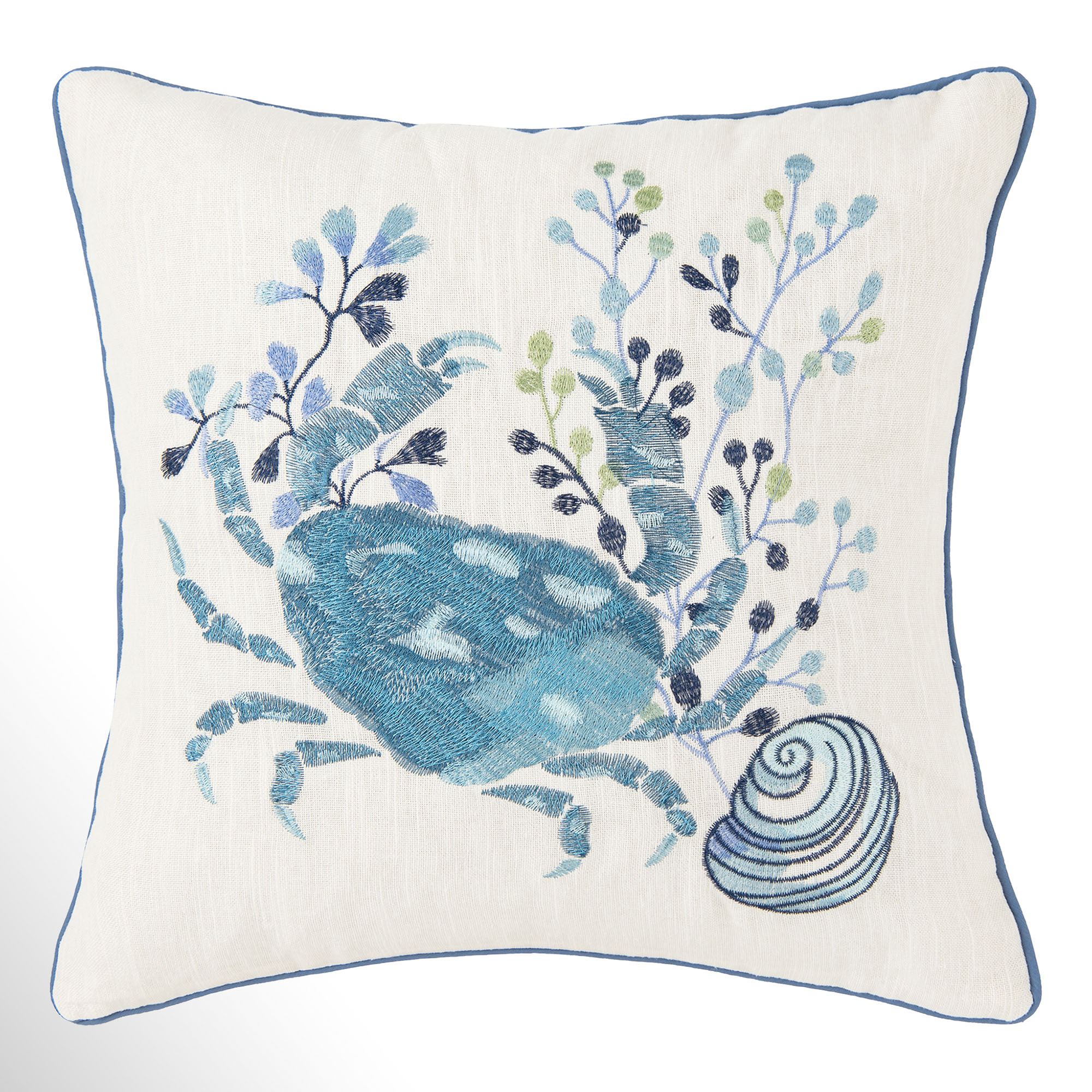 Pillows have polyester fill. Spot clean. Square features embroidered coordinating motifs on a slubbed ivory, linen/cotton blend with piped edges; zipper closure. Imported/USA. Specify Seahorse, Sea Turtle, or Crab. Reversible Starfish is a sea glass-hued cotton accented with tufted dots.