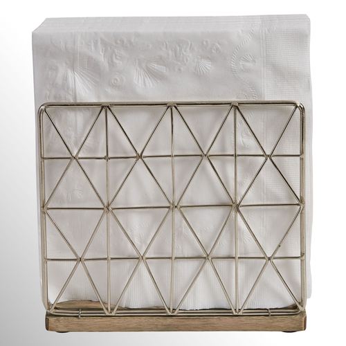 The geometric detailing of the Crestwood Napkin Holder charms your kitchen space. With openwork triangular motifs, silver metal sides hold your napkins on a gray rubbed wood base. Overall, the napkin holder measures 6"Wx2"Dx5.5"H.