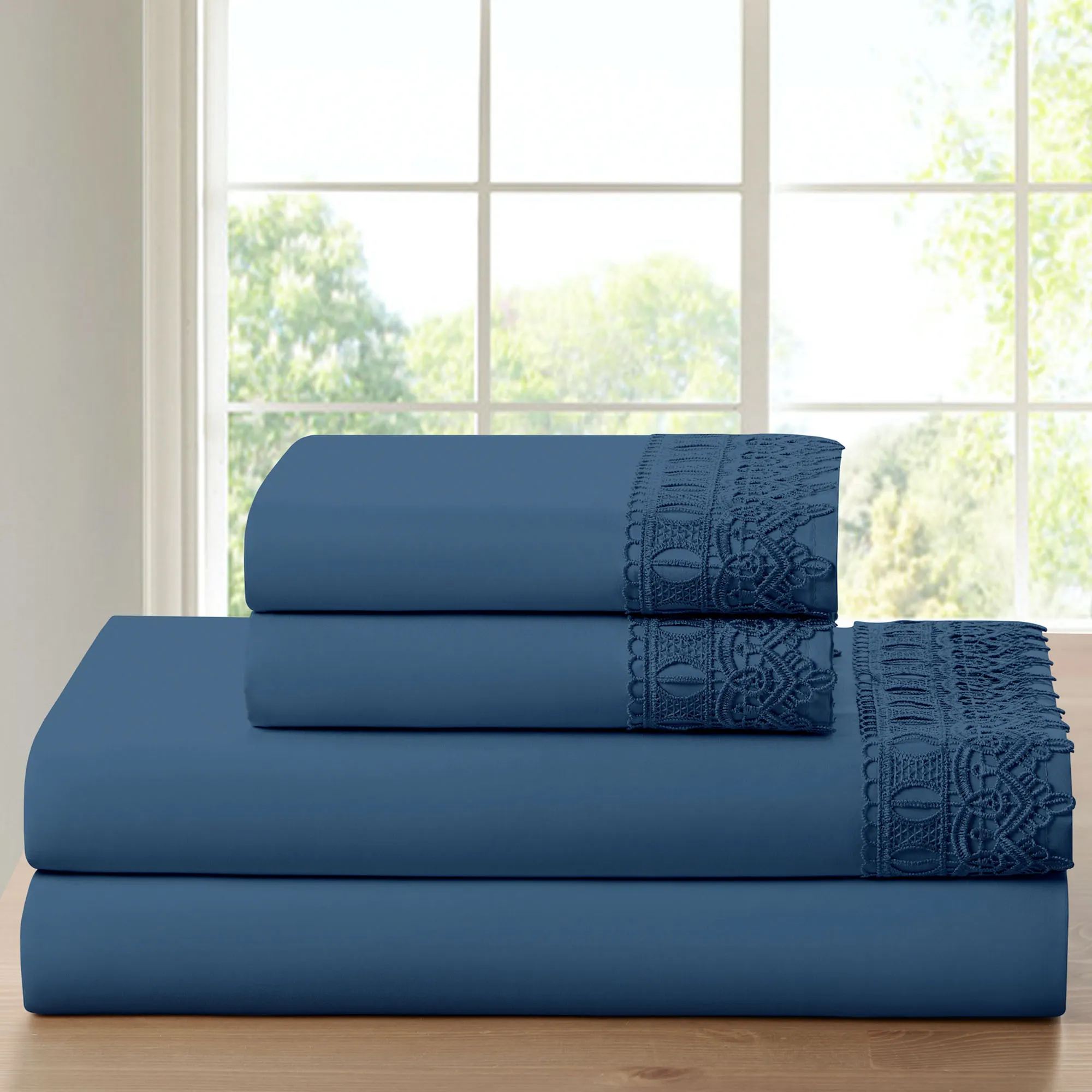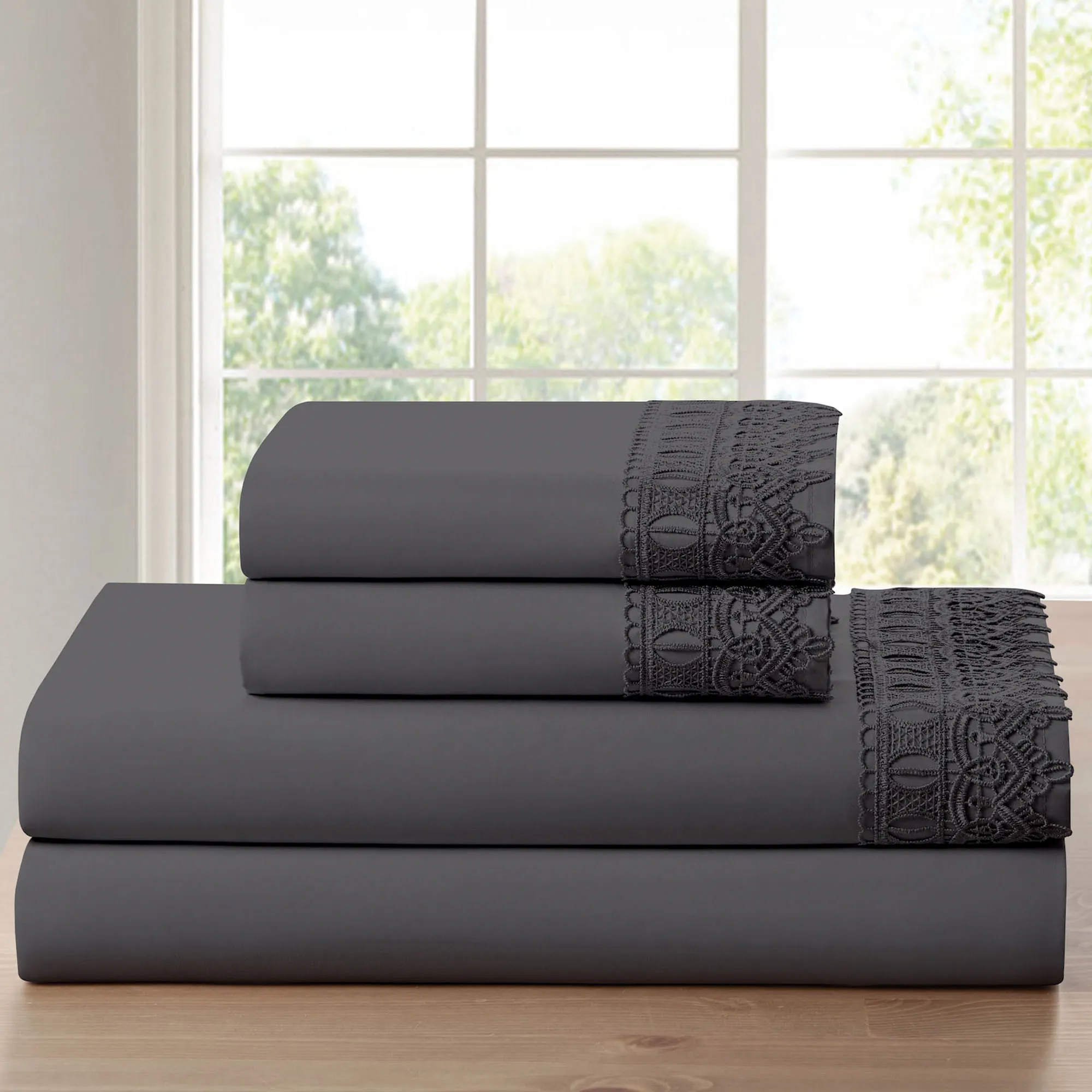 The solid color Crochet Lace Sheet Set adds classic beauty to any bedding ensemble. The hypoallergenic, polyester microfiber/bamboo moisture-wicking sheets, from Bamboo Comfort, are wrinkle-resistant. The flat sheet and pillowcase(s) have a 4.5" crochet lace overlay. The fitted sheet has elastic all around and 16" deep pockets to fit up to an 18" deep mattress. Machine washable. Imported.