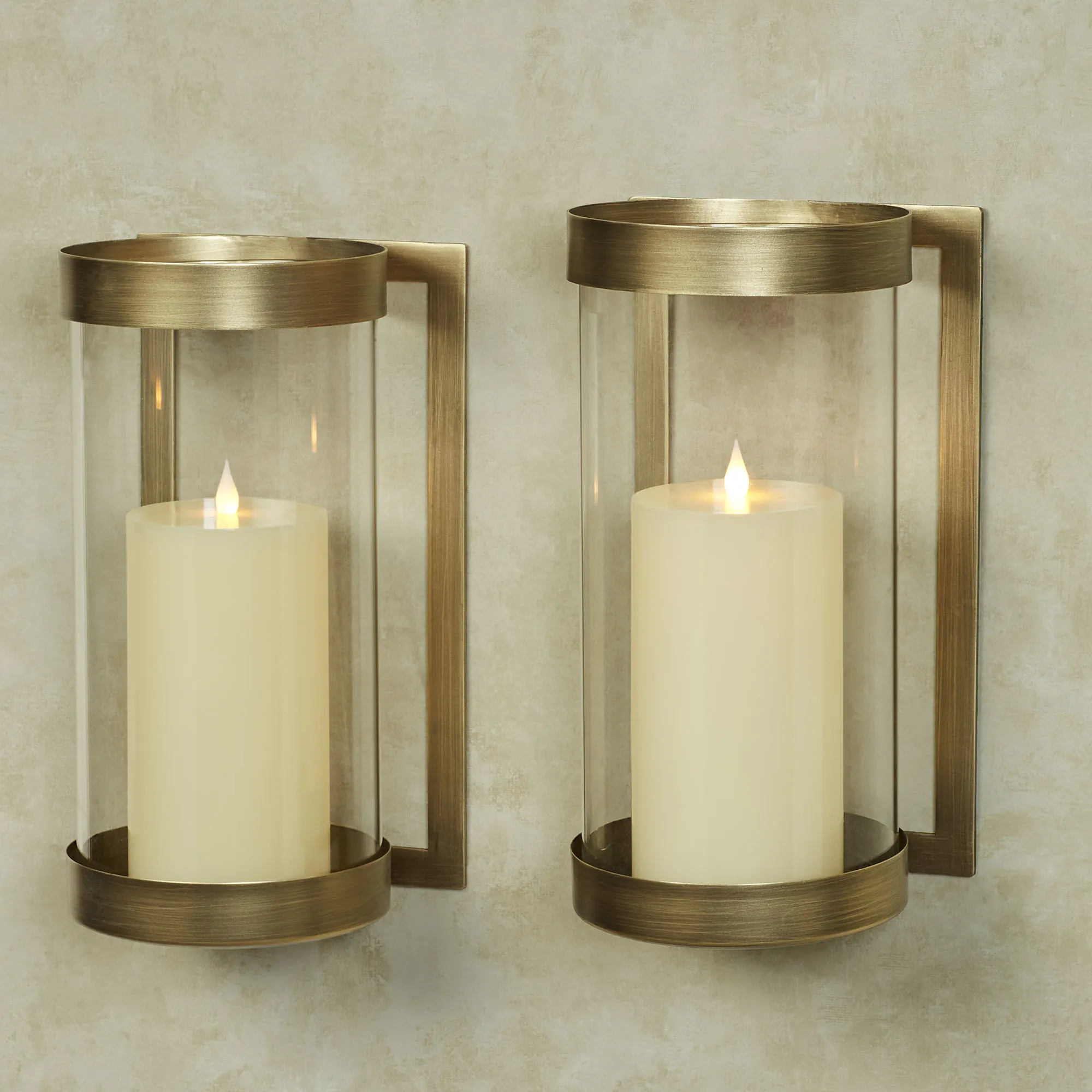 The sleek look of the Crosce Wall Sconce Pair is modern in style. Made of metal, these wall sconces each have a rectangular back frame, a satin brass finish, and a clear glass hurricane that protects your candle, up to 5" dia., from drafts. Each Large Sconce is 9"Wx6.5"Dx18.5"H and has a 5.75"dia.x18"H hurricane; pair weighs approx. 10 lbs. Each Small Sconce is 7"Wx6.5"Dx12.5"H and has a 5.75"dia.x12.25"H hurricane.