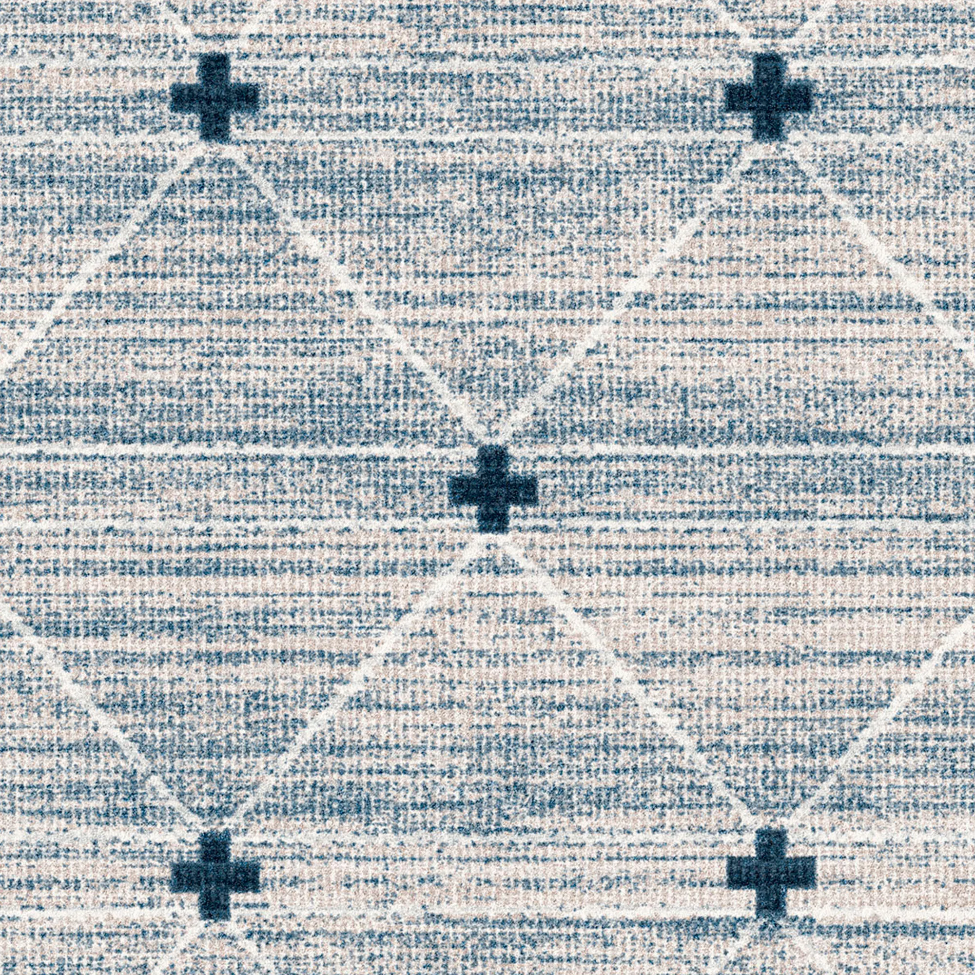 Stripes, a lattice pattern, and Cross Ties become the focal point of this rug. The power-loomed nylon area rug, .375" thick, has a modern style and a clean texture. Durable rug is kid- and pet-friendly and stain- and warp-resistant. The blue coloration includes shades of parchment, ivory, off-white, light cream, natural, blue, and beige. Backing is polypropylene. We recommend professional cleaning by a rug cleaner.