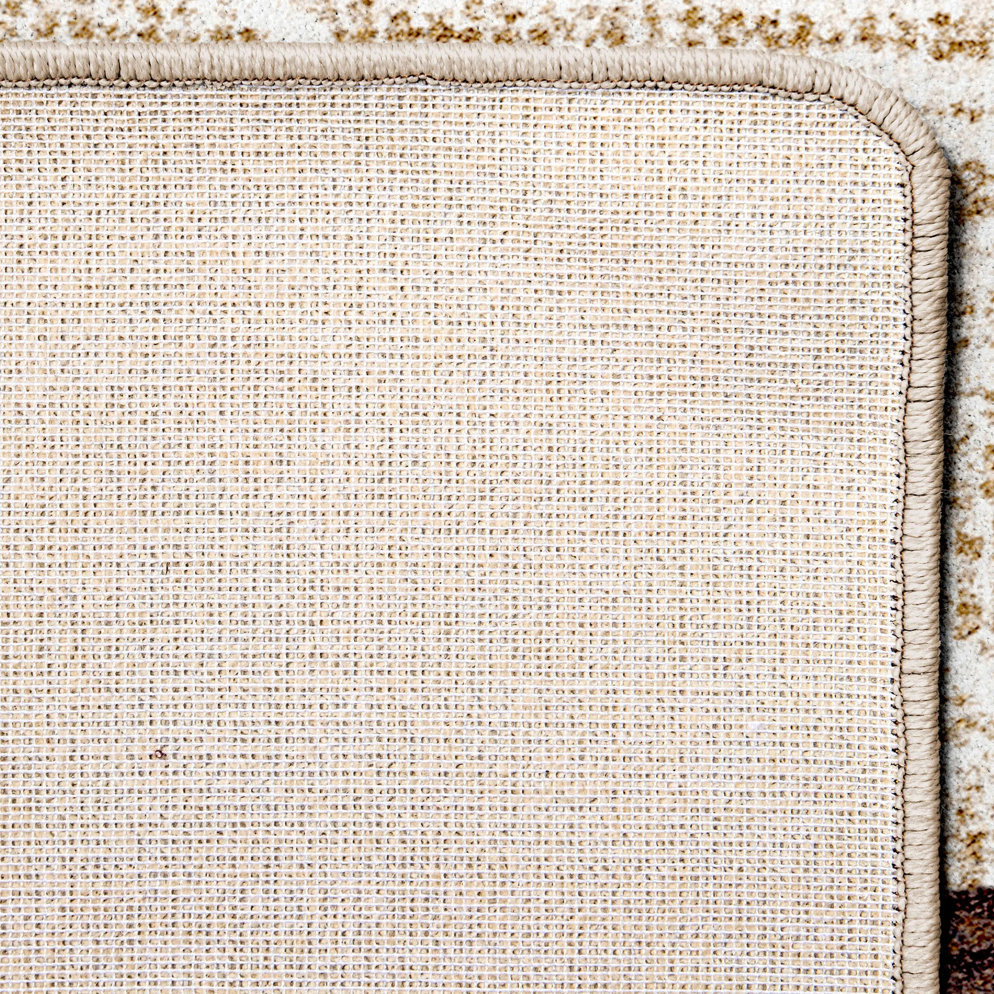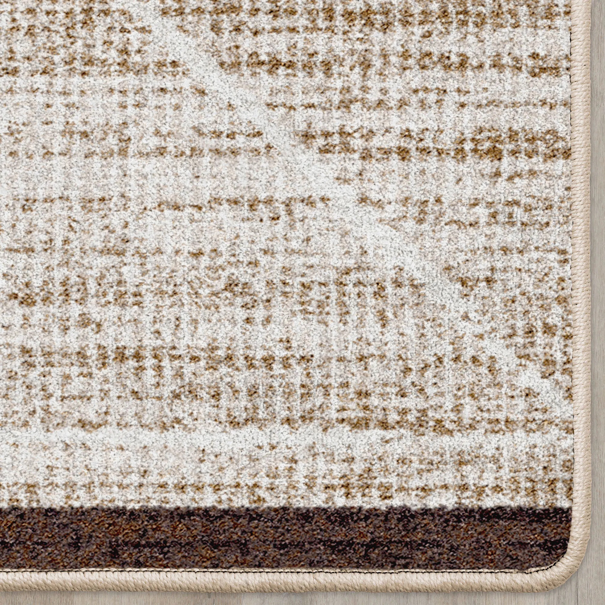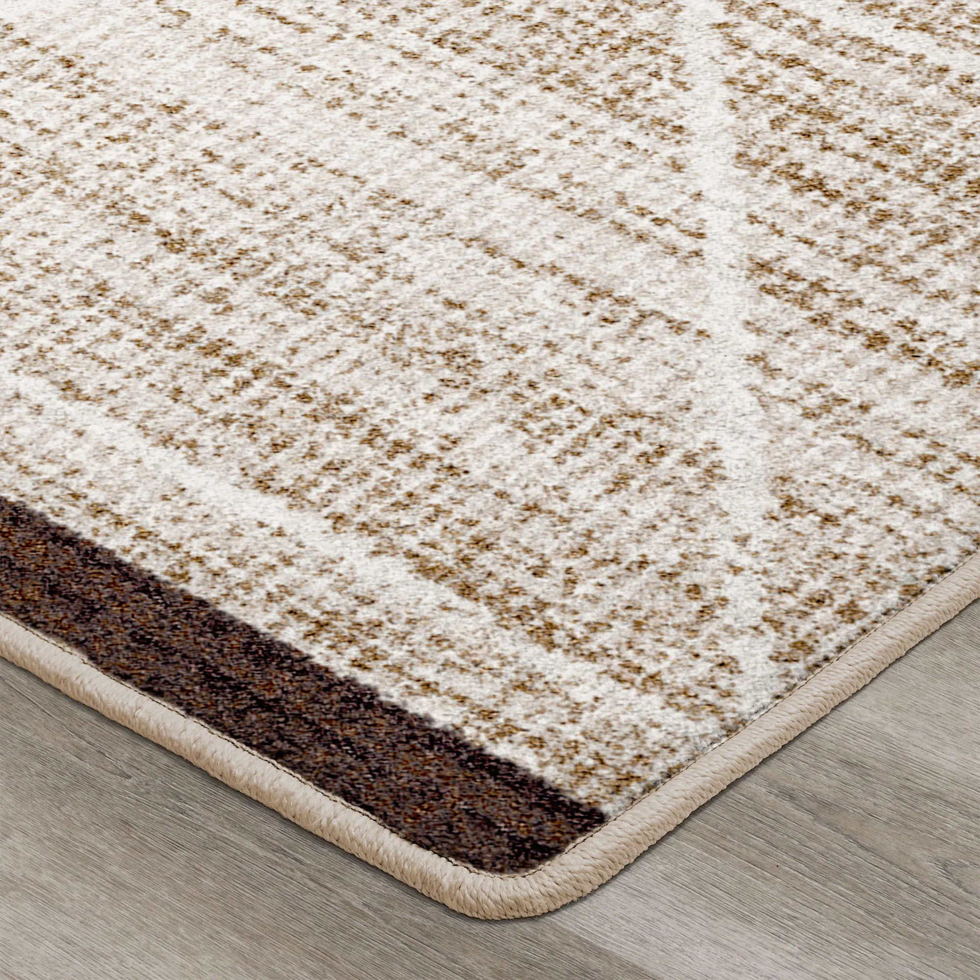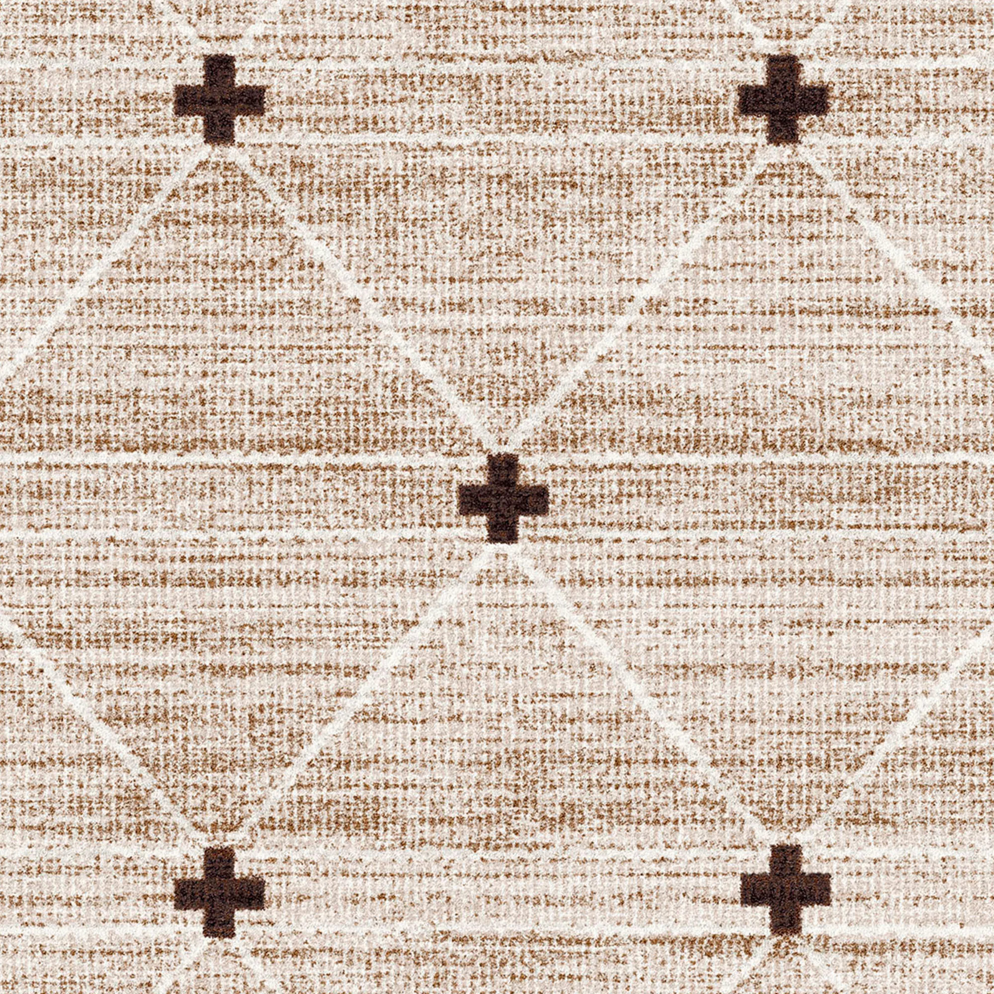 Stripes, a lattice pattern, and Cross Ties become the focal point of this rug. The power-loomed nylon area rug, .375" thick, has a modern style and a clean texture. Durable rug is kid- and pet-friendly and stain- and warp-resistant. The brown coloration includes shades of parchment, off-white, ivory, taupe, buff, brown, latte, and camel. Backing is polypropylene. We recommend professional cleaning by a rug cleaner.