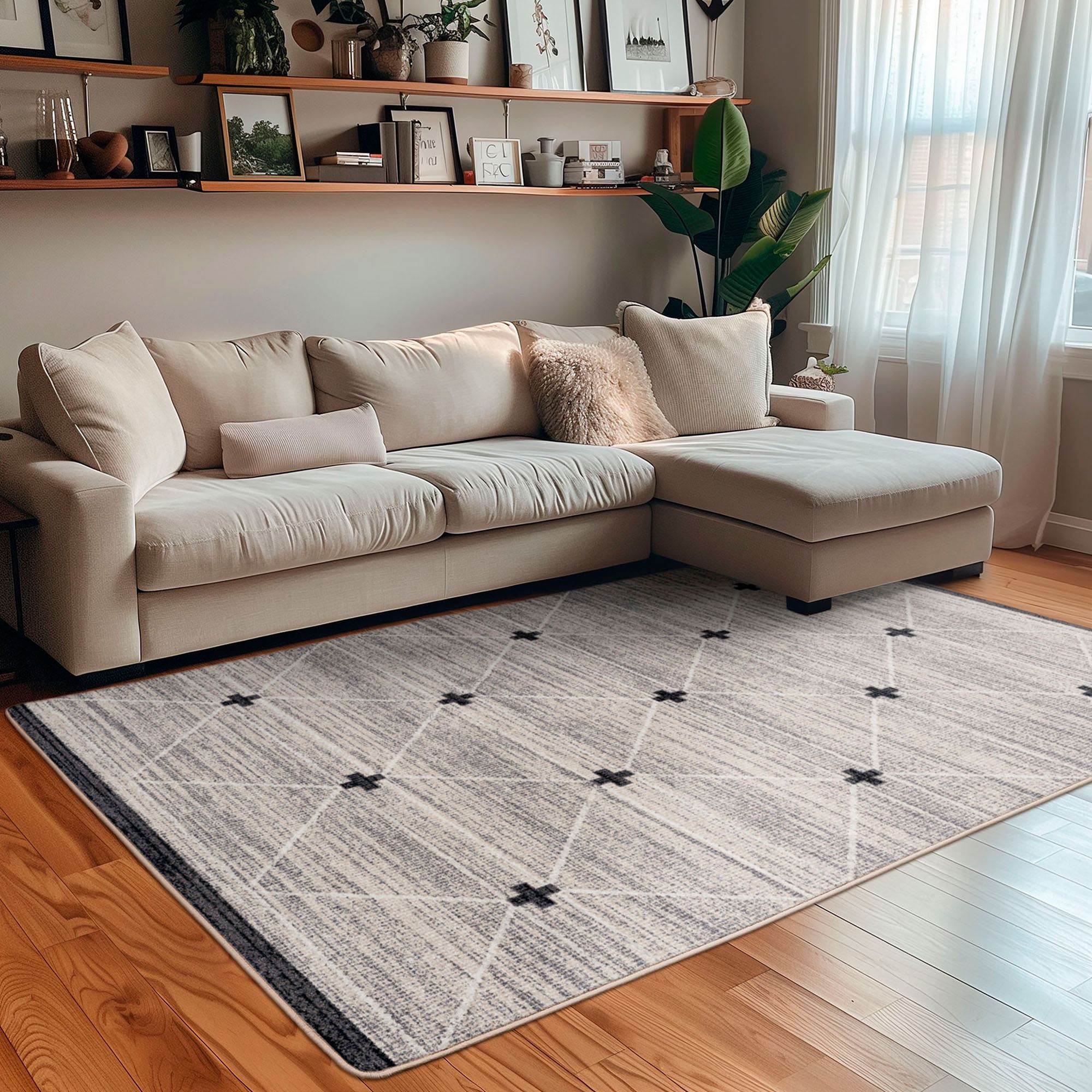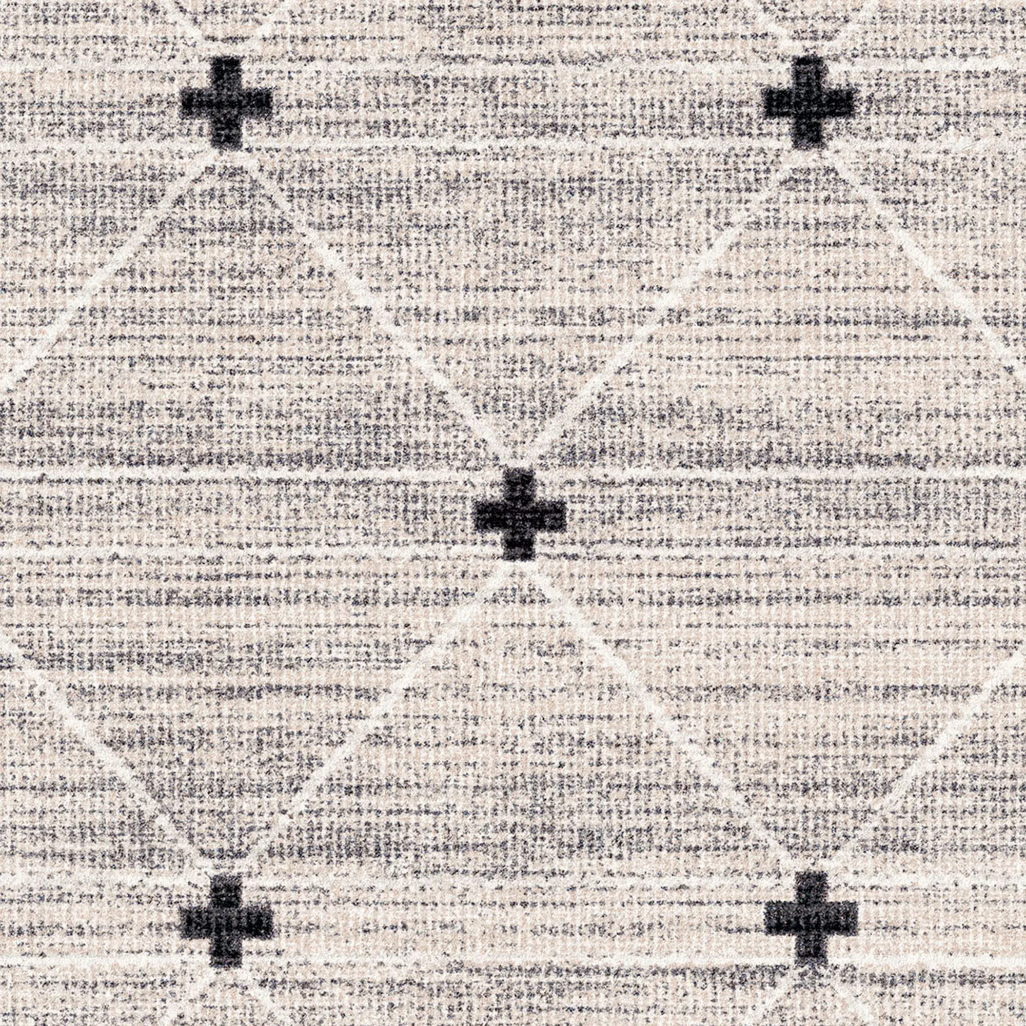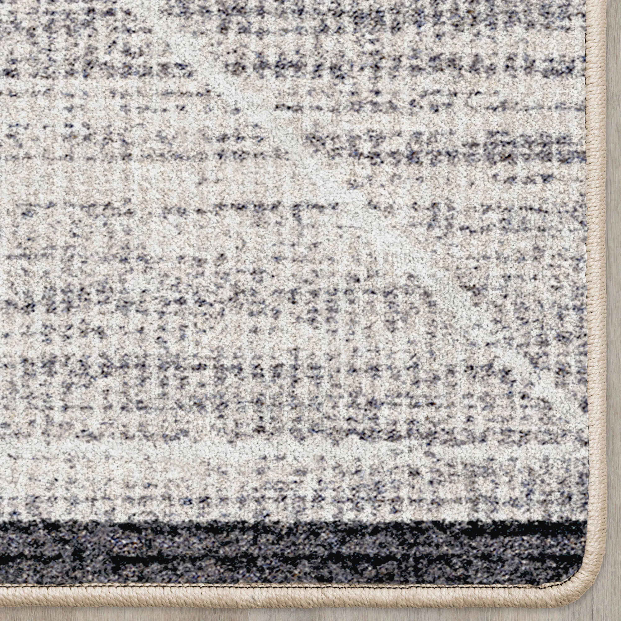 Stripes, a lattice pattern, and Cross Ties become the focal point of this rug. The power-loomed nylon area rug, .375" thick, has a modern style and a clean texture. Durable rug is kid- and pet-friendly and stain- and warp-resistant. The charcoal coloration includes shades of parchment, ivory, off-white, light cream, black, and gray. Backing is polypropylene. We recommend professional cleaning by a rug cleaner.