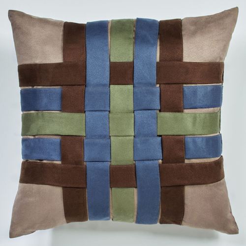 Overlapping, solid color strips Crossover one another on this decorative pillow for an intriguing display. Made of polyester faux suede, this tailored, 18" square pillow has a modern design. The sand coloration includes shades of indigo, chocolate, and deep sage with a sand backing. Fill is polyester. Spot clean. Imported.