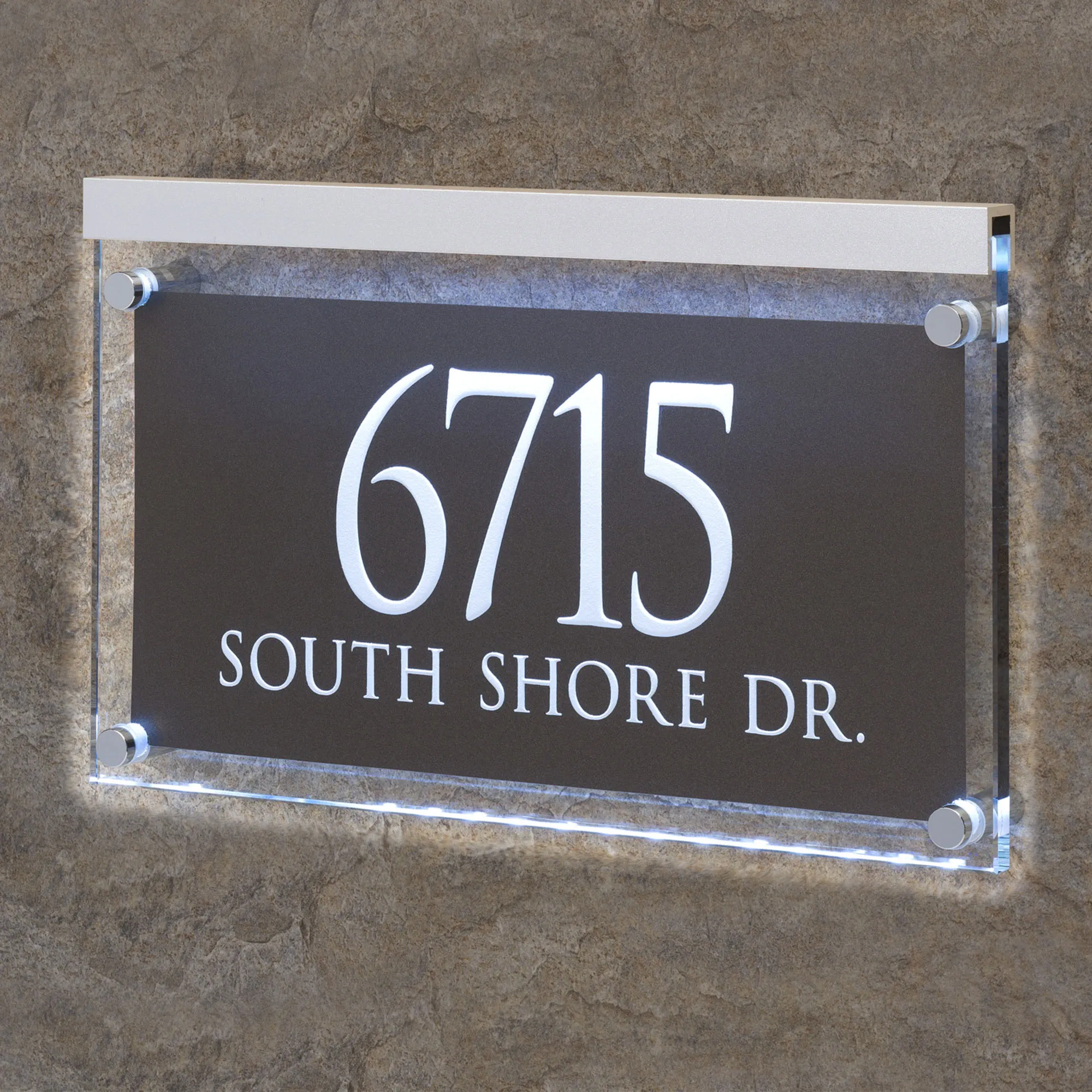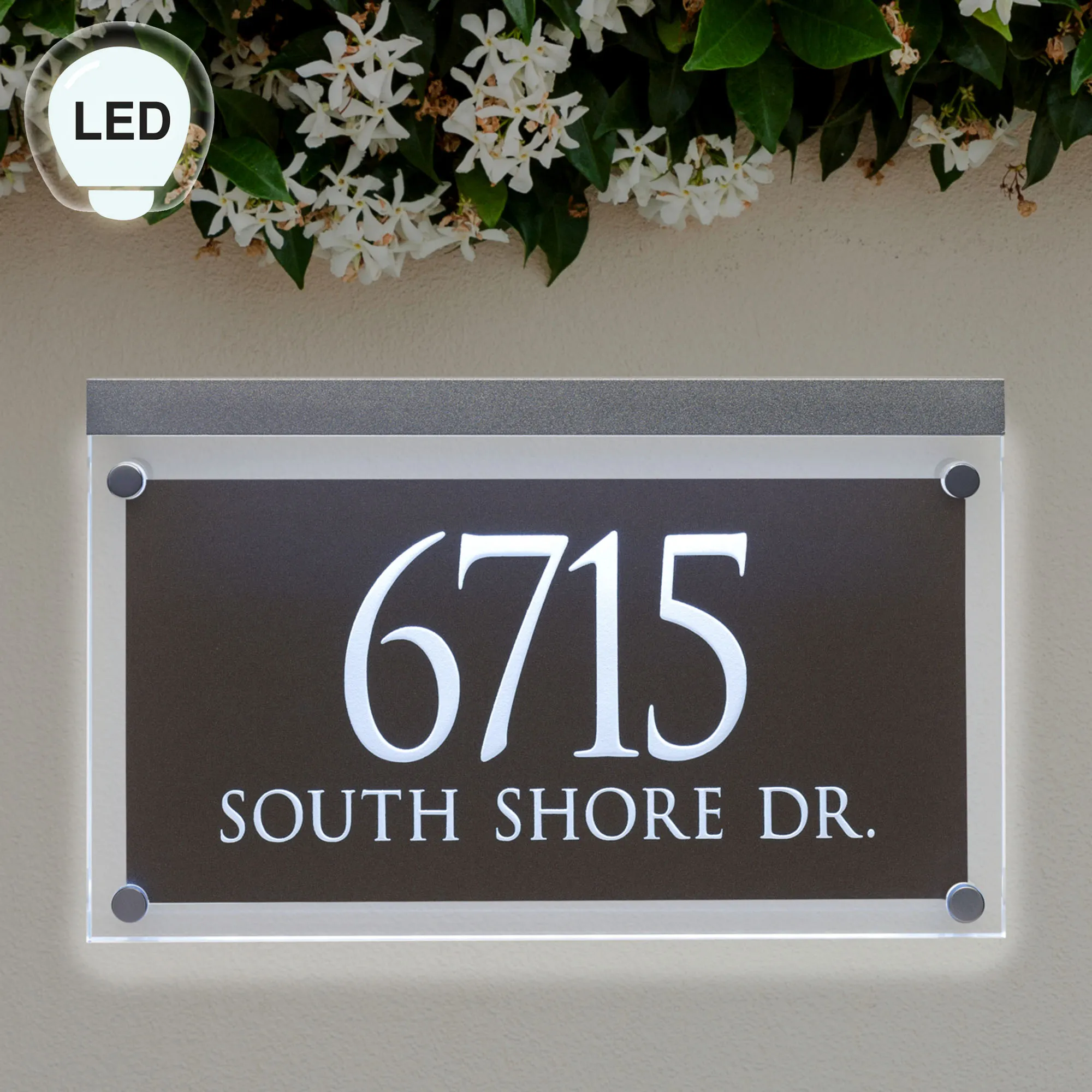 The Crystal LED Lighted Address Wall Sign is acrylic. Made in the USA.