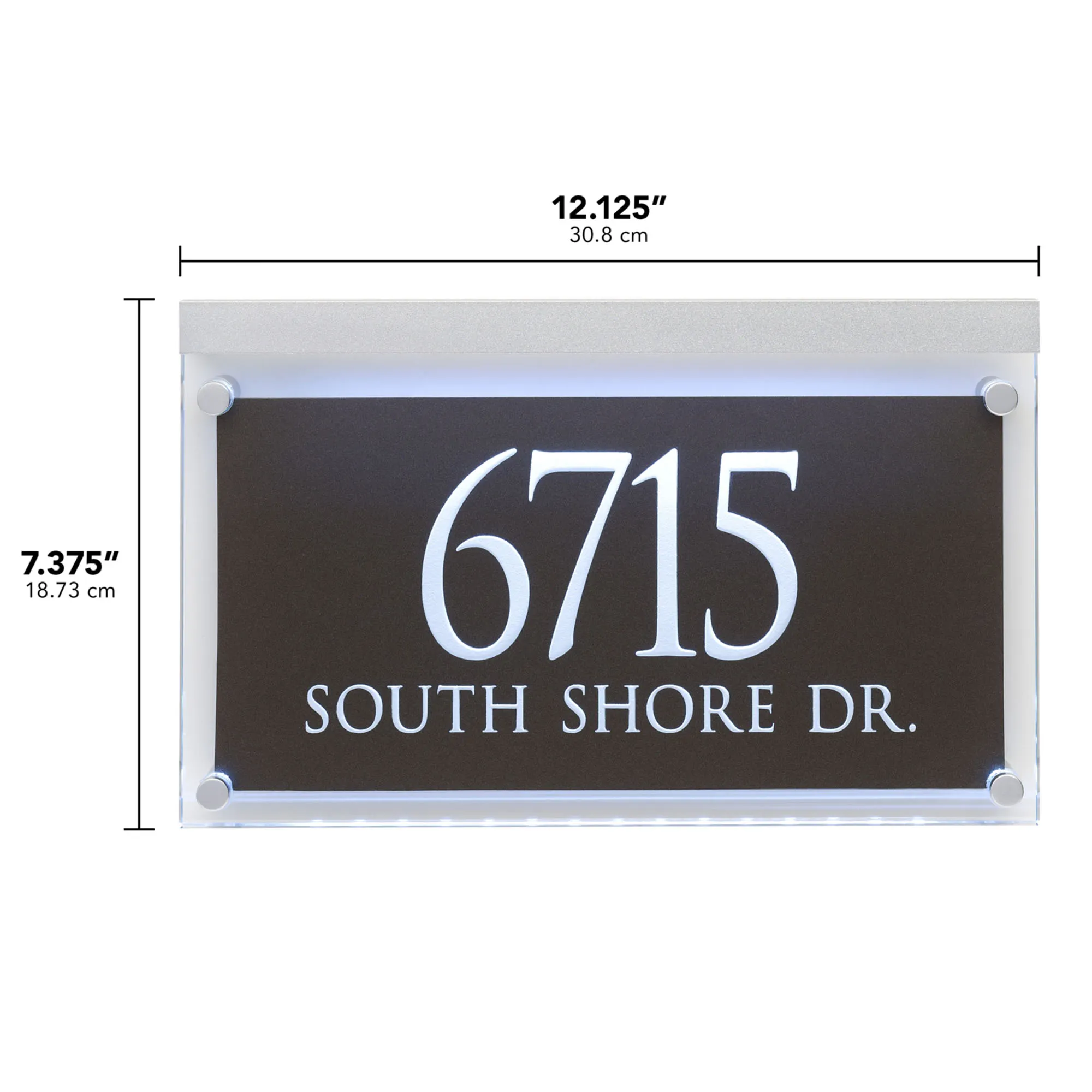 The Crystal LED Lighted Address Wall Sign displays your information with a pristine, luxurious flair. Handcrafted from polished acrylic faux crystal, the mounted address sign features sleek letters and numbers deeply engraved into the clear surface, which is then highlighted with black weatherproof paint to make the characters boldly stand out. Your personalized information features a bold top line with up to seven 3"H characters and a smaller bottom line with up to twenty .75"H characters. Encased in a metallic silver-finished bar at the top, LED lighting shines down on the plaque, boosting the high-contrast design to make your details visible even through the night. Mounting pin hardware, wires, and an AC adapter are included. Perfect for hanging in a porch, patio, or covered outdoor area, the lighted address wall sign measures 12"Wx1.5"Dx7.5"H overall.