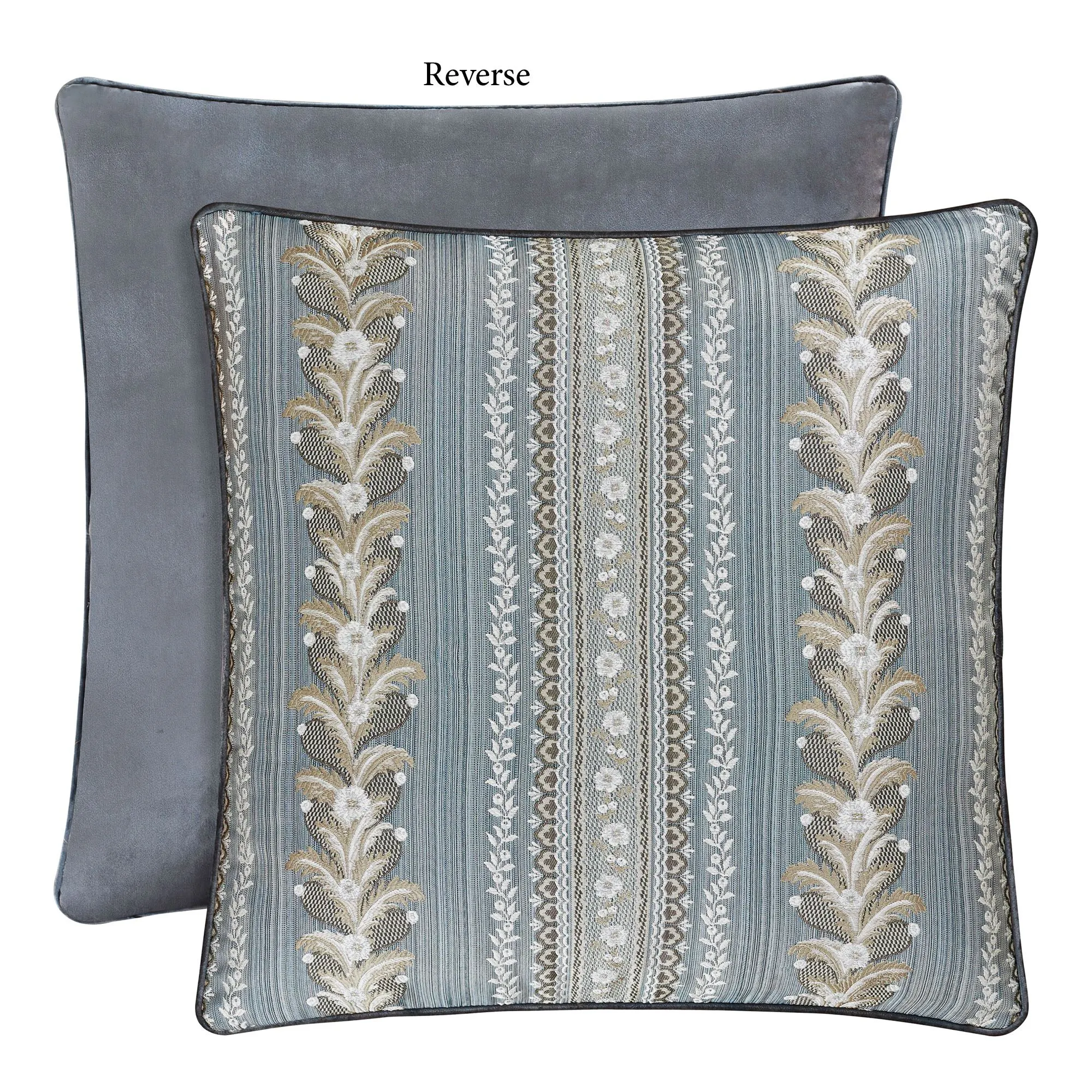 European Sham contains coordinating stripes, piped edges, an all-over steel blue velveteen reverse, and a zipper closure.