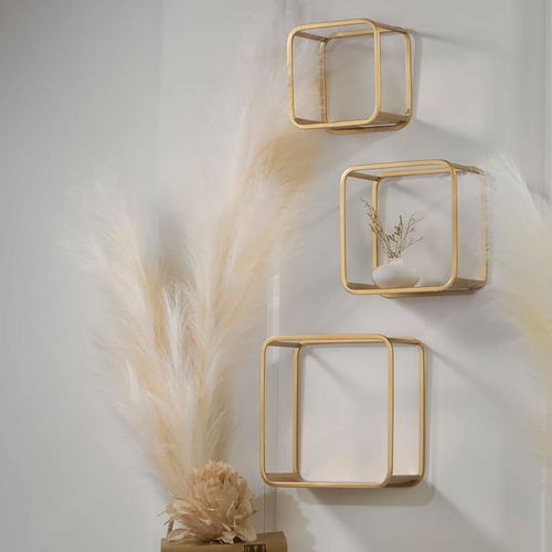 Display in any configuration to get the most use out of the Cube Wall Shelf Set. These modern shelves are made of metal, have an openwork design, and feature a stunning gold finish. Small is 7"sq.x4.5"D; medium is 8.5"sq.x4.5"D; and large is 10"sq.x4.5"D.