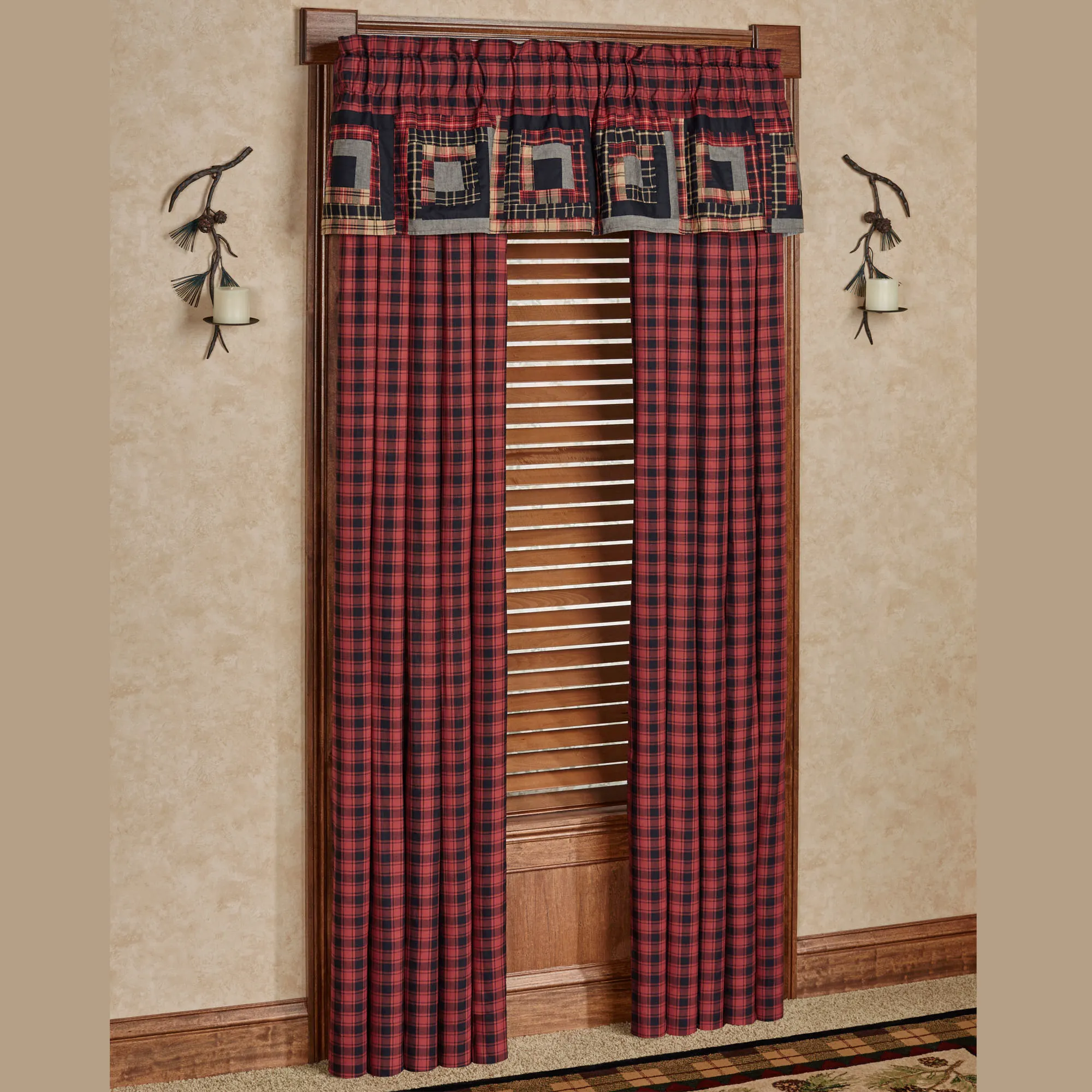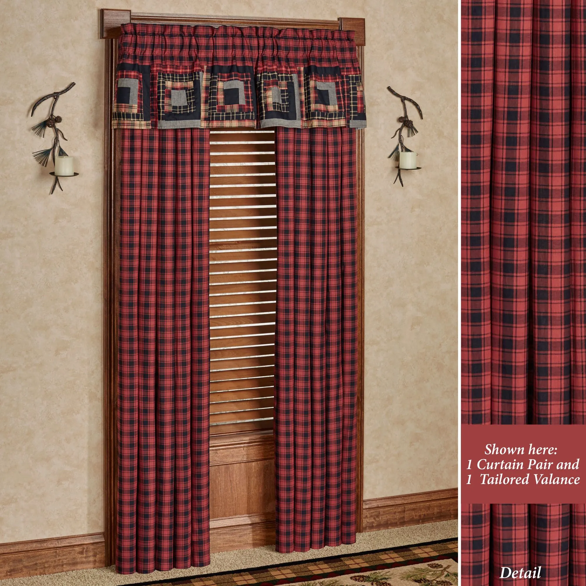 The Cumberland Rustic Plaid Window Treatment from Oak & Asher invokes a hearty traditional style. The lined, pure cotton window treatments have tailored edges, 3.25" rod pockets, and 3.25" back tabs. Specify Curtain Pair or Valance. Curtains are red and black plaid and include tiebacks. Valance has a red and black plaid top pieced with coordinating squares on the bottom. The bottom of the valance features various black, camel, and red plaid designs pieced with solid black and gray bands to create square designs with stitch-in-the-ditch quilting. Machine washable. Imported. Due to the handmade nature of this product, slight variations may occur. The curtain pair width is the total width of two panels together.