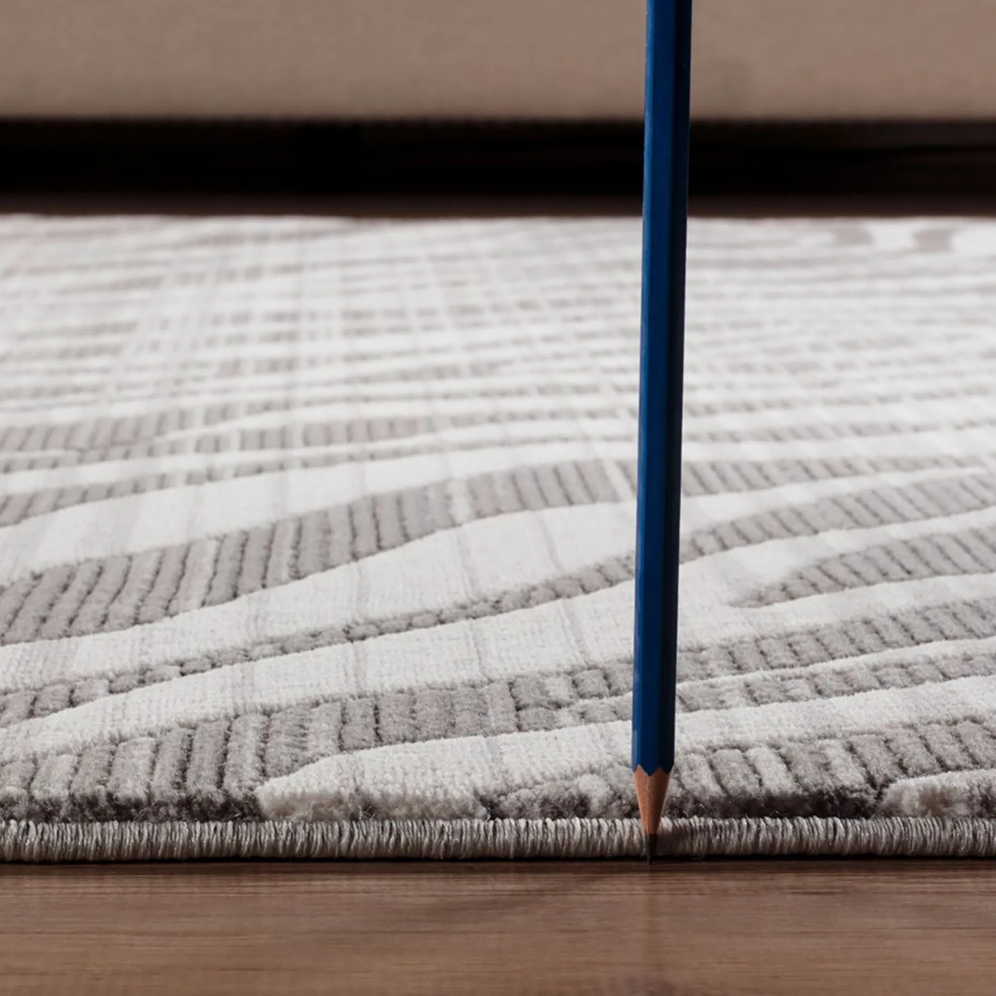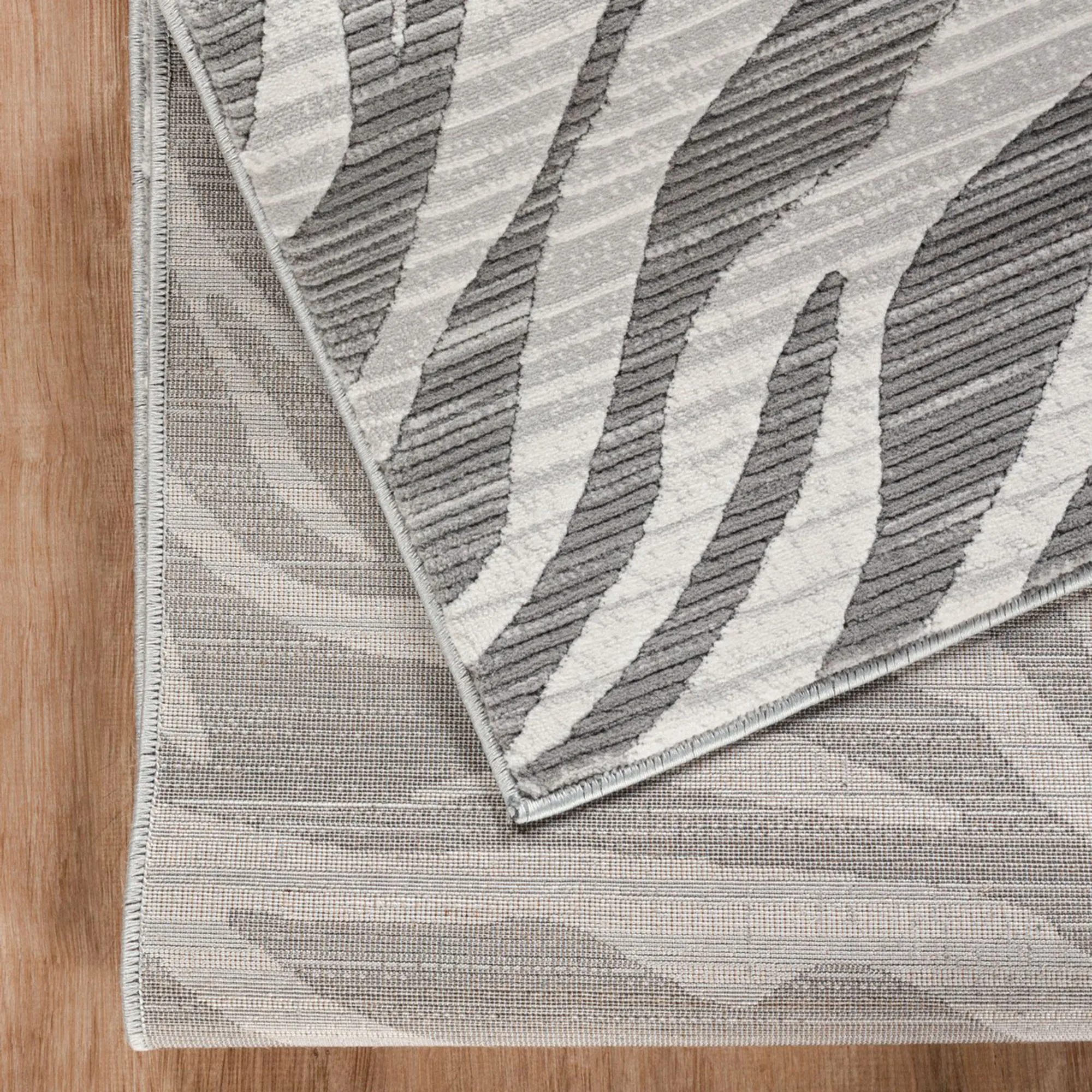 The carved zebra pattern on the Cyra Rug adds character to any space. This power-loomed polyester area rug, .43" thick, features a textured animal stripe design with a subtle hairline stripe pattern for a distressed look. Colors include shades of taupe, ivory, off-white, gray, charcoal, and linen. Backing is jute. We recommend professional cleaning by a rug cleaner. Imported.