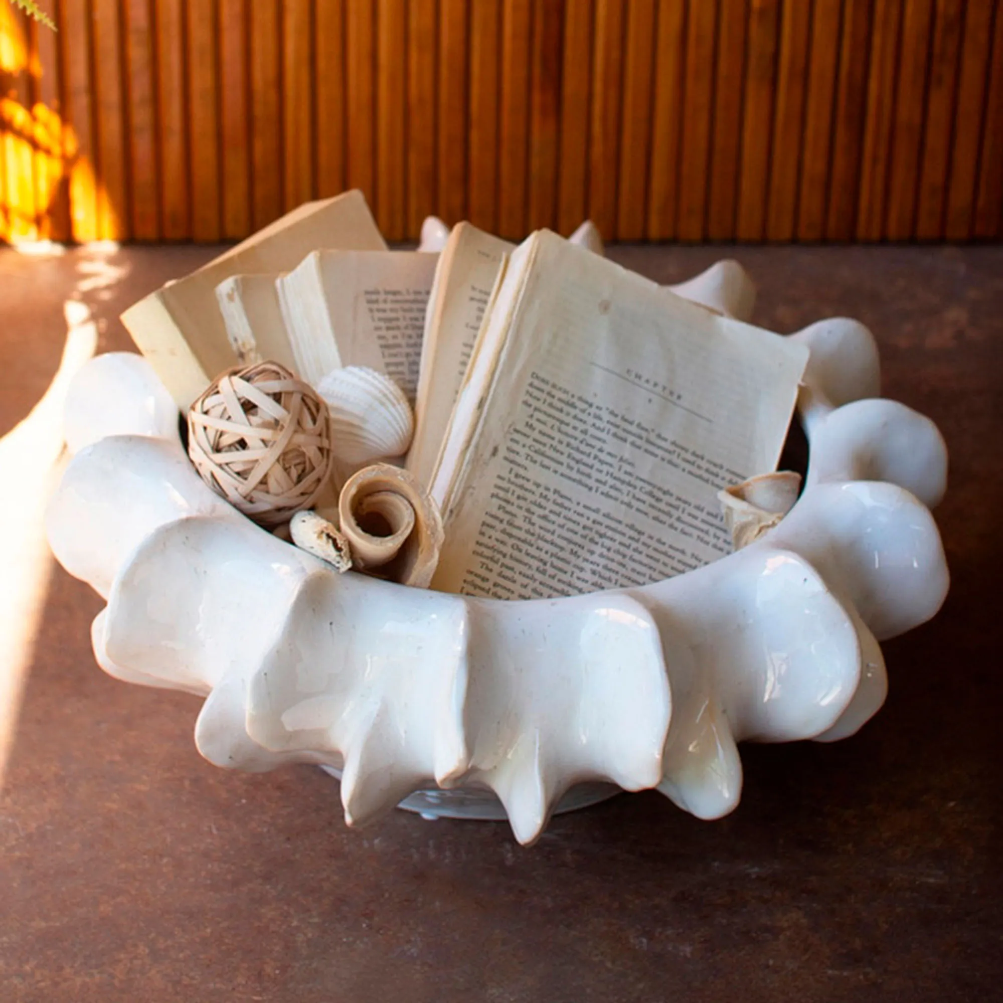 The Dahlia Ruffle Centerpiece Bowl is ceramic.