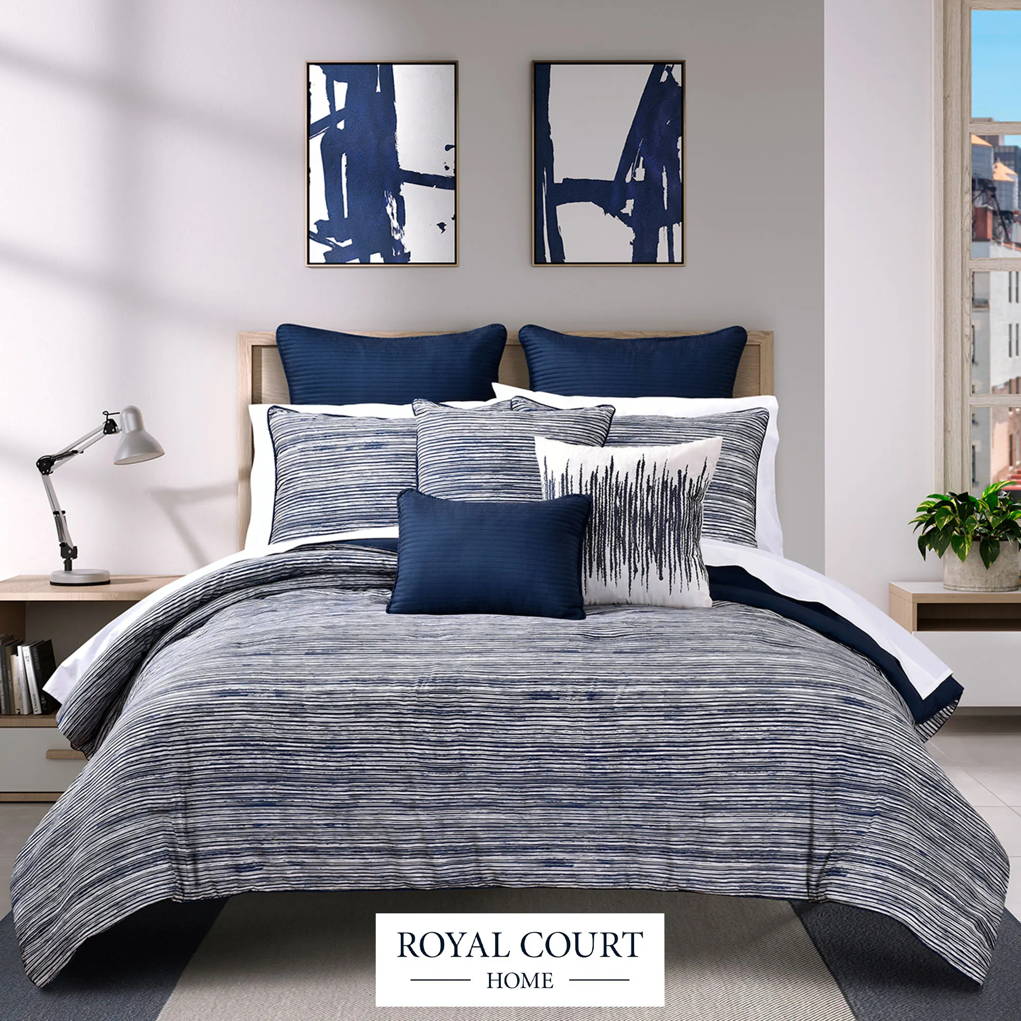 Navy and off-white craft a modern graphic appeal upon the Dalton Comforter Bedding from Royal Court. The Comforter Set includes a comforter and shams. The printed polyester bedding features an abstract linear design of varying horizontal stripes. Comforter is backed in navy polyester. Fill is polyester. Machine washable. Imported.