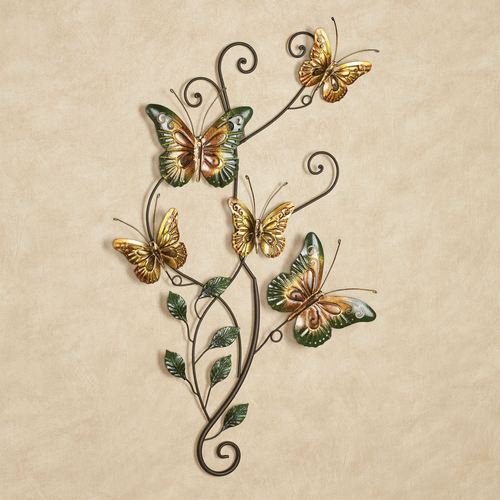 Winged creatures cheerfully flit about on the Dancing Butterflies II Wall Art. This handpainted metal wall art features golden yellow and green butterflies among scrolling tendrils of a leafy vine. Measures 17"x30".
