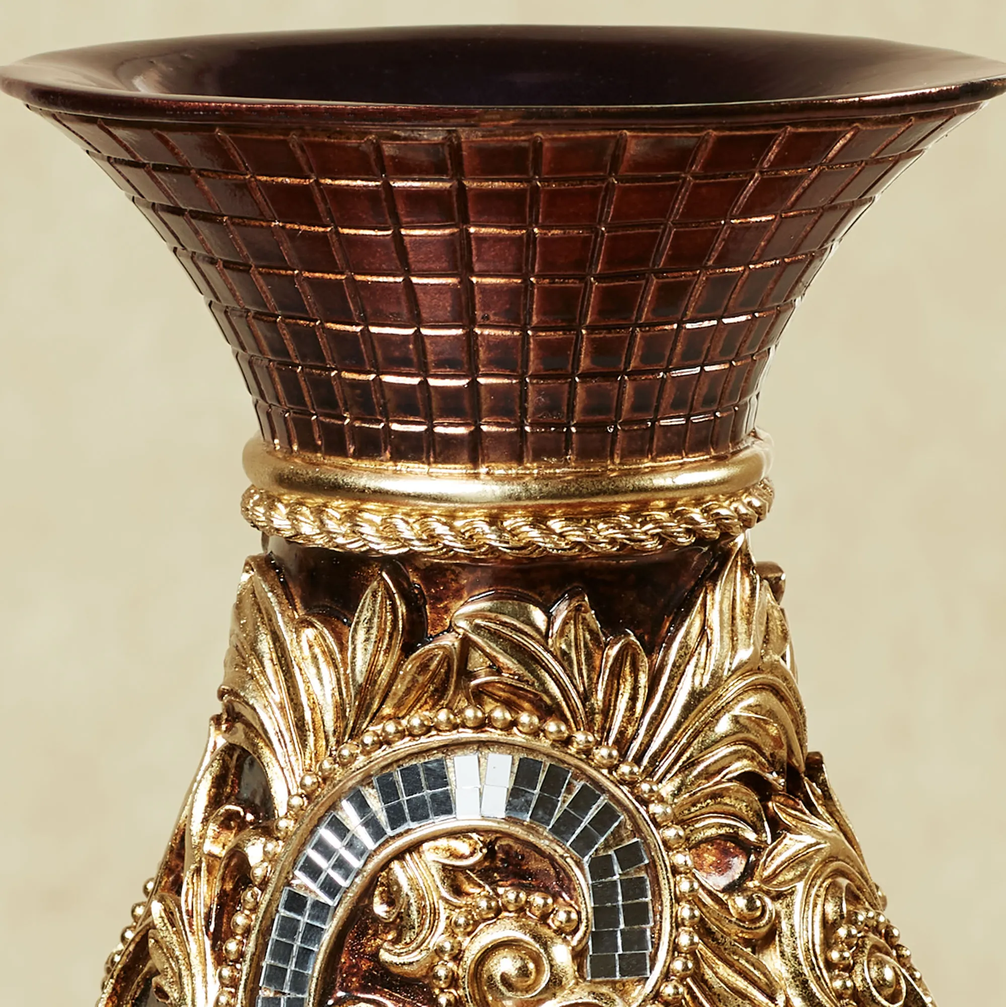 Intricate leaves, mirror glass accents, dot and square motifs, and gold designs beautifully create the look of the sophisticated Daniella Vase. This polyresin table vase features elaborate motifs on mahogany and has a darker pedestal-style base. Decorative use only. Measures 7.5"Wx6.5"Dx15"H.