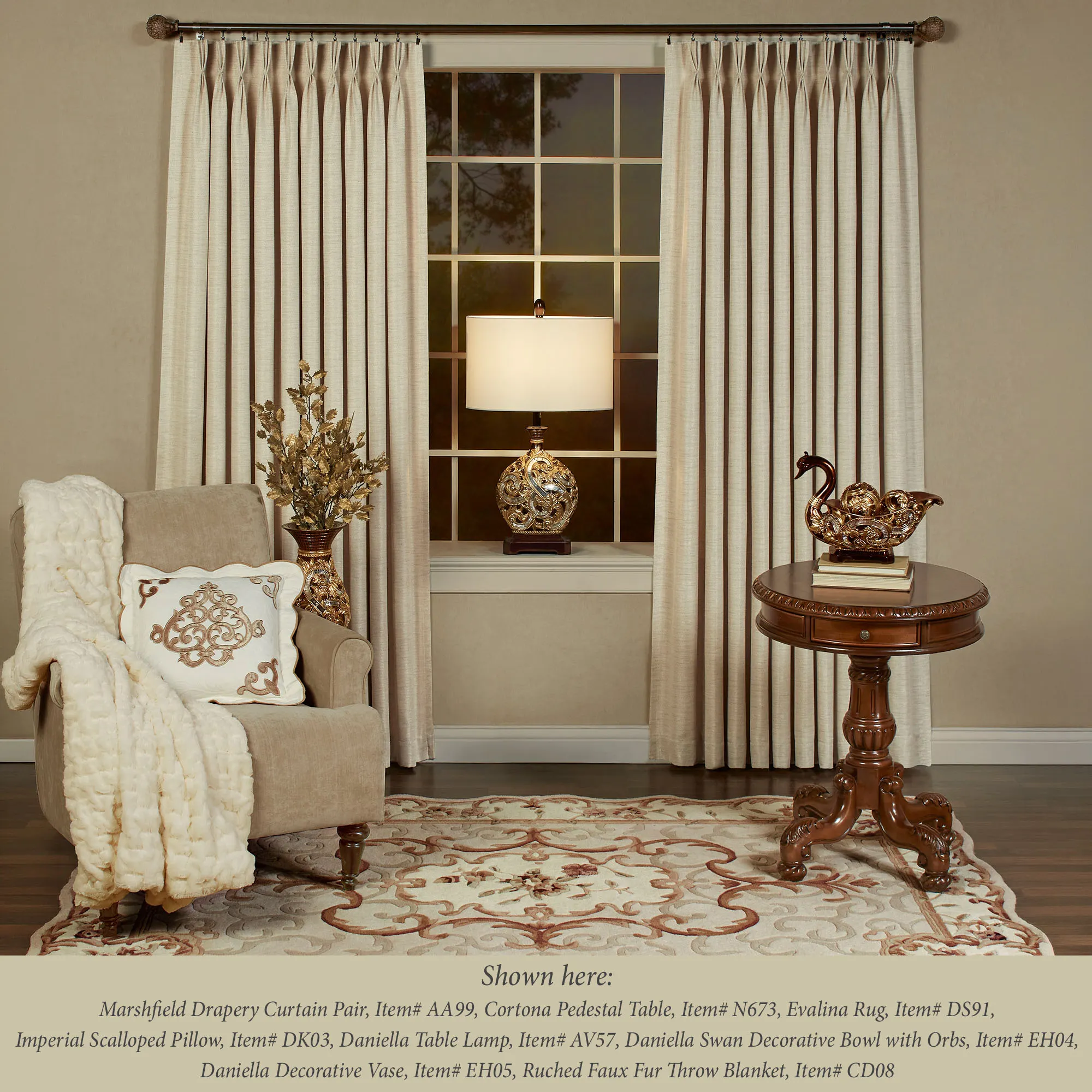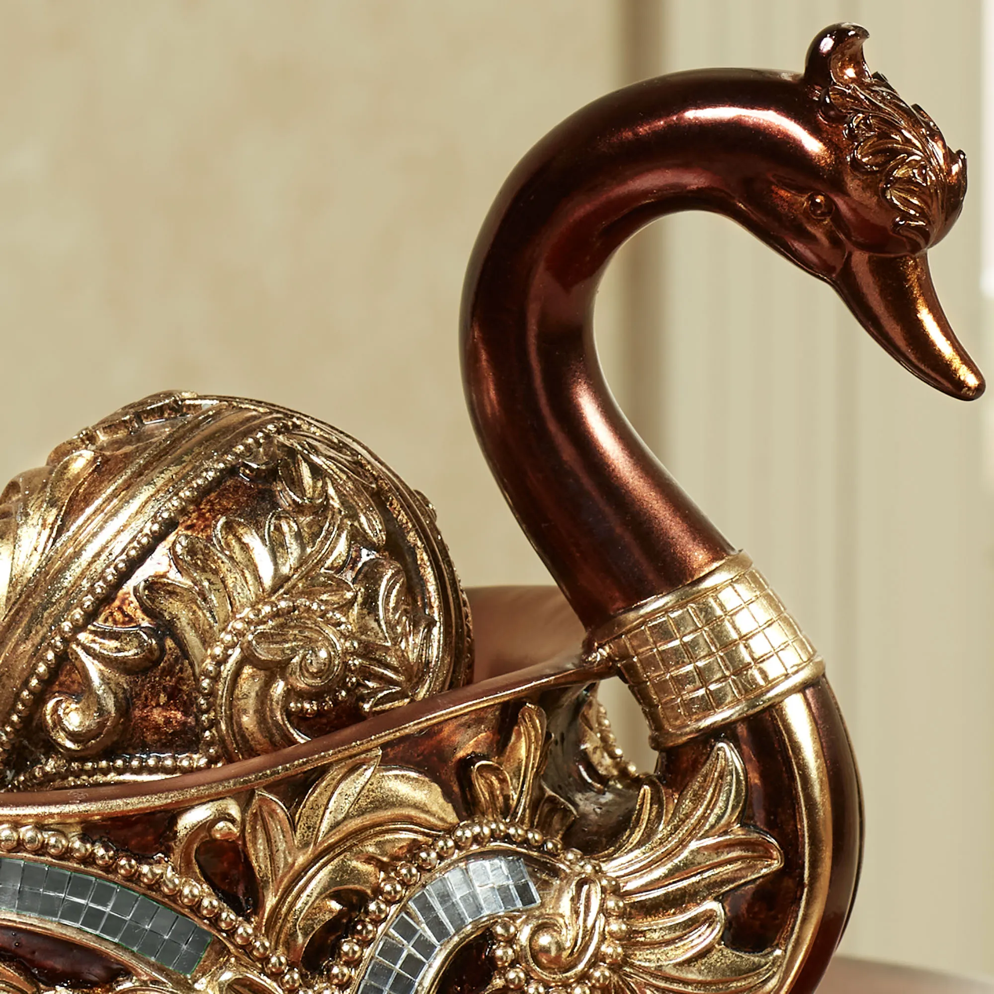 Intricate leaves, dot motifs, and gold designs beautifully create the sophisticated look of the Daniella Swan Bowl with Orbs. The polyresin swan table accent features mirrored mosaic accents, elaborate motifs on mahogany, and a darker pedestal-style base. For decorative use only. The swan-shaped centerpiece bowl measures approx. 15"Wx8.5"Dx11"H. Each coordinating orb is approx. 4" dia.