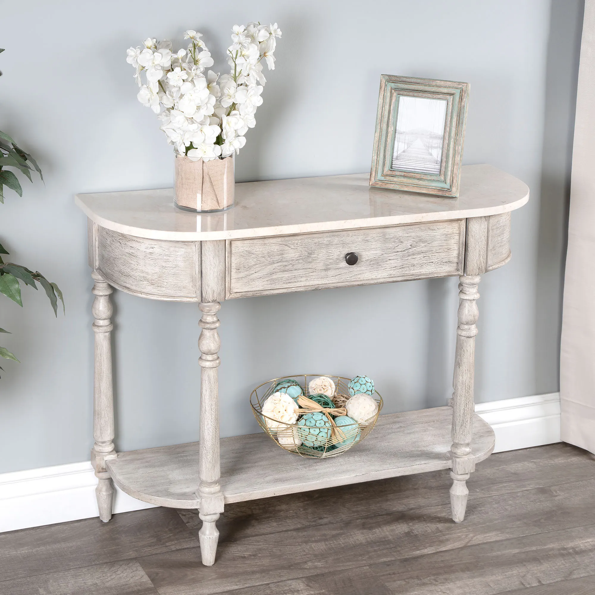 High-class charm details the Danielle Gray Console Table. With a demilune shape, the mahogany and wooden table features four beautifully hand-turned legs, a 36"Wx11.5"D bottom display shelf, and one drawer for storing your items. The drawer measures 24"Wx14"Dx5.5"H, glides with ball-bearing hardware, and has a bronze metal drawer pull. The gray finish has white, brown, and red undertones and wire brush distressing. Ivory marble provides a beautiful tabletop surface to showcase your items and pristine taste. Due to the marble's natural appearance, variations may occur. Overall, the console table measures 40"Wx14"Dx30.5"H and weighs approx. 75 lbs.