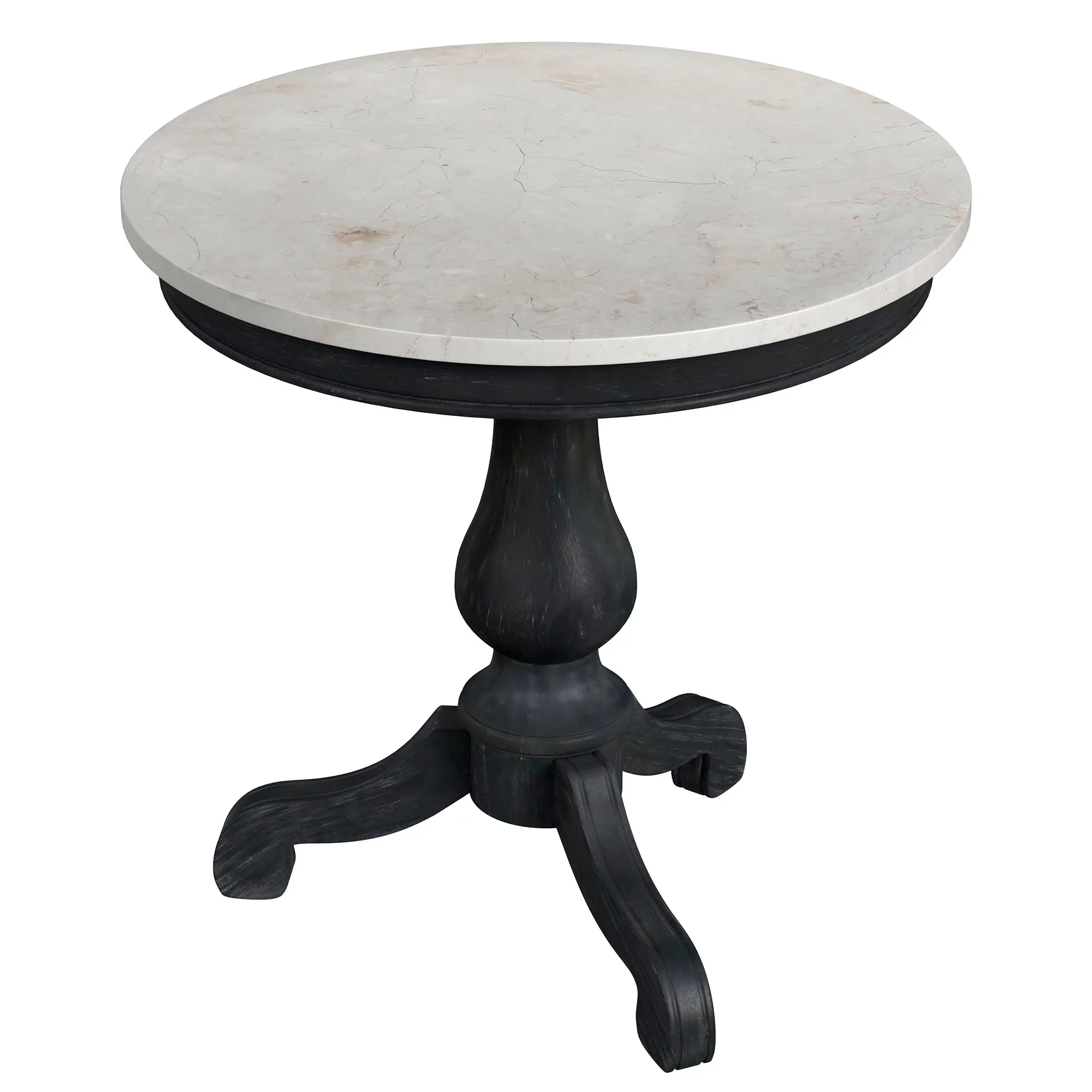Accentuate any modern setting with the Danielle Antique Black Round Accent Table. The handcarved, wooden pedestal table has a turned style, a solid mahogany wood base, an ivory marble top, and an antique black finish with wire brushed distressing. Measures 24"dia.x24"H; weighs 48 lbs.