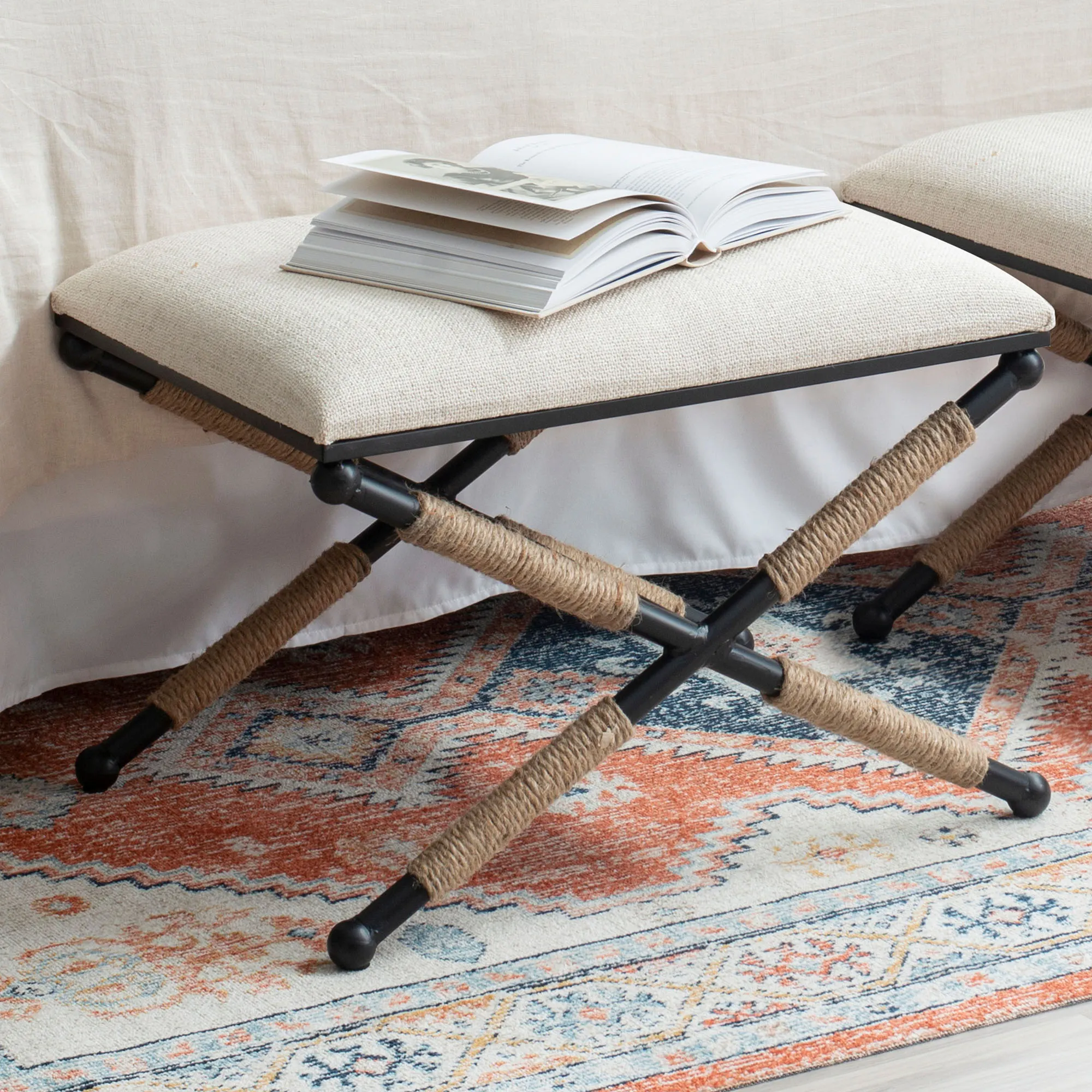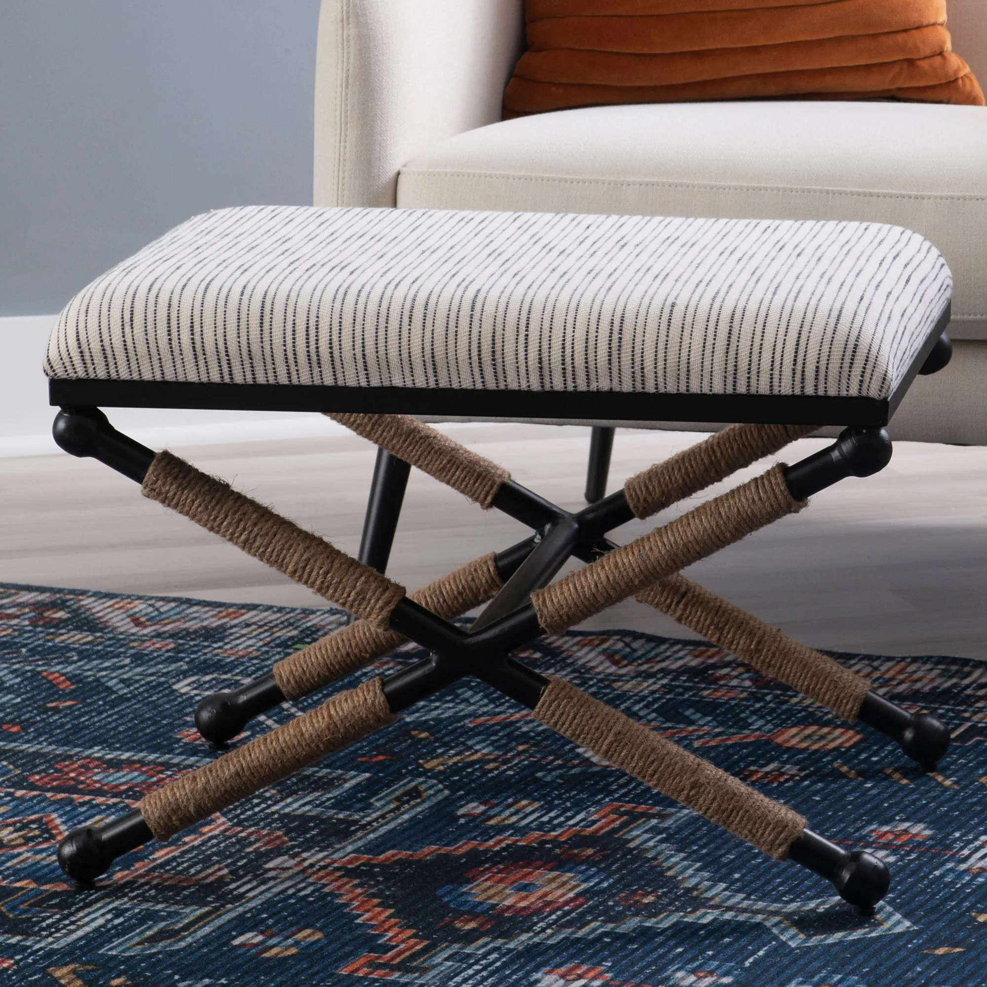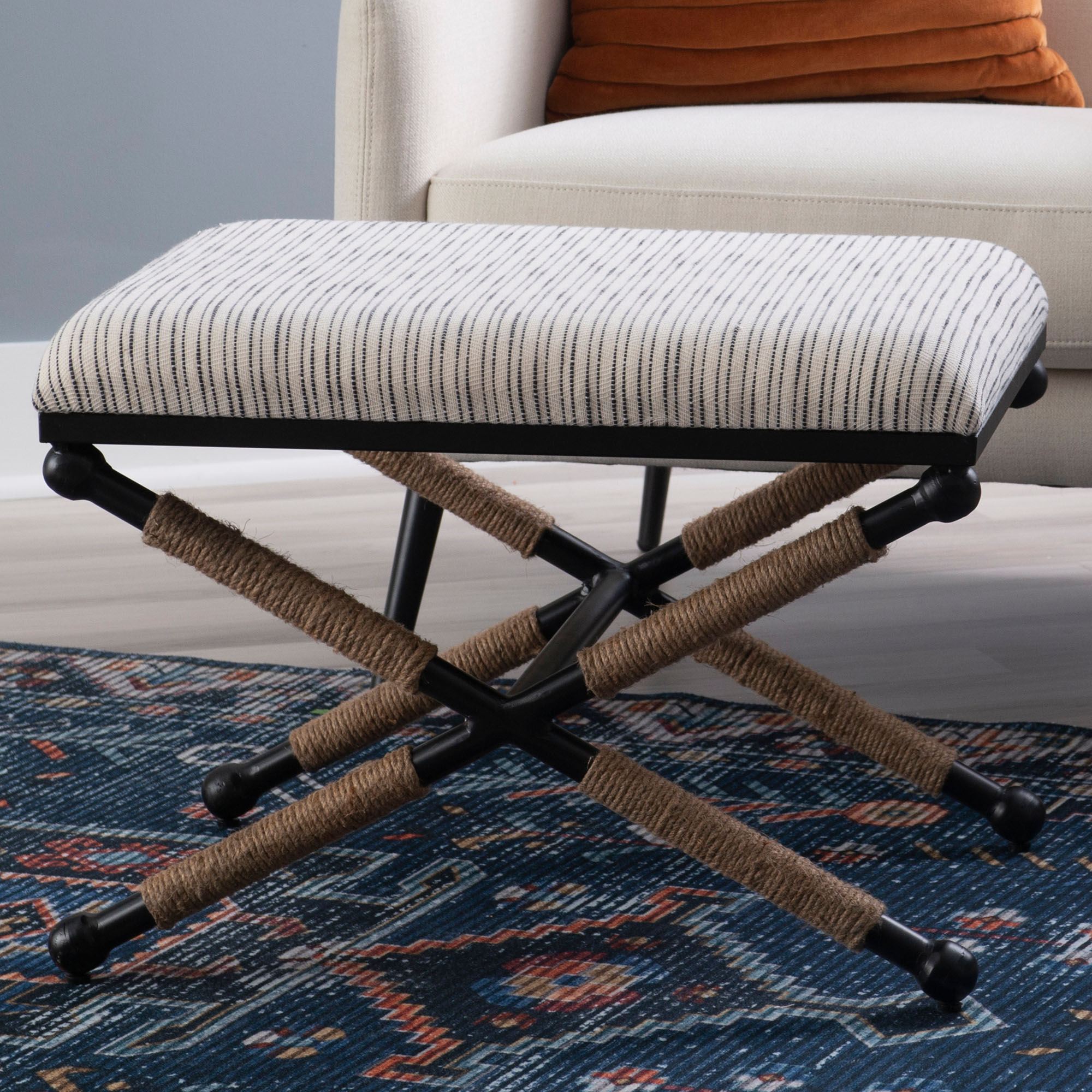 Style and comfort are just a couple of the things you will love about the Daplyn Accent Stool. This sturdy, Boho-inspired seat has an iron frame with a black powder-coat finish, rope accents, and an upholstered fabric cushion. The Black and White striped cushion is cotton; the solid Beige cushion is linen. The maximum recommended weight for the stool is 200 lbs. Measures 24"Wx18"Dx18"H; weighs 13 lbs. Fill is foam. Spot clean the fabric.