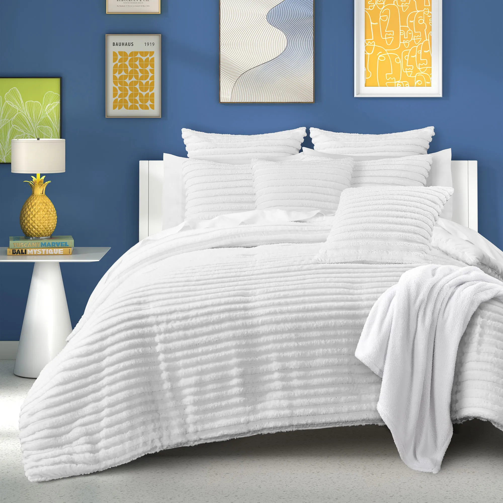 • Solid white, plush bedding