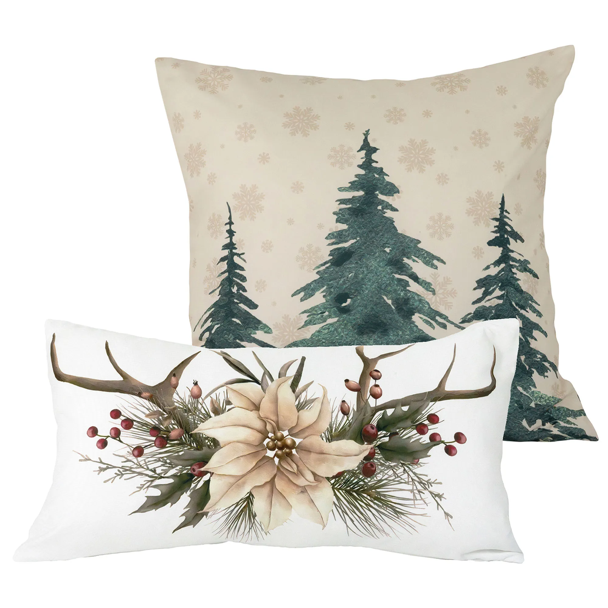 The polyester Pillow Set of Two includes one square pillow and one rectangle pillow. The tailored square pillow has printed pine trees and snowflakes on a natural background. The tailored rectangle pillow has a printed ivory poinsettia flower, holly leaves, berries, and antlers on white. Fill is polyester. Spot clean.